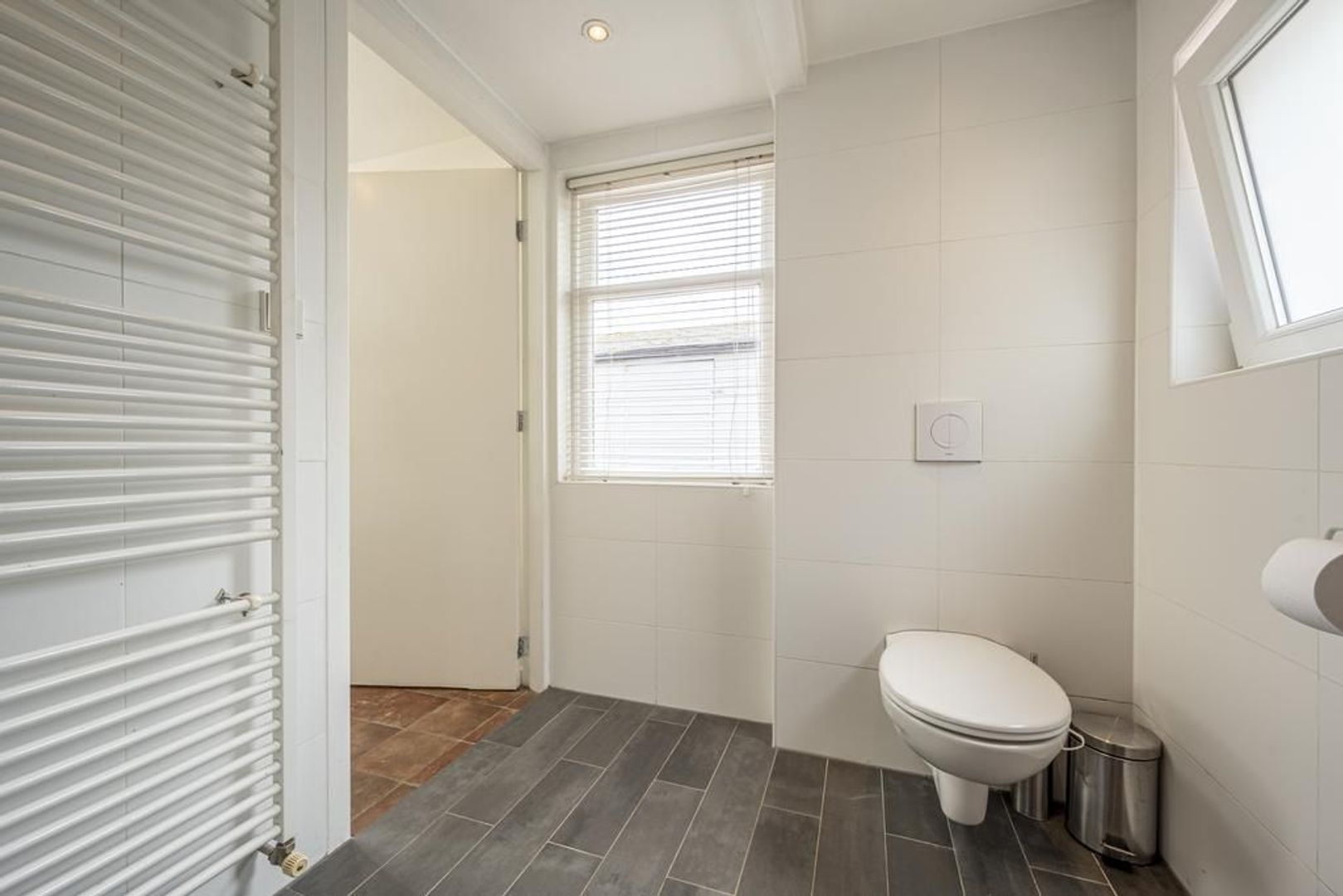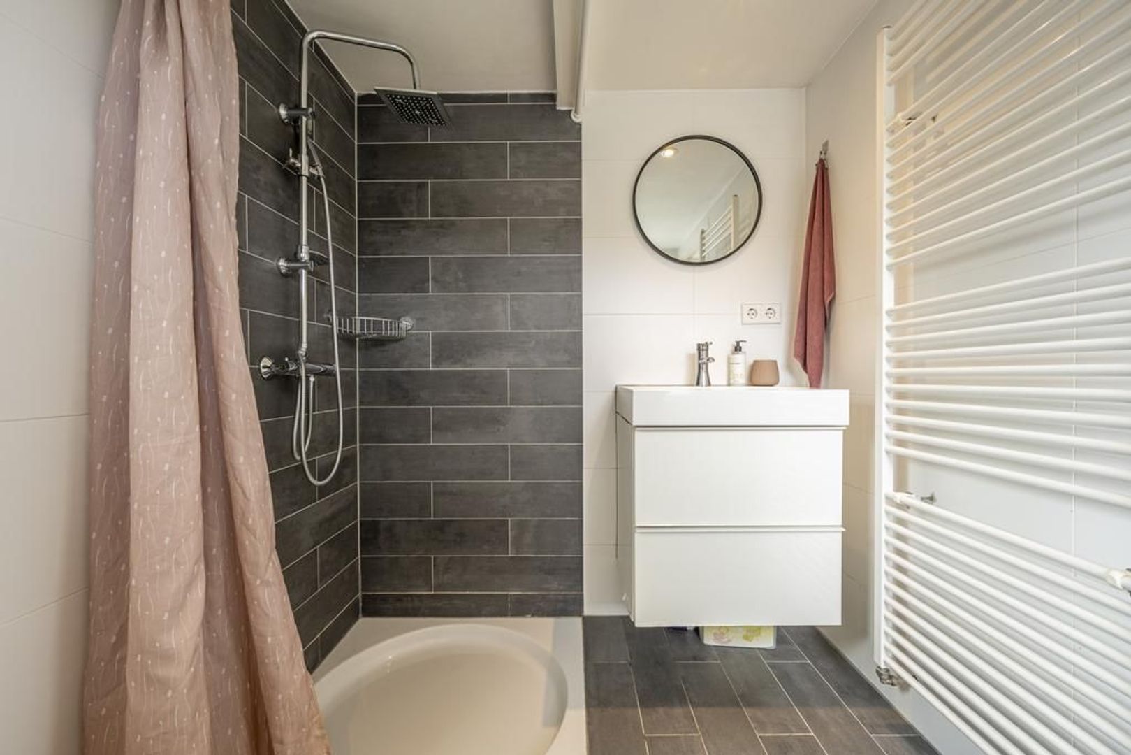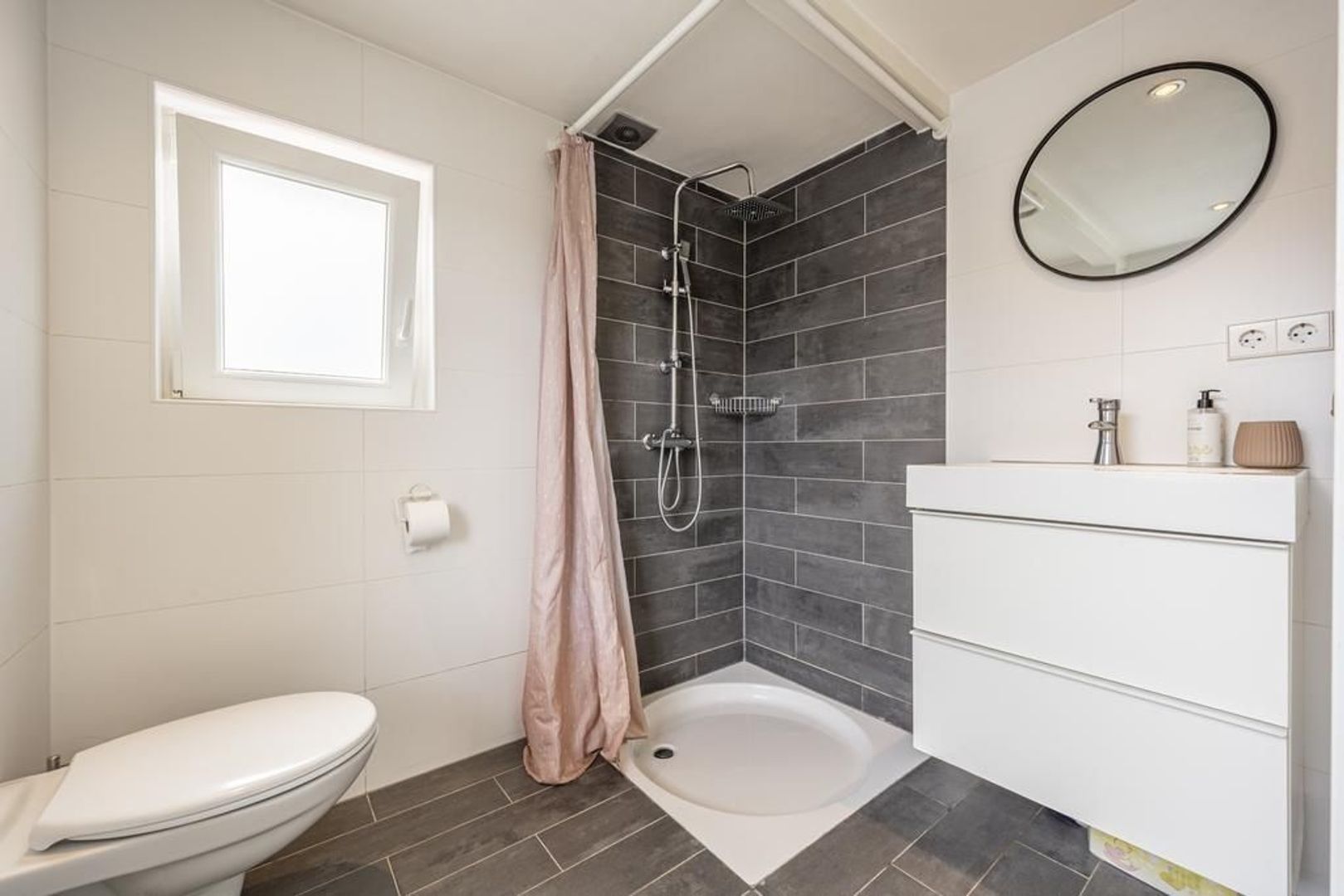 De badkamer is ingericht met een douchegelegenheid, een wastafelmeubel en een wandtoilet. Boven de badkamer is een bergvliering, die via de keuken te bereiken is.