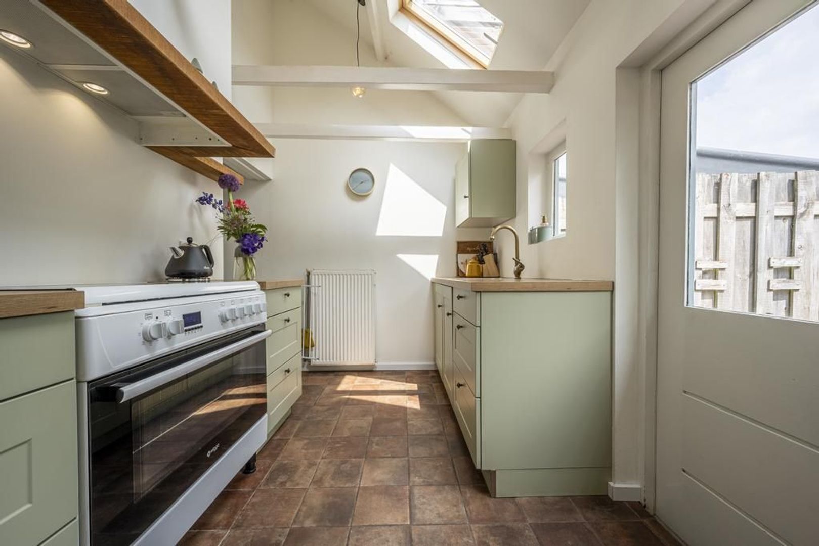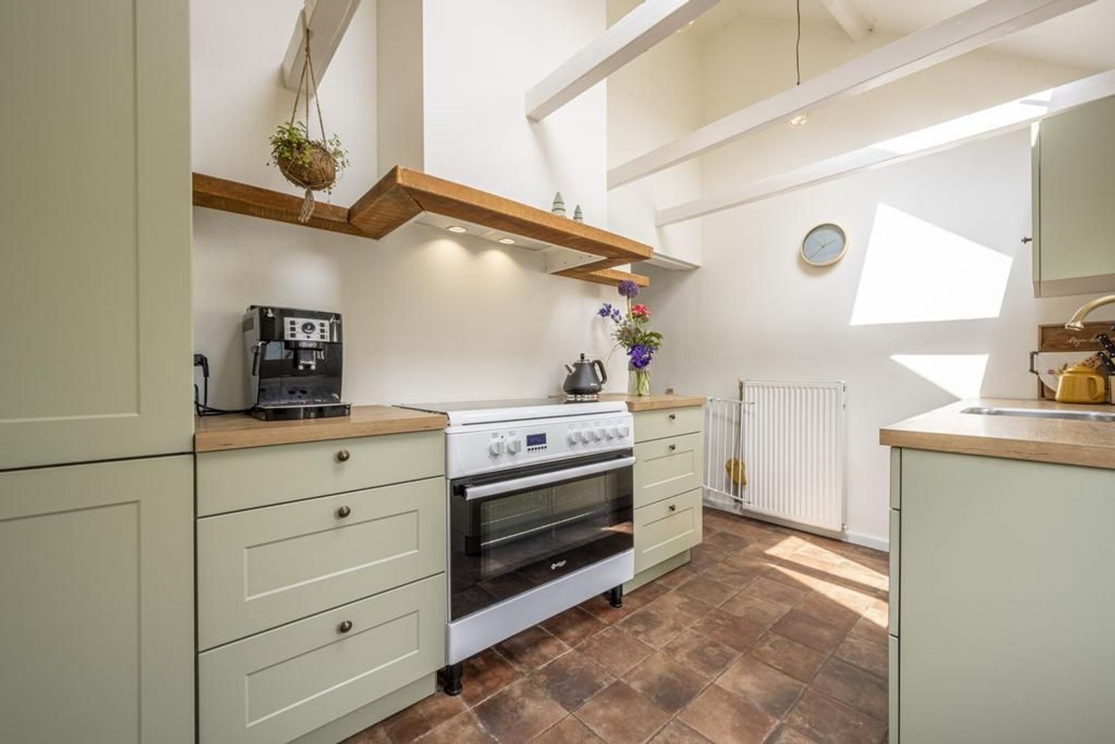 De Nolte keuken is van 2020, is uitgevoerd in een landelijke, zachtgroene kleur en is voorzien van een koel-vriescombinatie, 5 pits gasfornuis met oven, een afzuigkap en een wasmachine (blijft achter). De vloer is afgewerkt met een tegelvloer.
