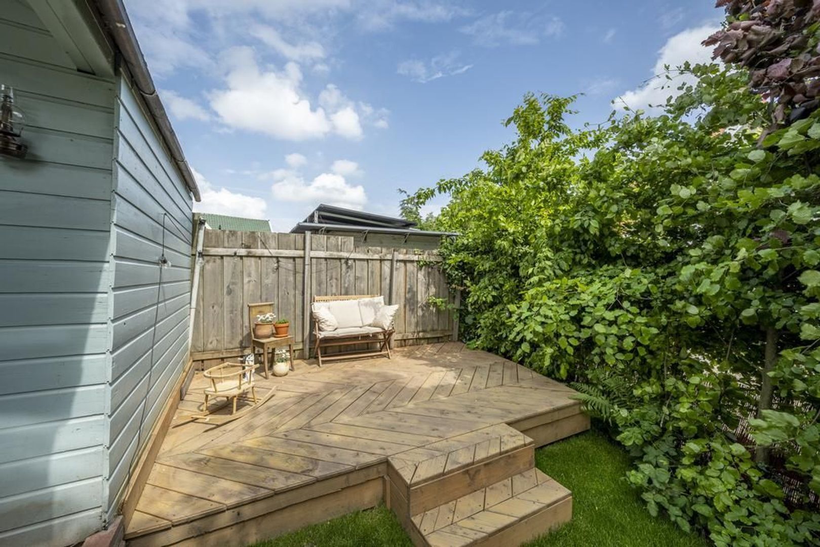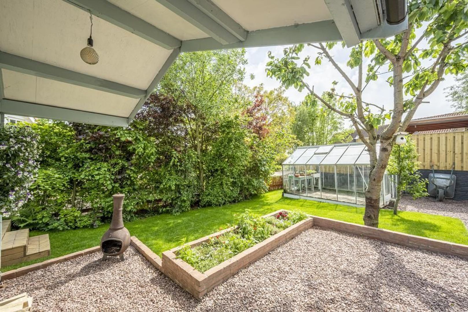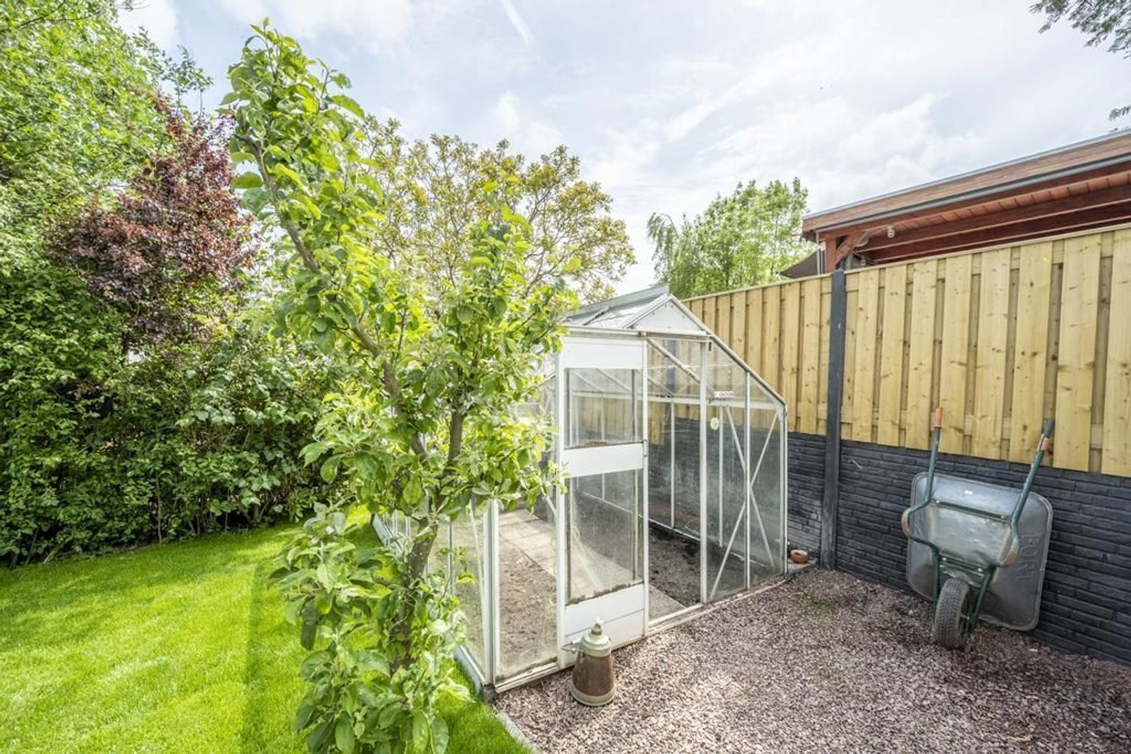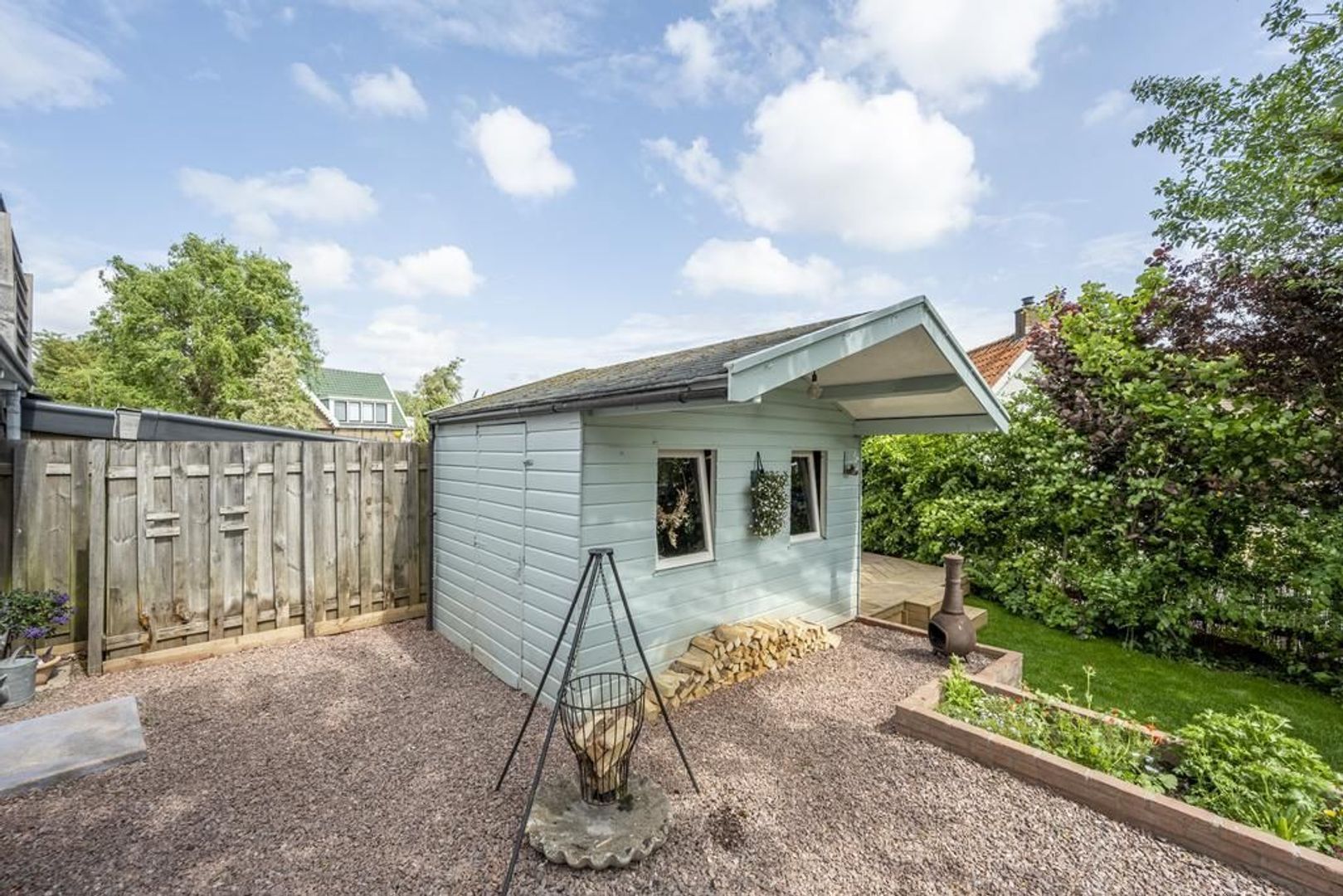 De achtertuin is mooi aangelegd met onder andere diverse terrassen, een houten berging (met aansluiting voor wasdroger) en een plantenkasje.