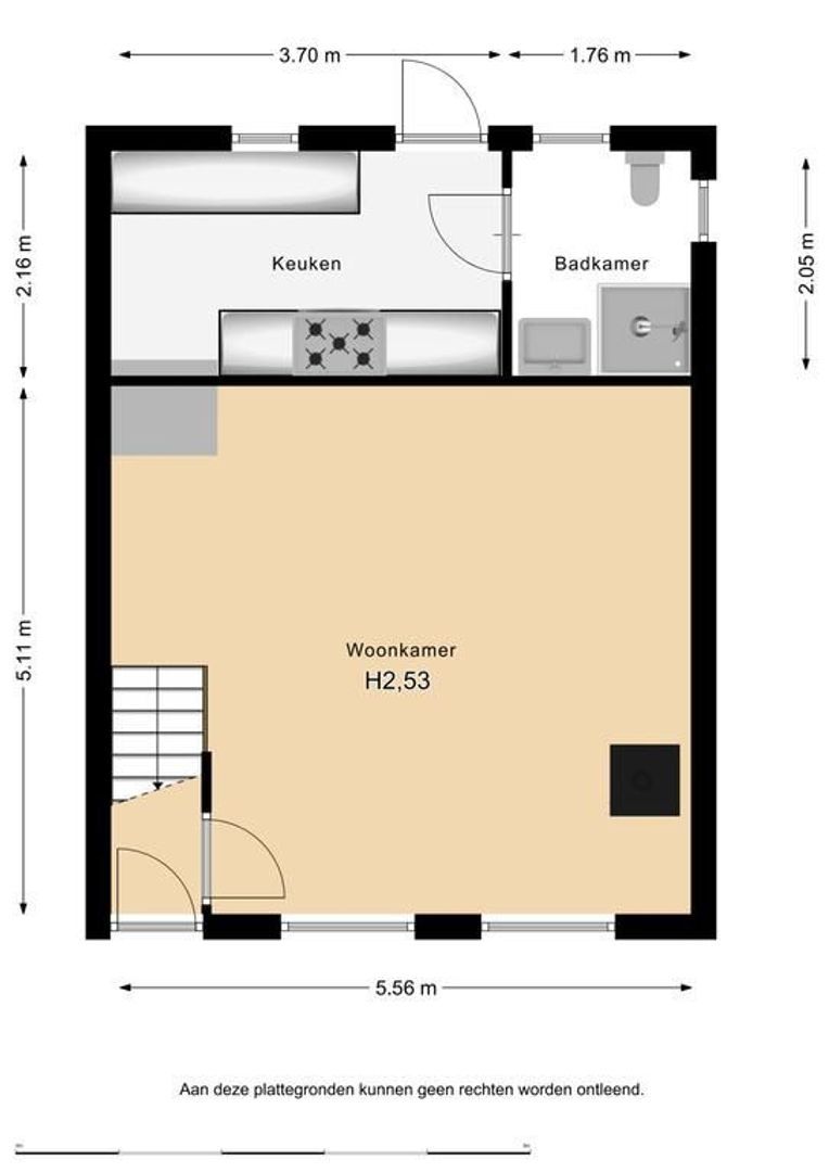 Een trapje van een paar treden leidt naar de achterkant, waar zich de halfopen keuken en badkamer bevinden.