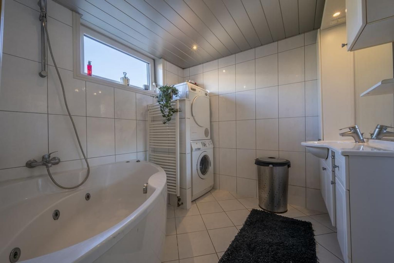 Een aparte toiletruimte en de badkamer bevinden zich eveneens op de begane grond. De badkamer is ingericht met een halfrond ligbad met jetstreams. Daarnaast is er ruimte voor een wastafelmeubel en de wasapparatuur.