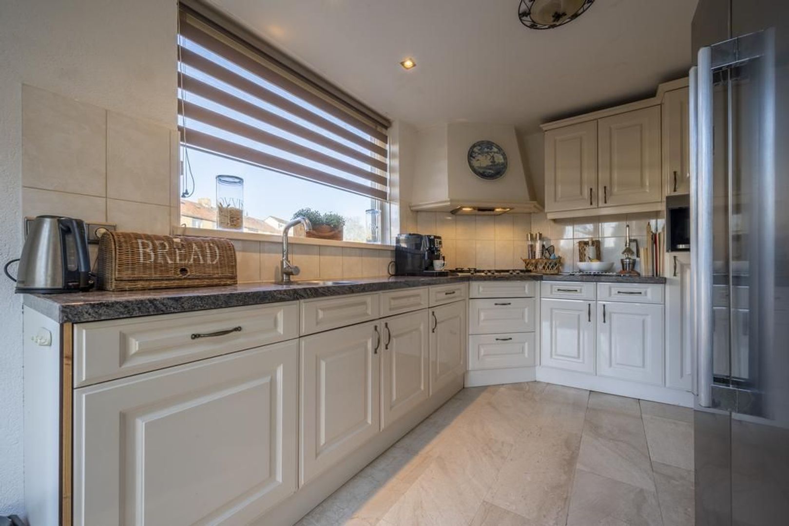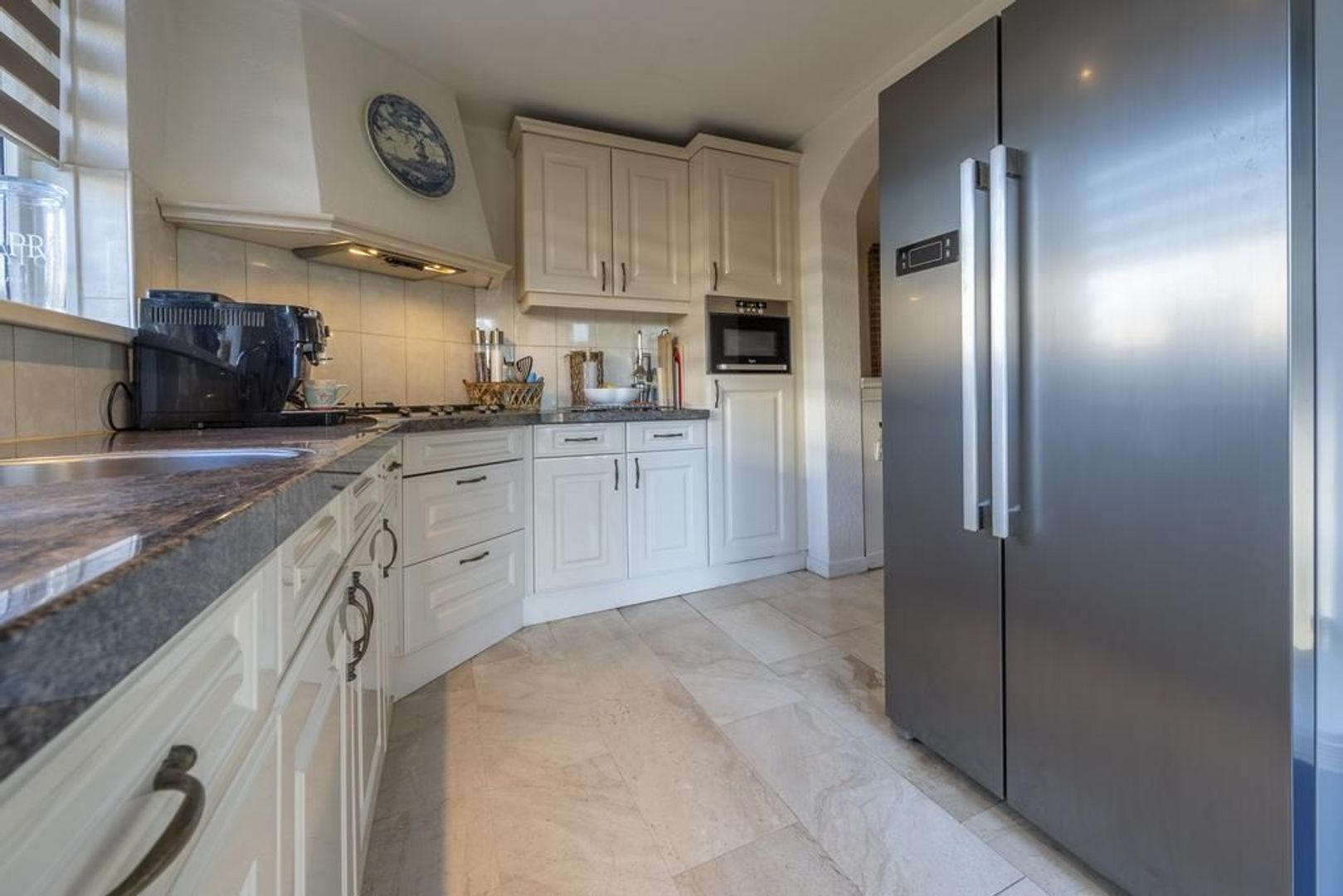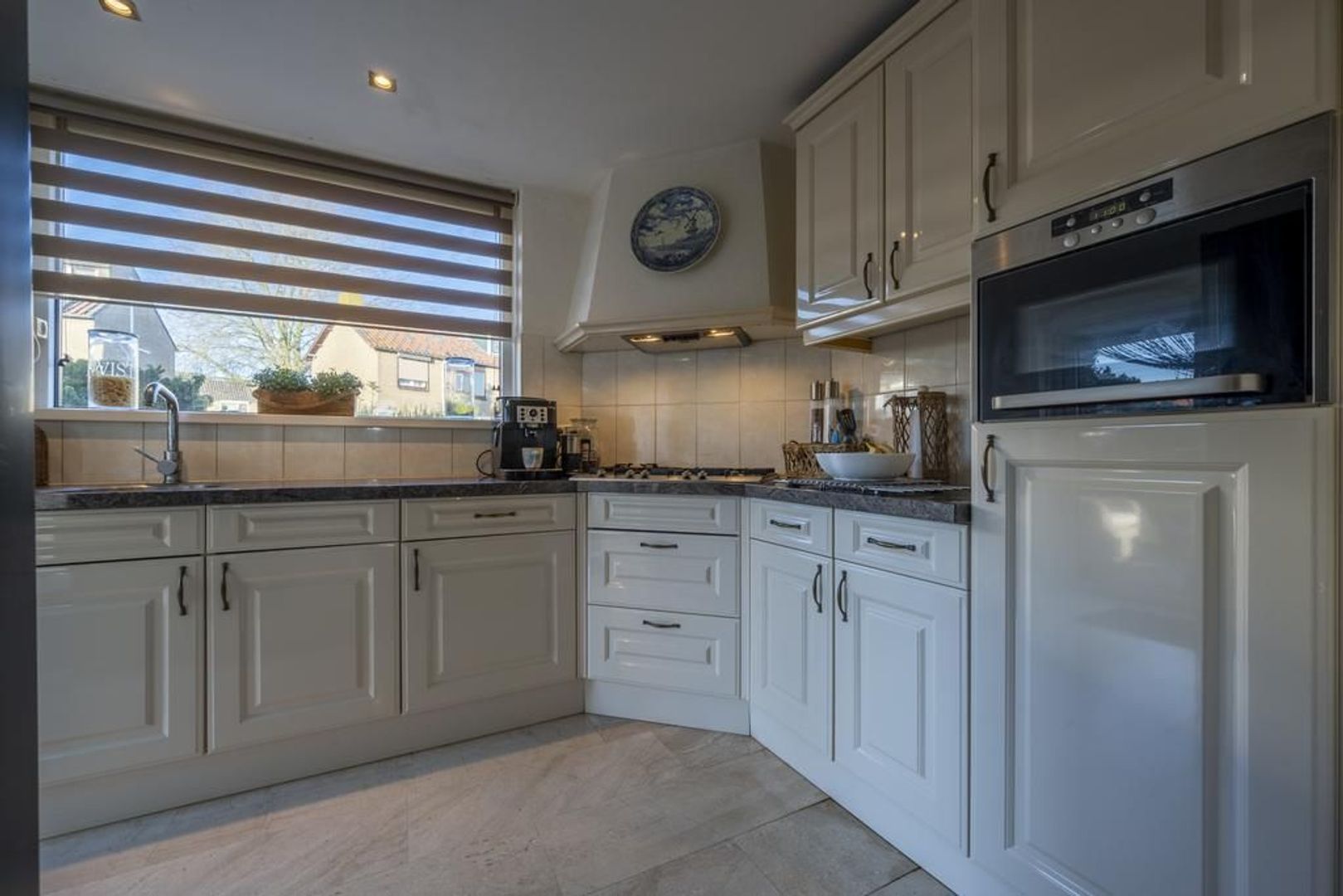 De keukeninrichting is hoekopgesteld en uitgevoerd met een mooi granieten aanrechtblad en de volgende inbouwapparatuur: 5-pits gaskookplaat, afzuigkap, vaatwasser en koel-vriescombinatie.