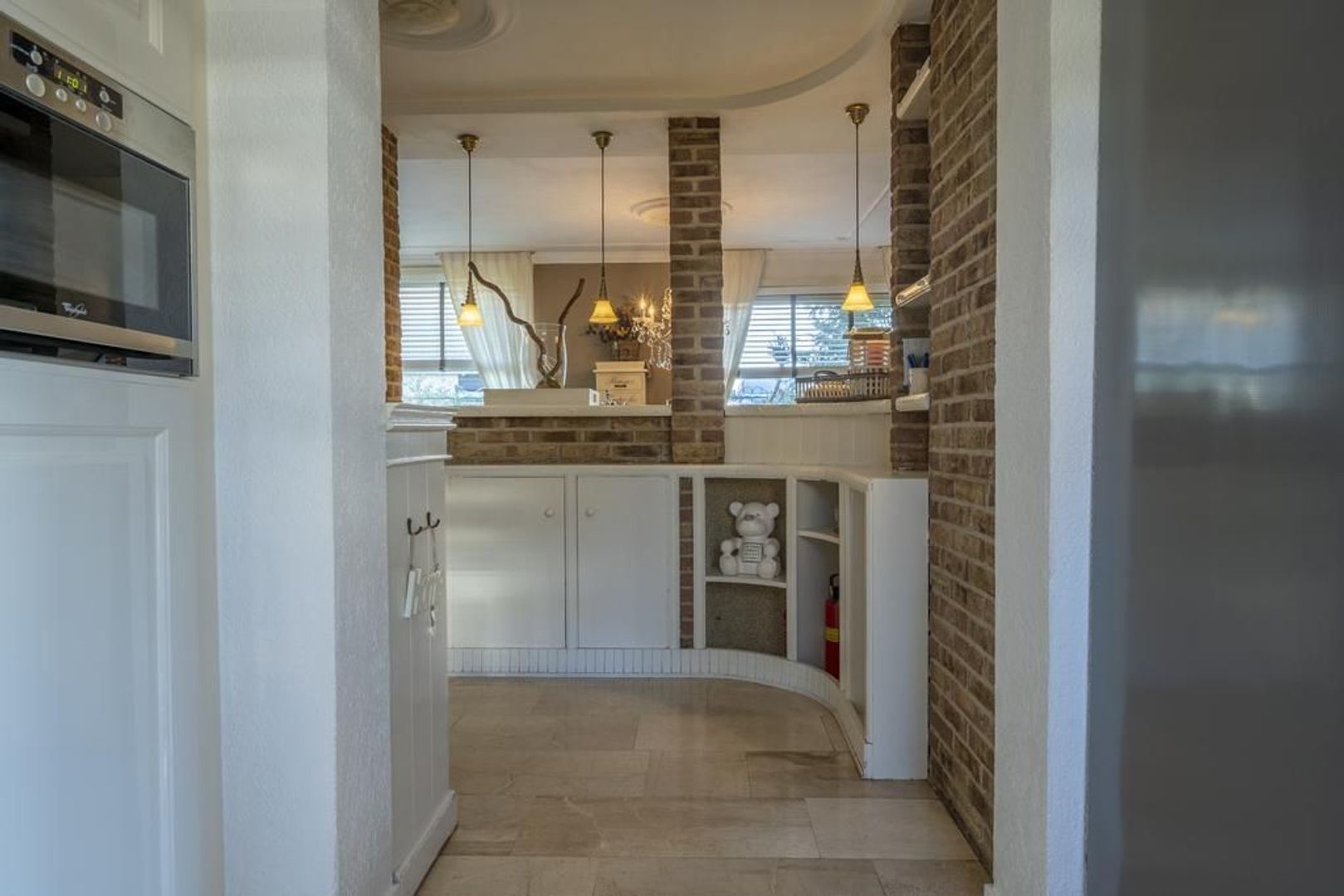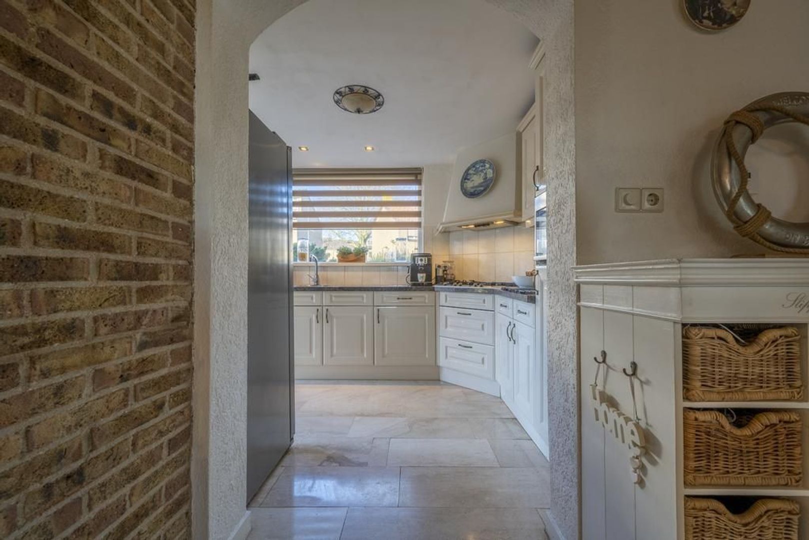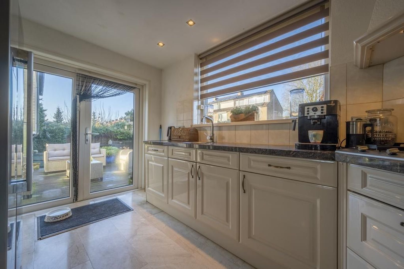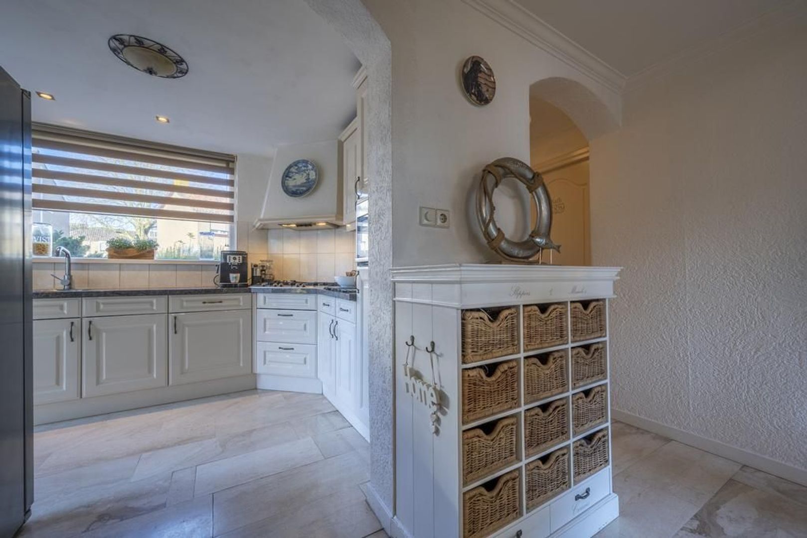 De keukeninrichting is hoekopgesteld en uitgevoerd met een mooi granieten aanrechtblad en de volgende inbouwapparatuur: 5-pits gaskookplaat, afzuigkap, vaatwasser en koel-vriescombinatie.