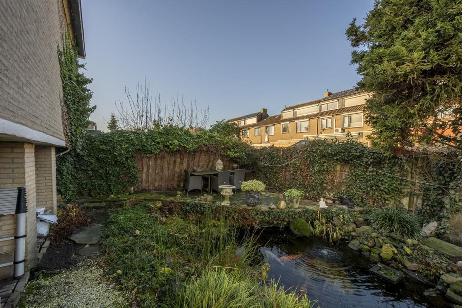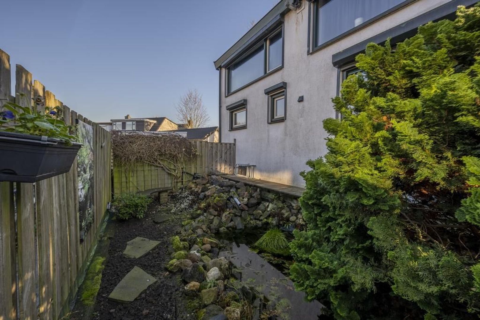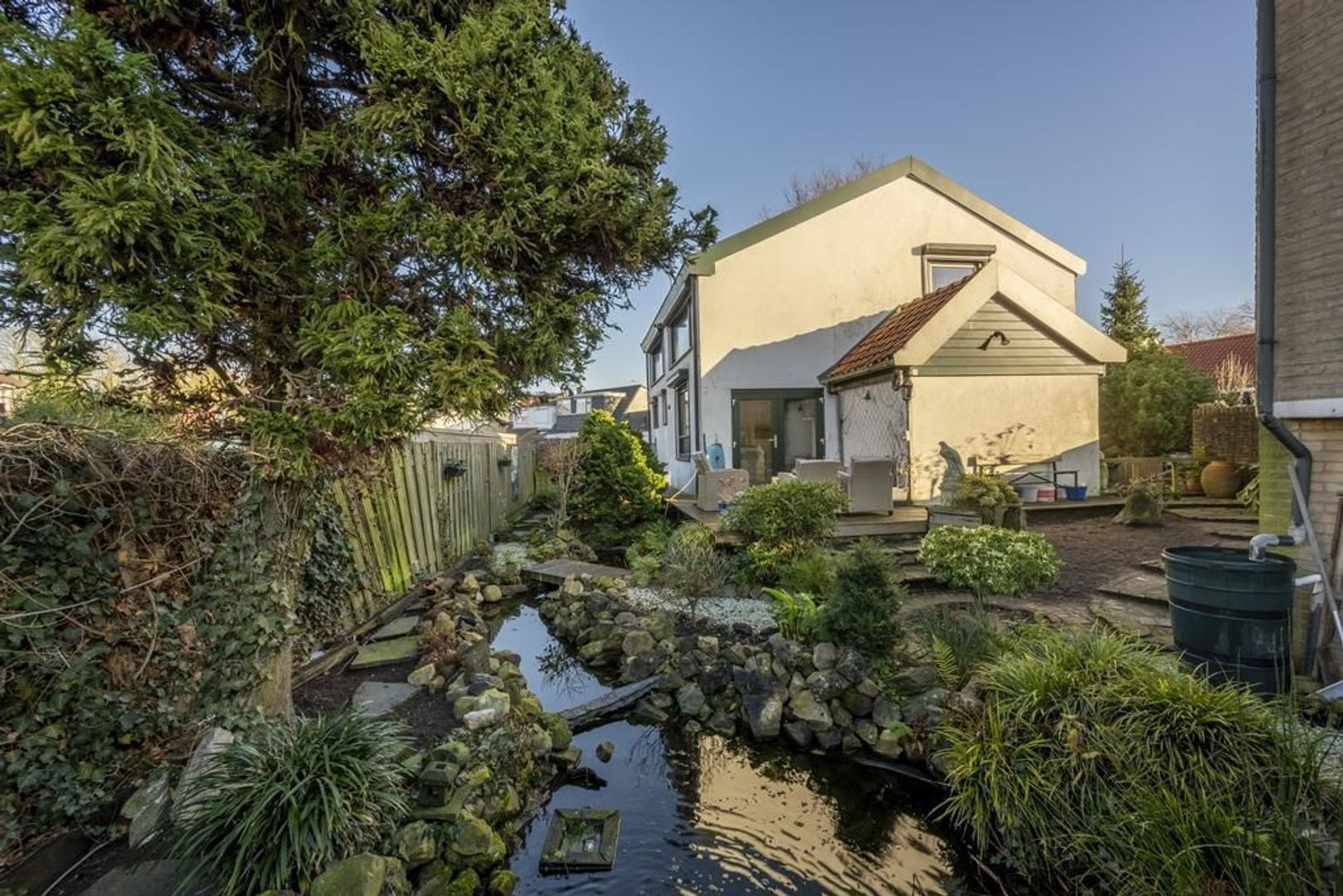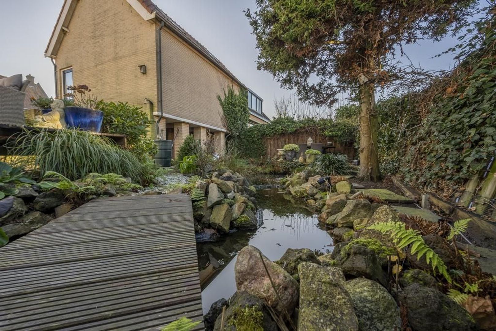 De siertuin ligt achter de woning en bestaat onder andere uit een terras en een siertuin in Japanse stijl met vijverpartij.