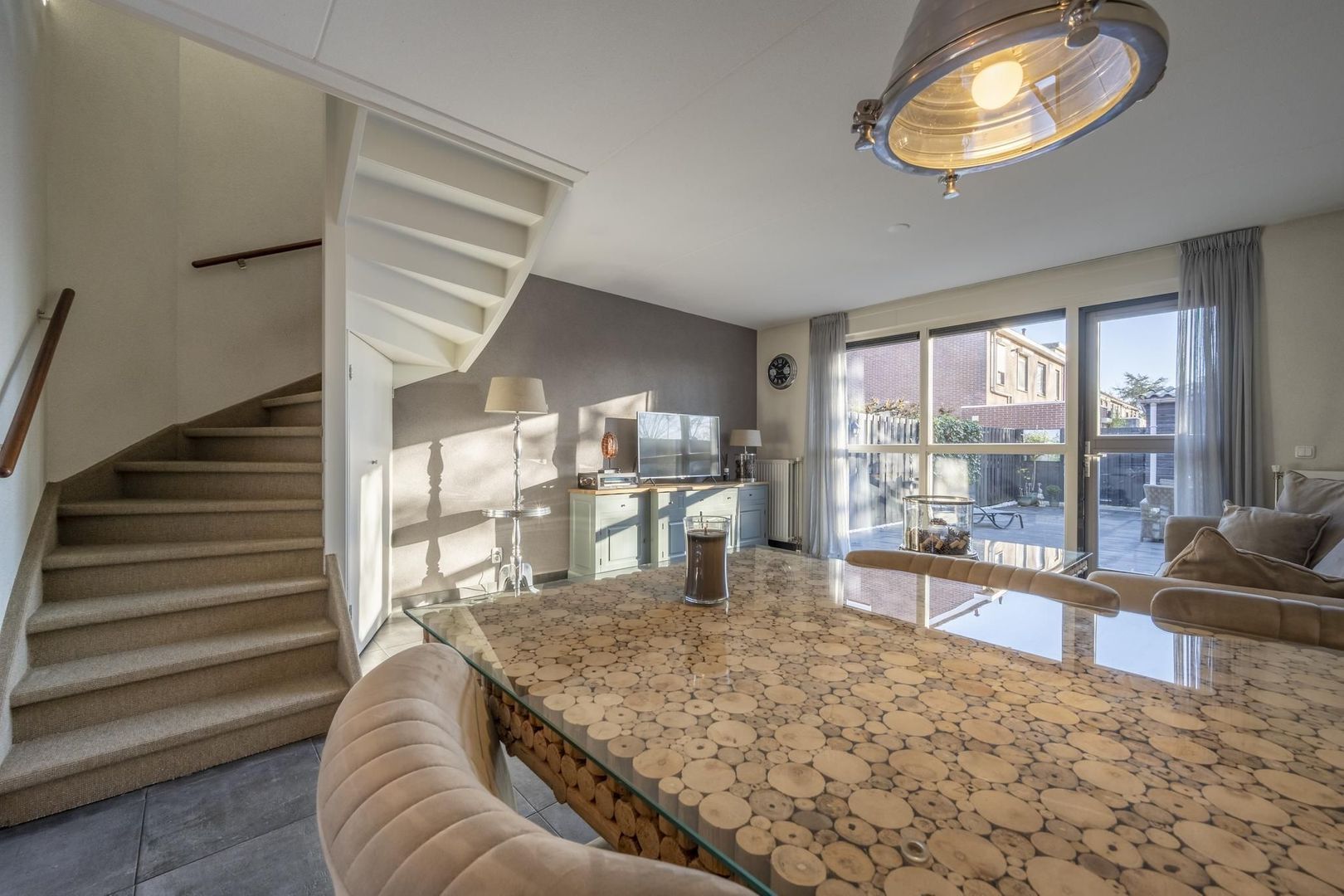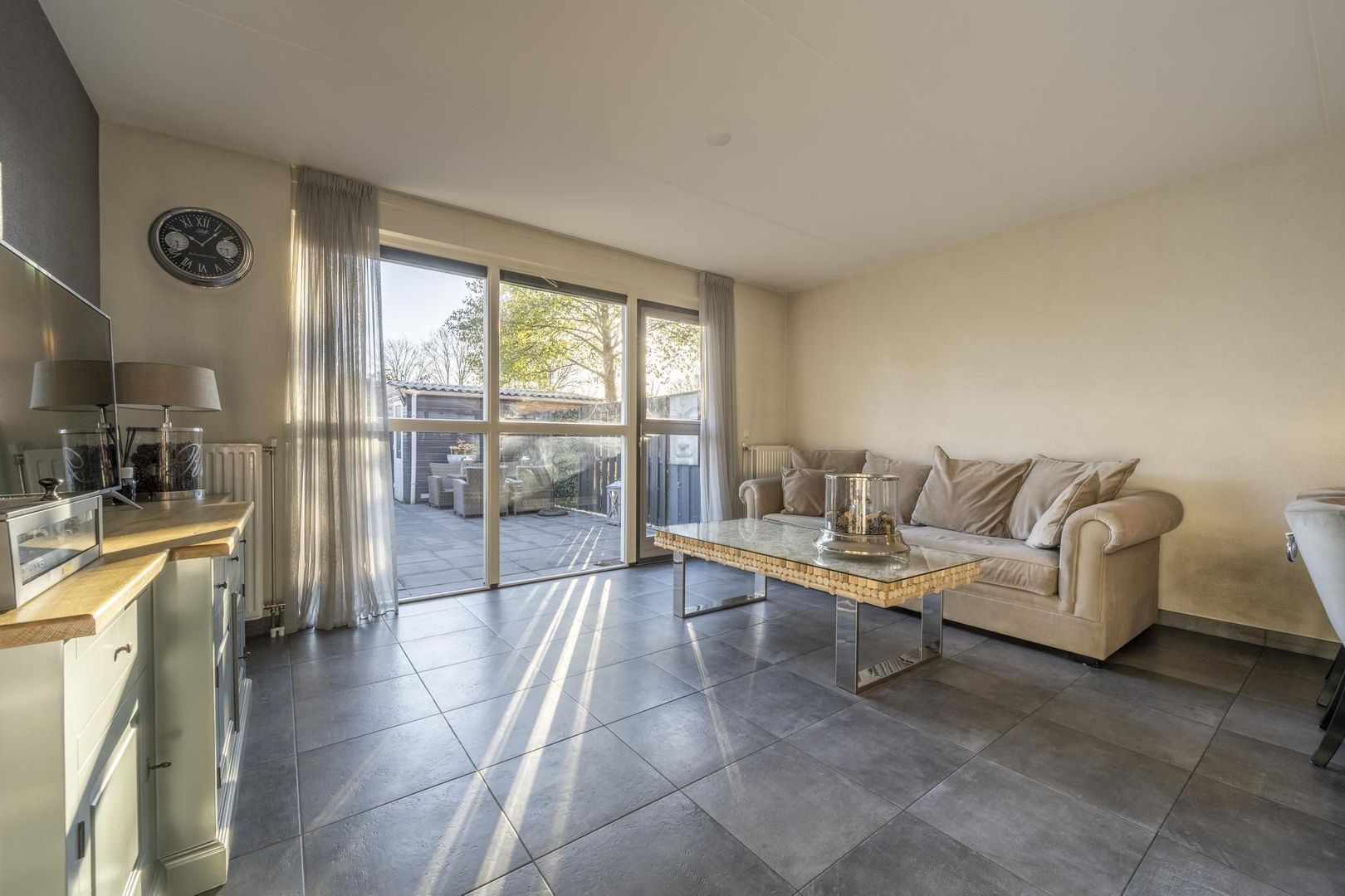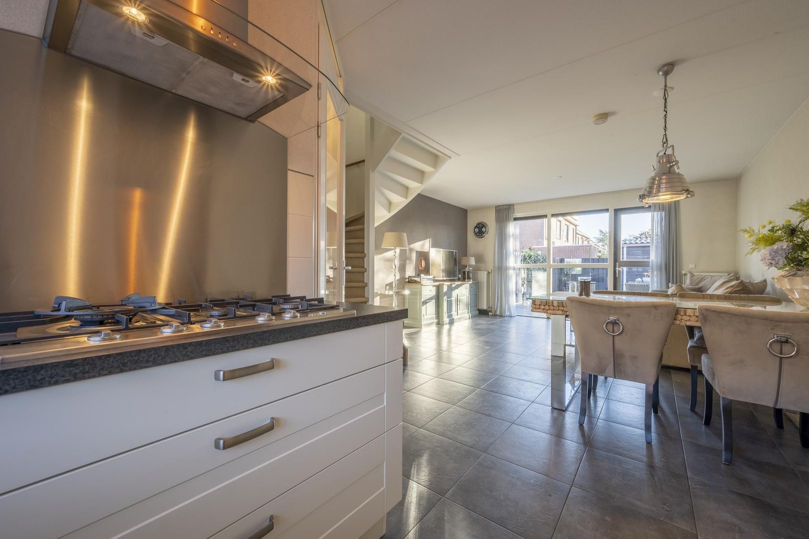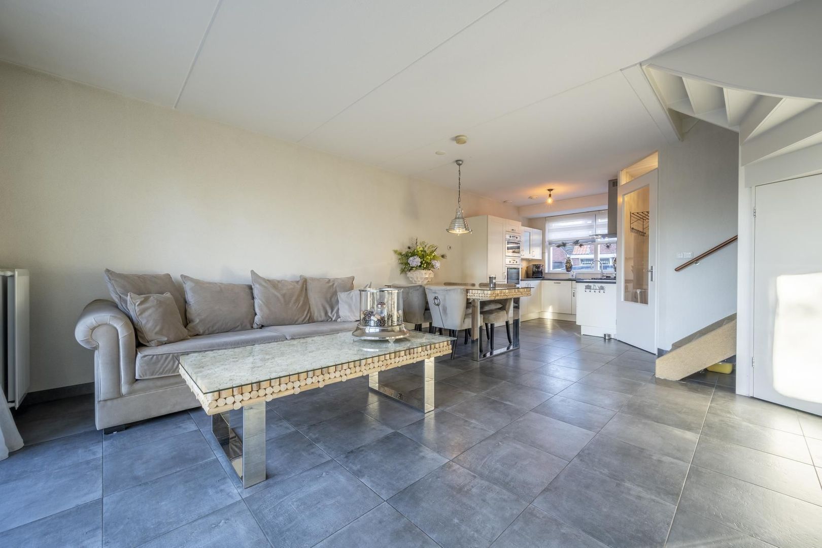 Tuingerichte woonkamer met deur naar het terras. Open keuken aan de straatkant, voorzien van een U-vormige inrichting in landelijke stijl. Deze is voorzien van een koel-vriescombinatie, vijfpits gaskookplaat, afzuigkap, magnetron, oven, vaatwasser en een handige Quooker voor direct heet water.