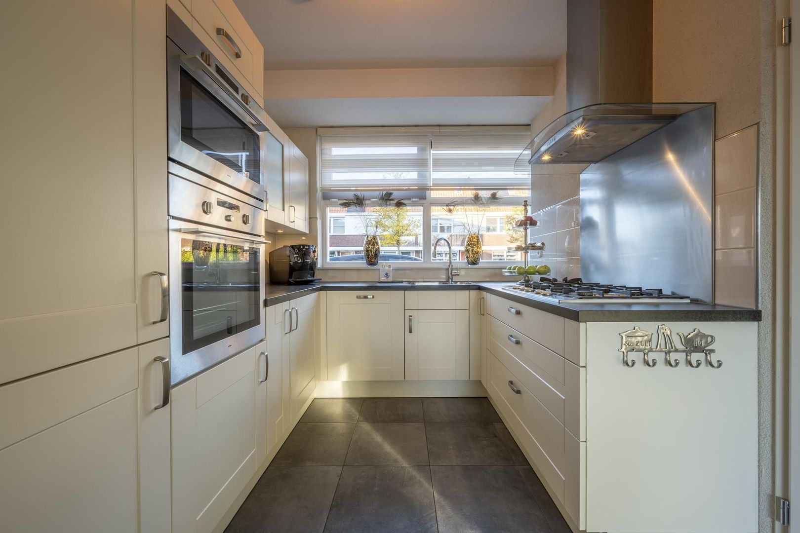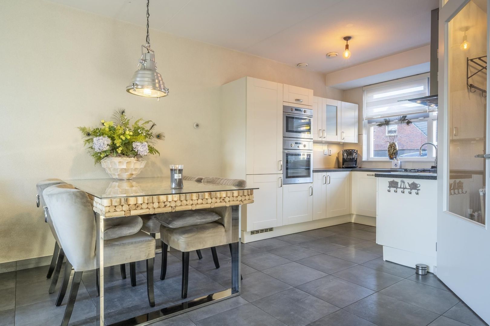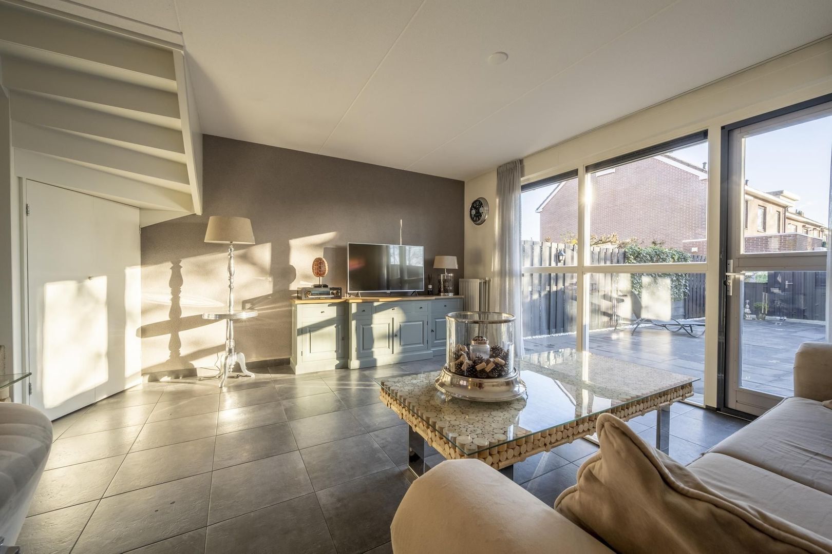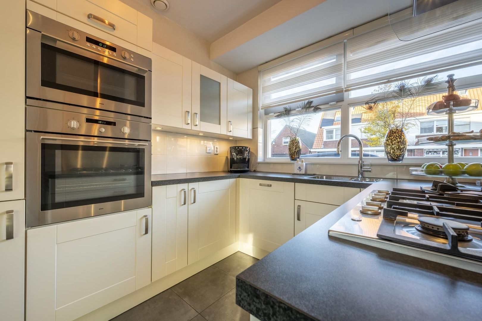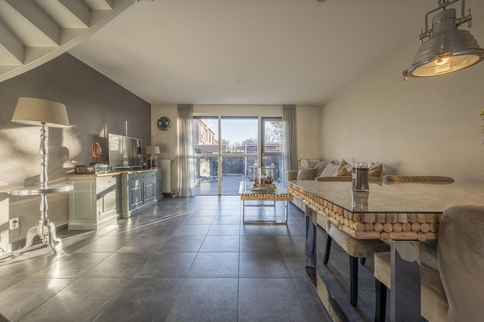 Tuingerichte woonkamer met deur naar het terras. Open keuken aan de straatkant, voorzien van een U-vormige inrichting in landelijke stijl. Deze is voorzien van een koel-vriescombinatie, vijfpits gaskookplaat, afzuigkap, magnetron, oven, vaatwasser en een handige Quooker voor direct heet water.