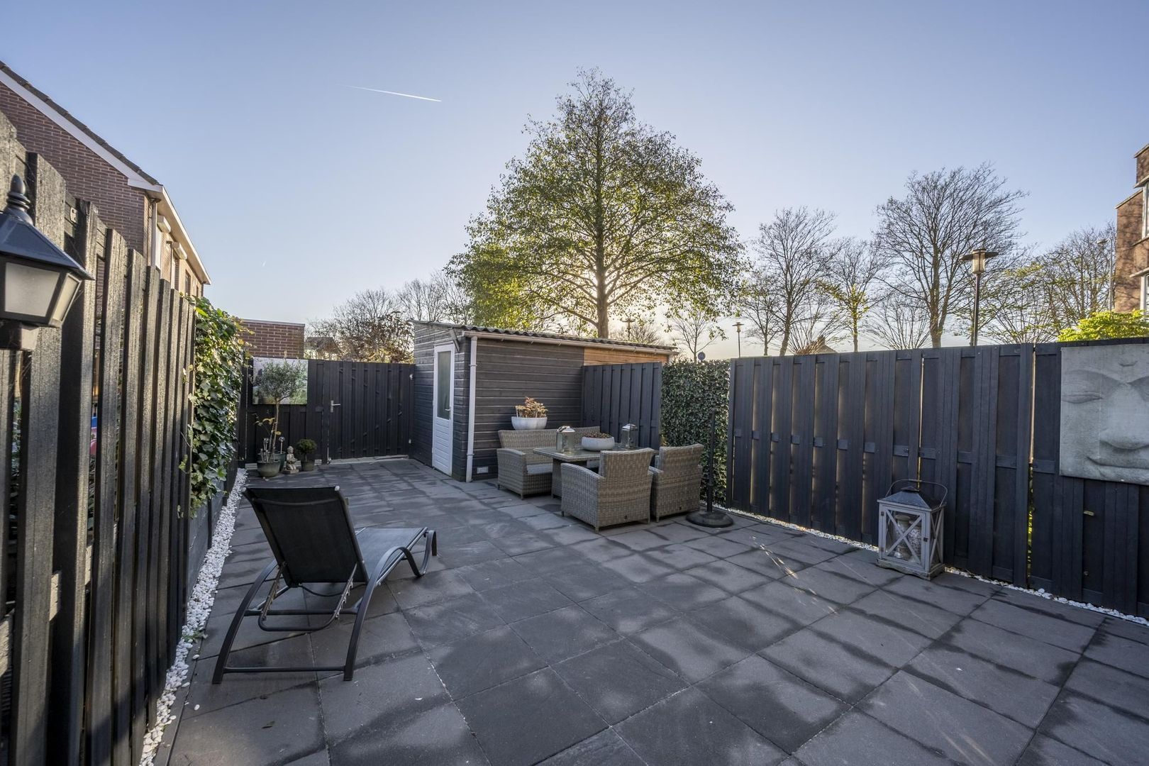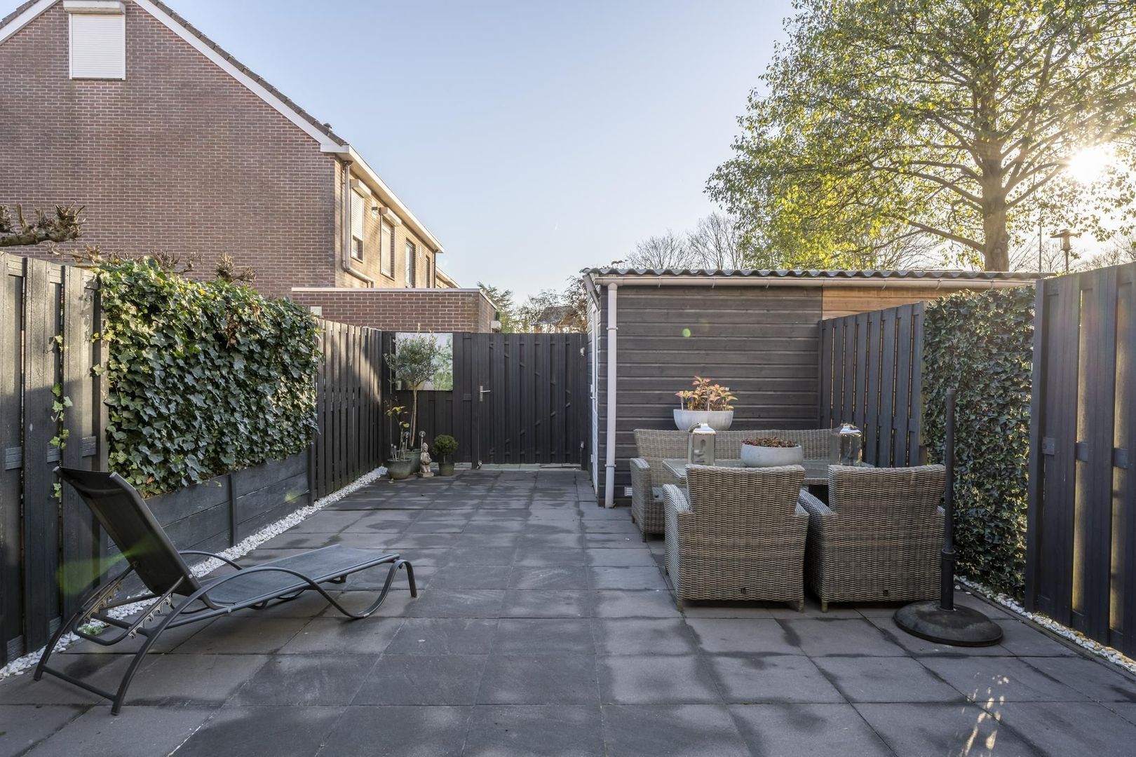 De achtertuin ligt op het oosten. Deze is onderhoudsvriendelijk ingericht. Achterin staat een houten berging.