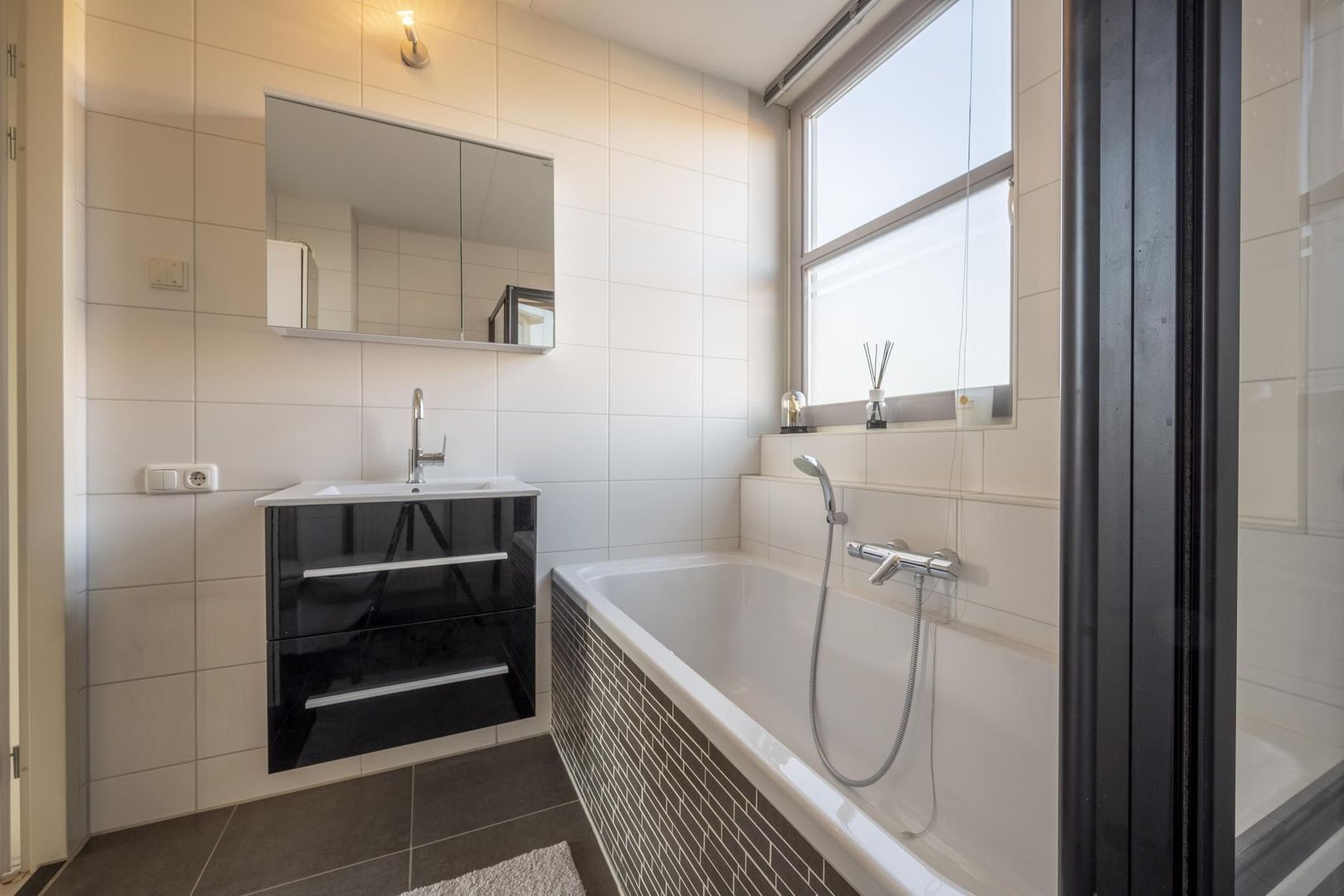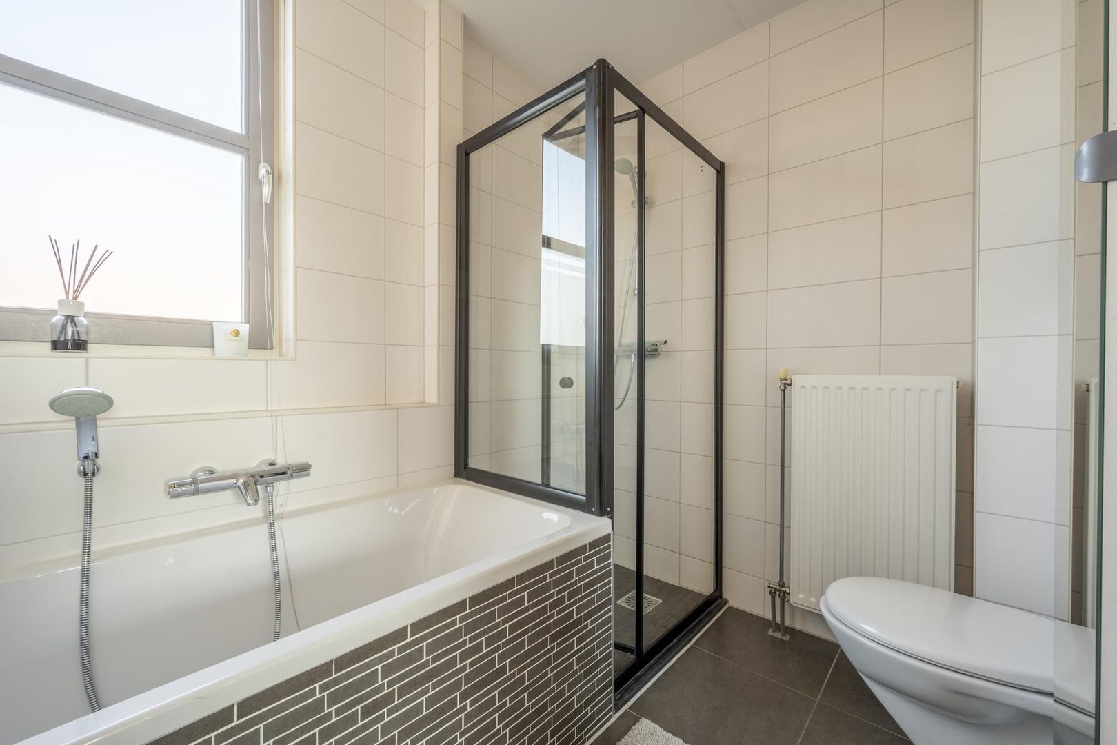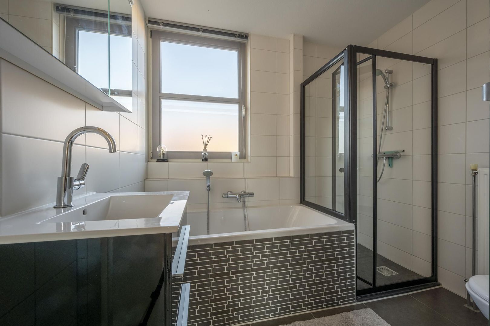 De moderne badkamer is ingericht met een doucheruimte, een ligbad, wastafelmeubel en een tweede toilet. De vloer is voorzien van comfortabele vloerverwarming.
