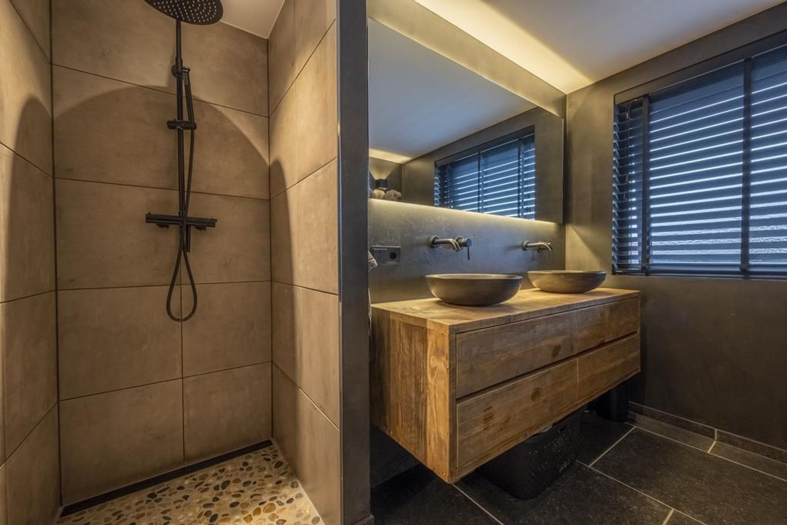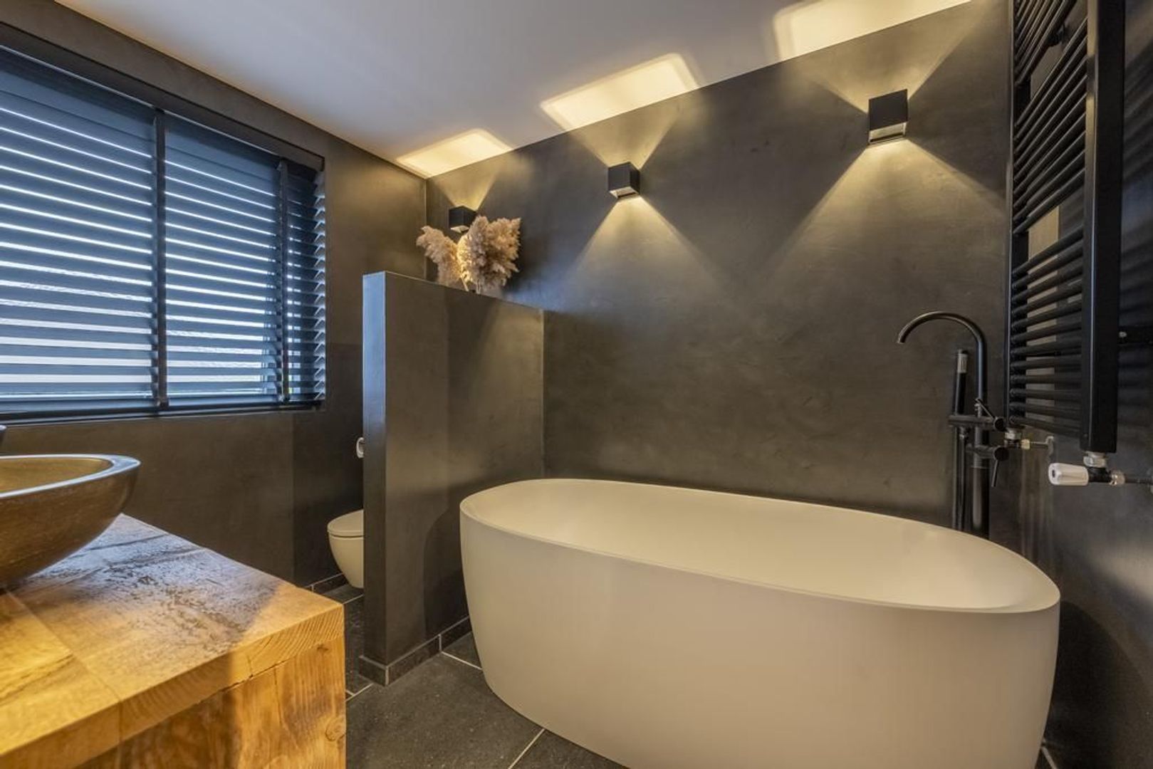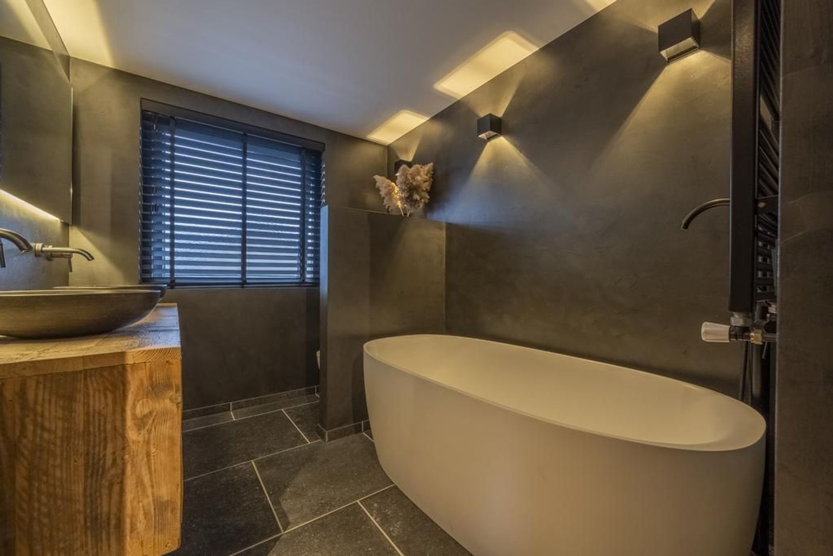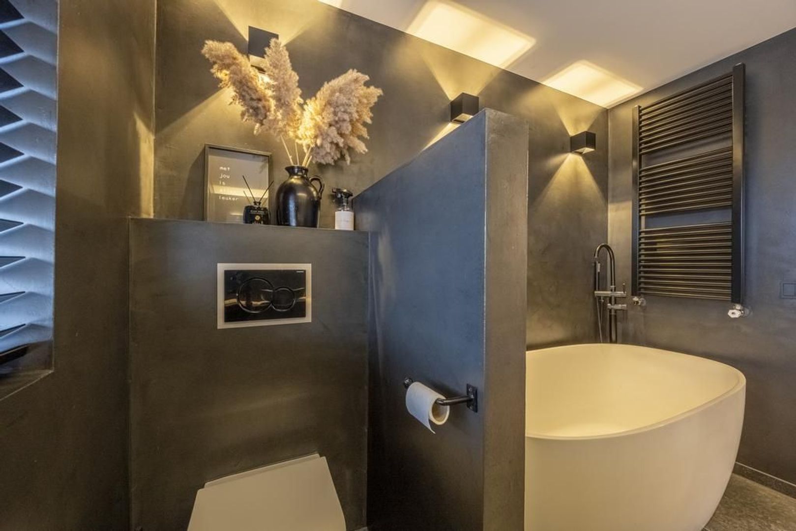 De grote, luxe badkamer is uitgevoerd met betonlook stucwanden, een prachtig vrijstaand ligbad, een inloopdouche met regendouche, een wandtoilet en een badmeubel met twee losse kommen. De ruimte is voorzien van een raam dat open kan; altijd prettig in de badkamer.