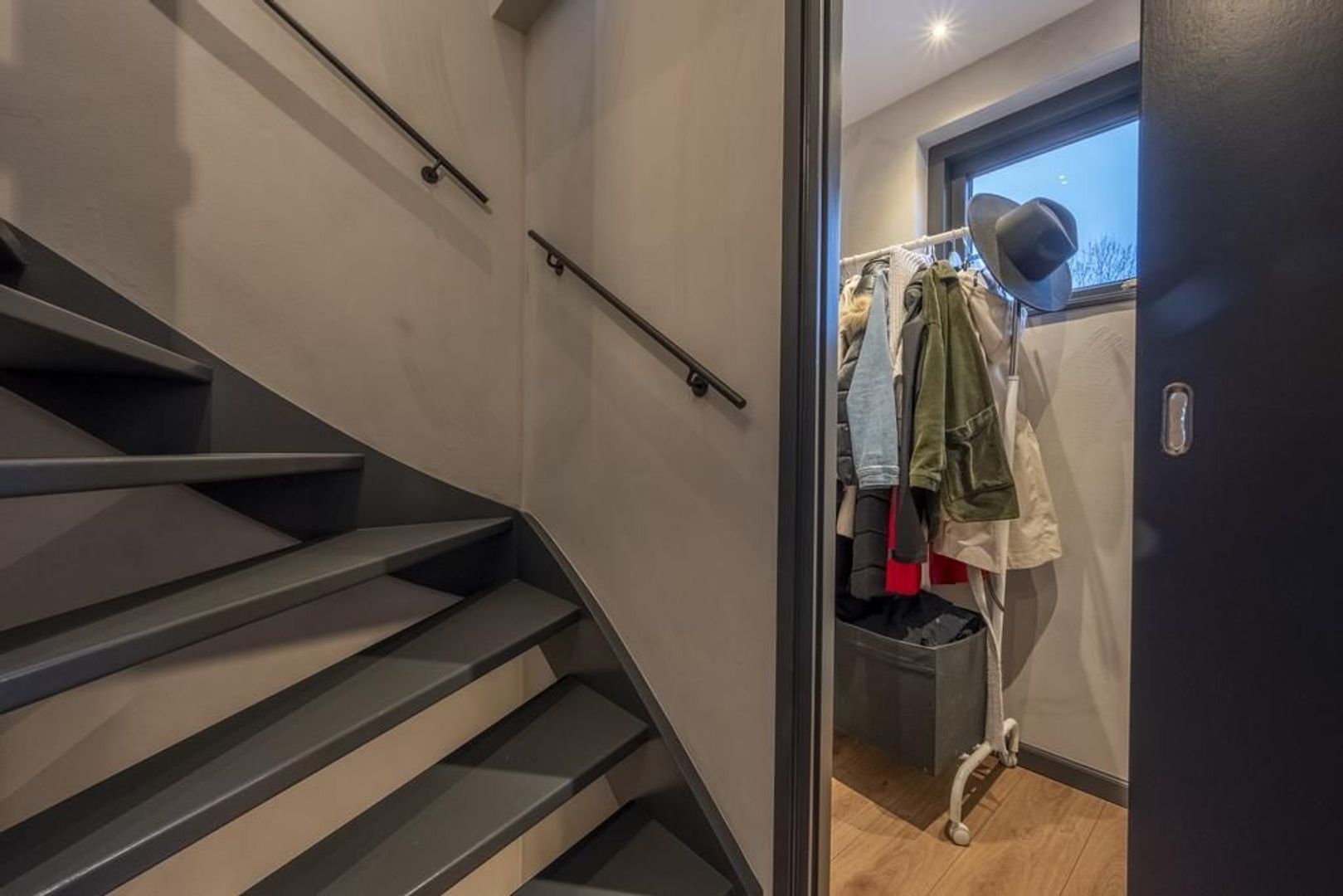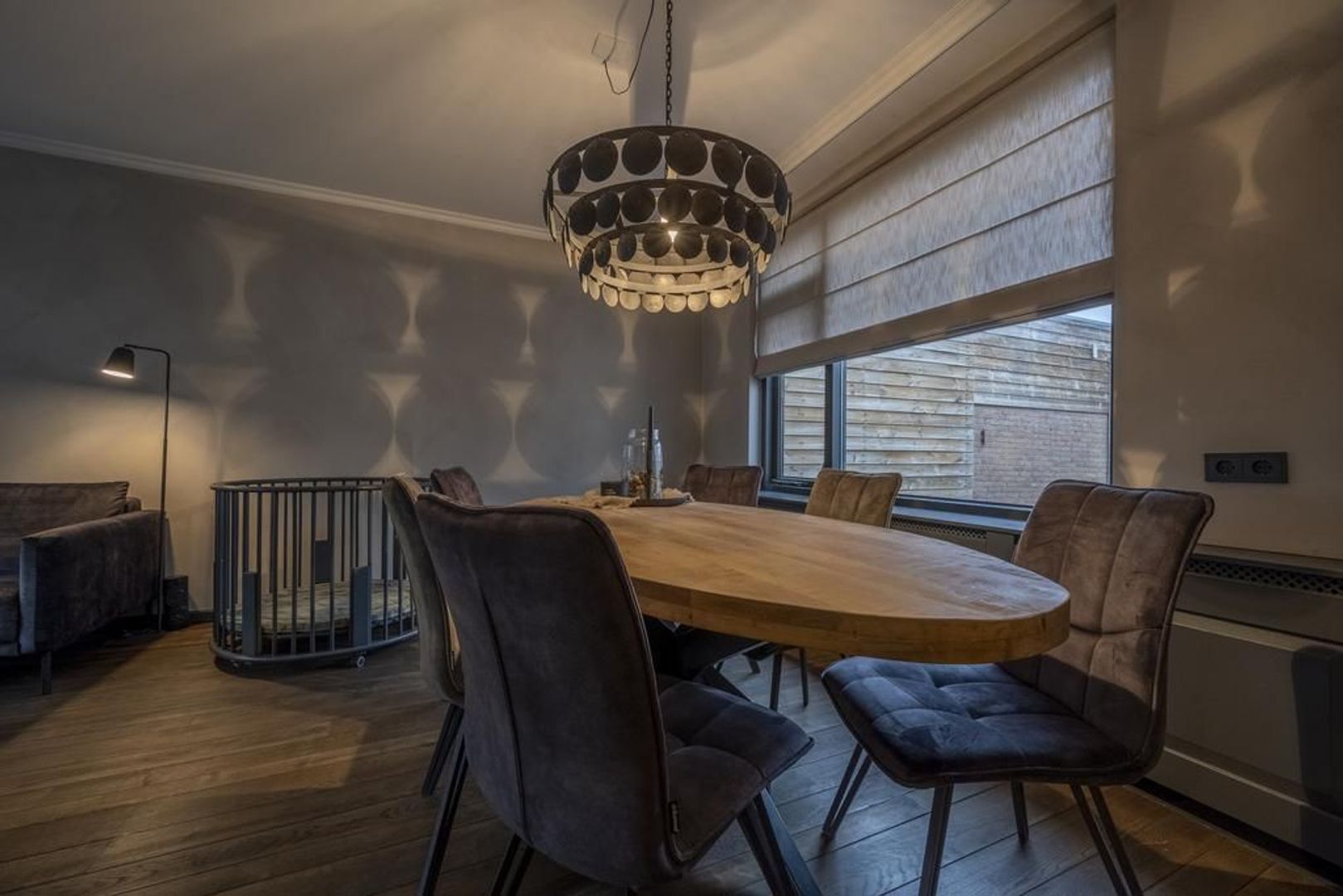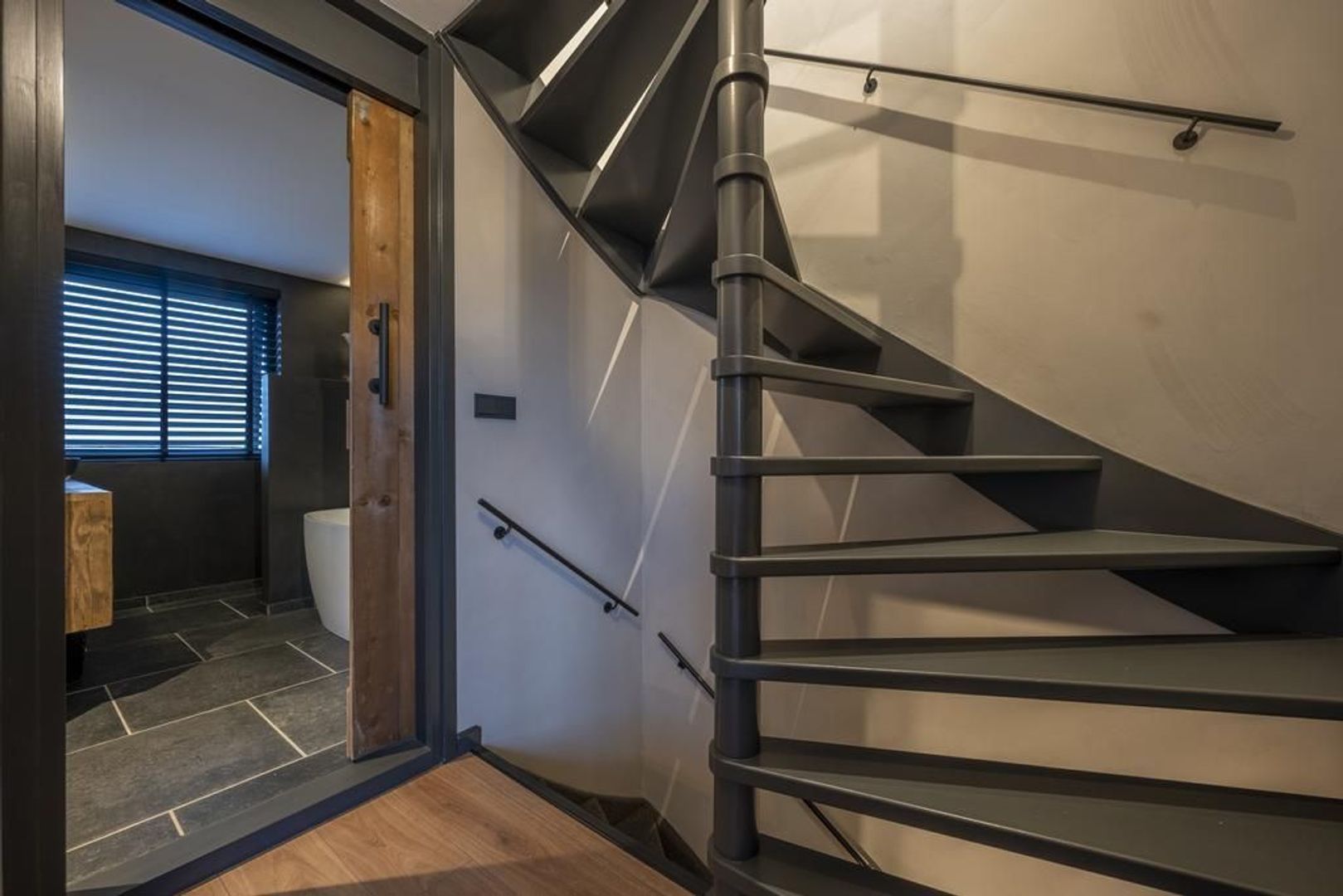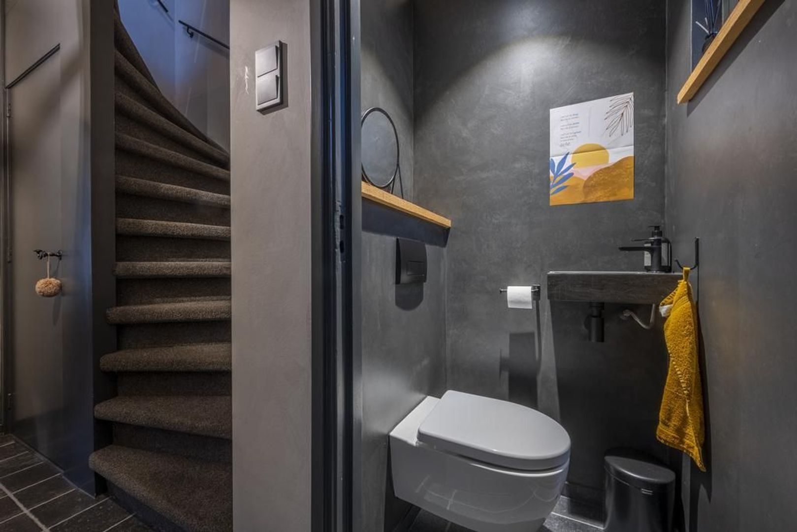 De grote, luxe badkamer is uitgevoerd met betonlook stucwanden, een prachtig vrijstaand ligbad, een inloopdouche met regendouche, een wandtoilet en een badmeubel met twee losse kommen. De ruimte is voorzien van een raam dat open kan; altijd prettig in de badkamer.