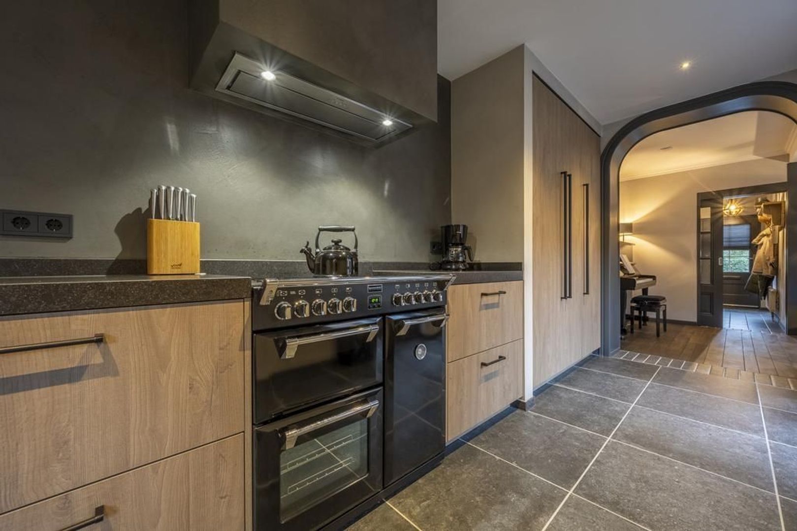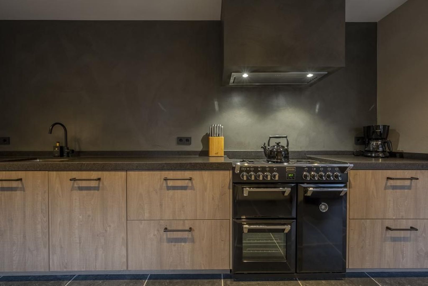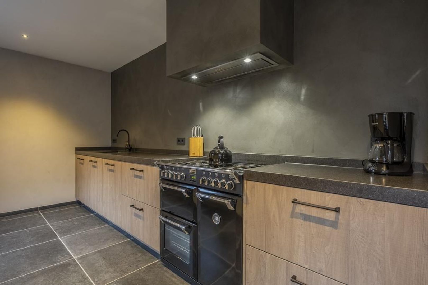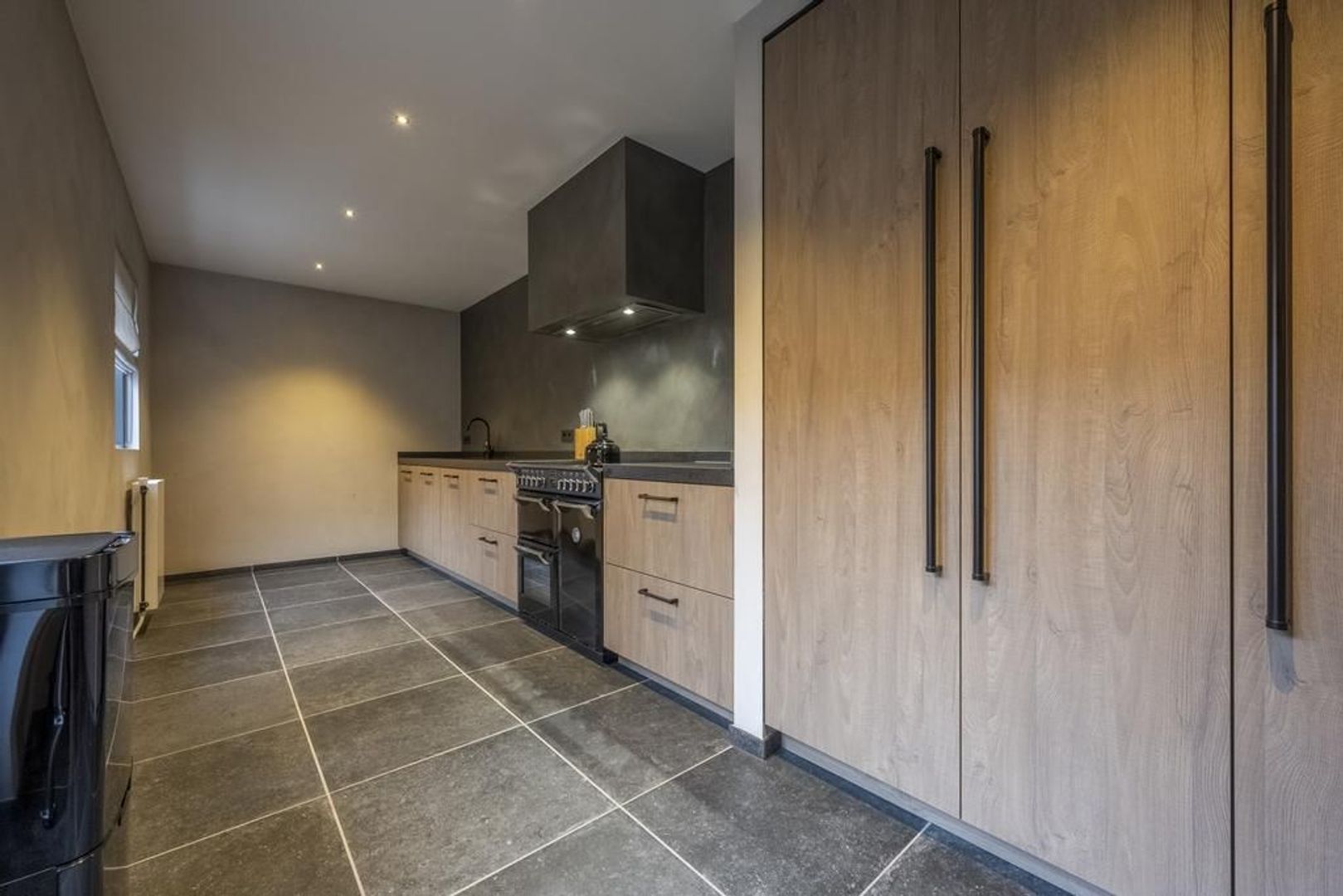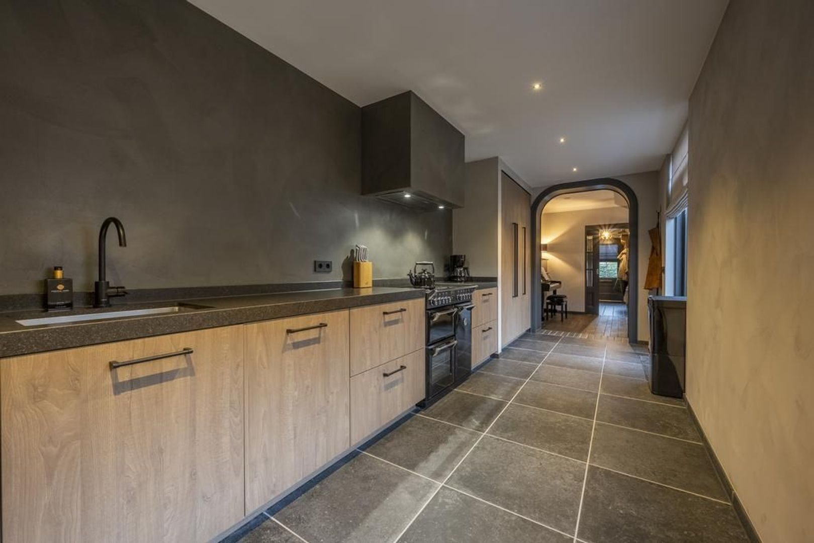 Mooie, lichte doorzon woonkamer met toegang tot de aanbouw, waarin zich de keuken bevindt. Dit is een robuuste wandopstelling met veel ruimte, een prachtig solitair gasfornuis met maar liefst drie ovens, een afzuigkap, koelkast, en vaatwasser.