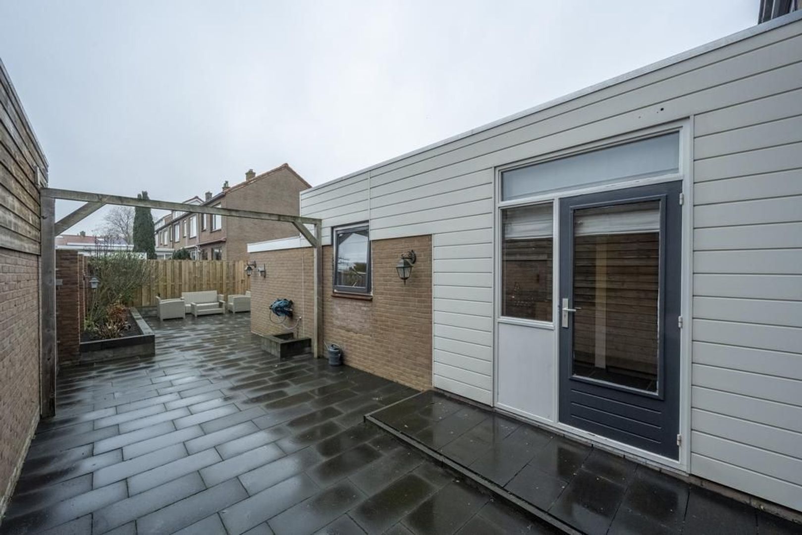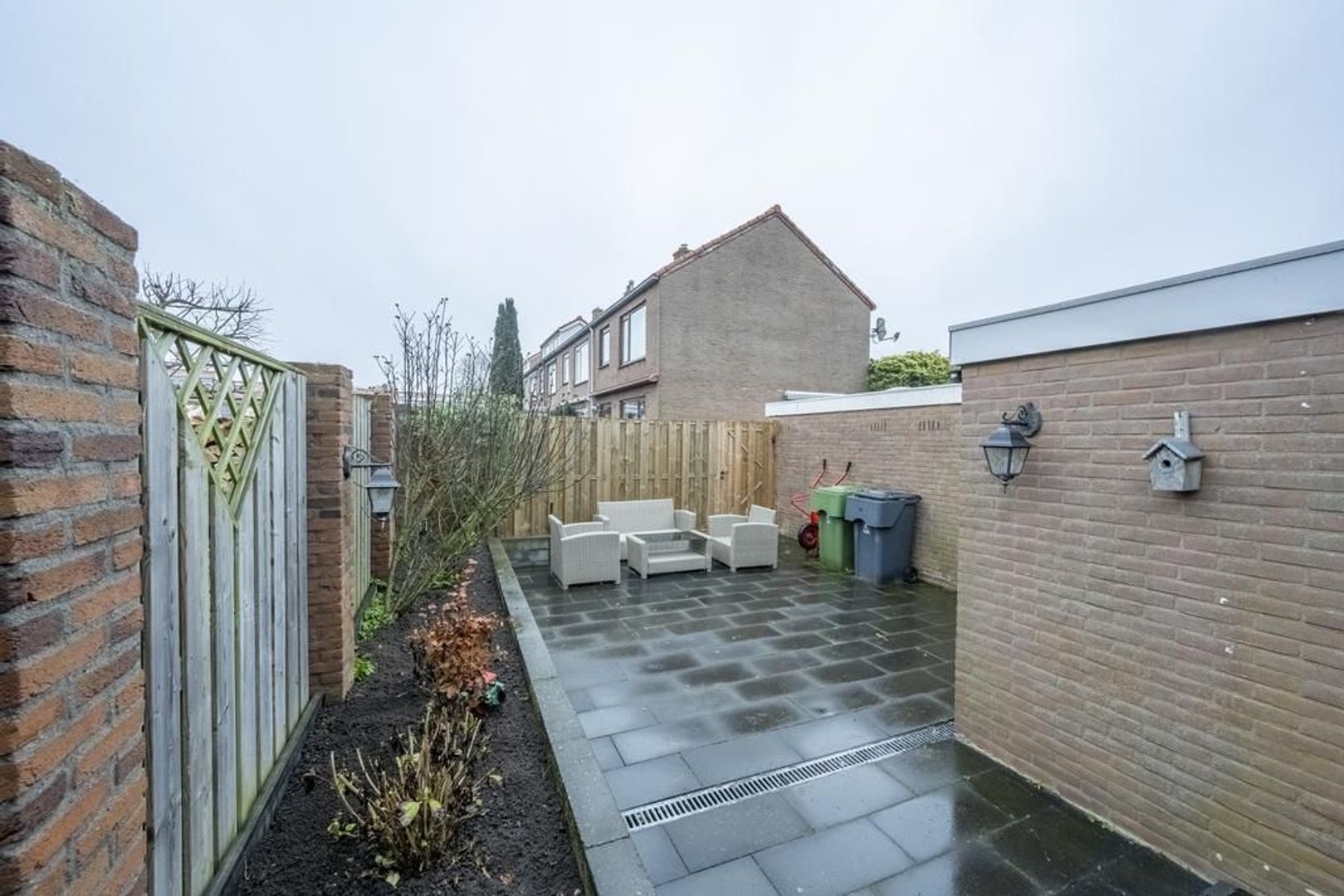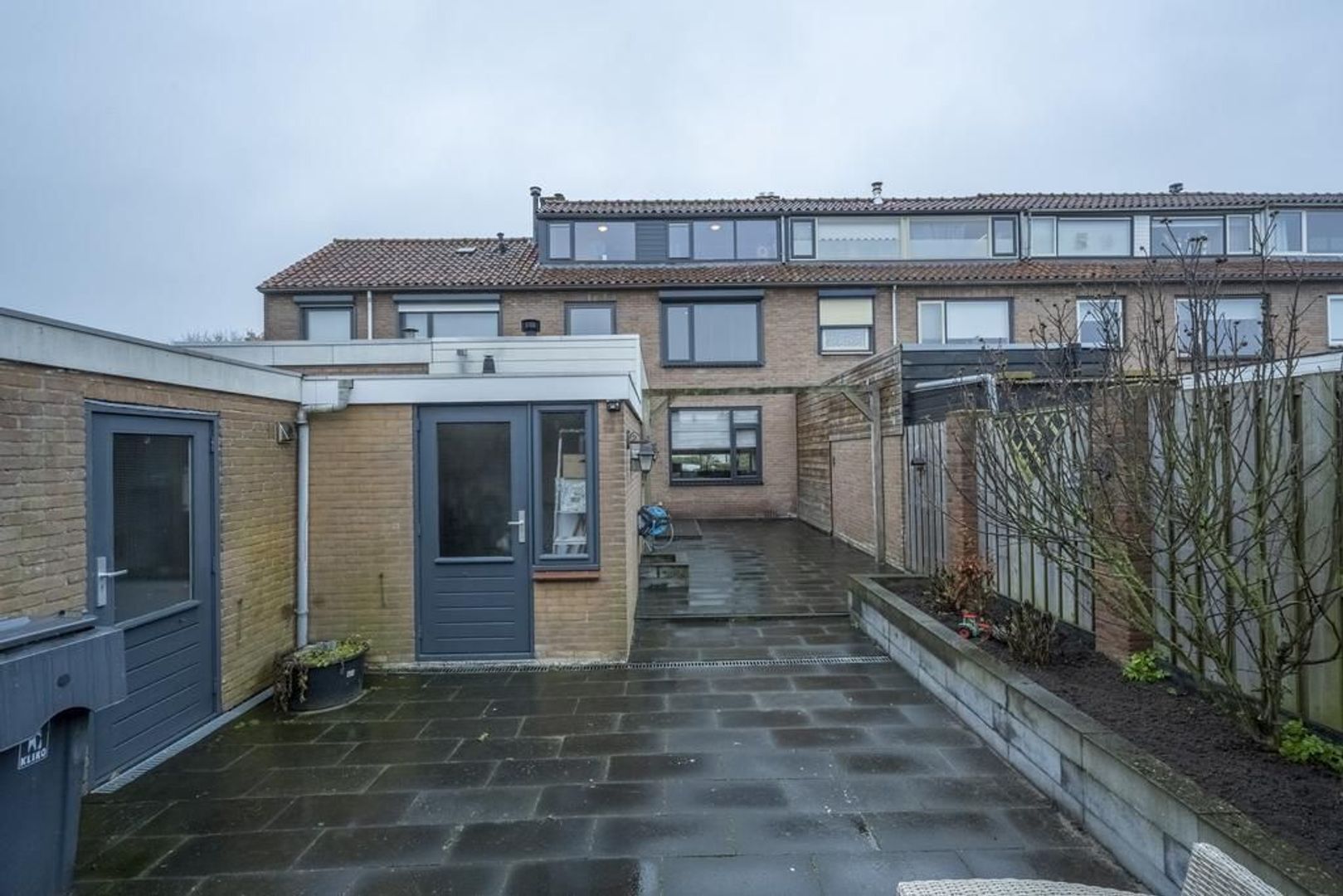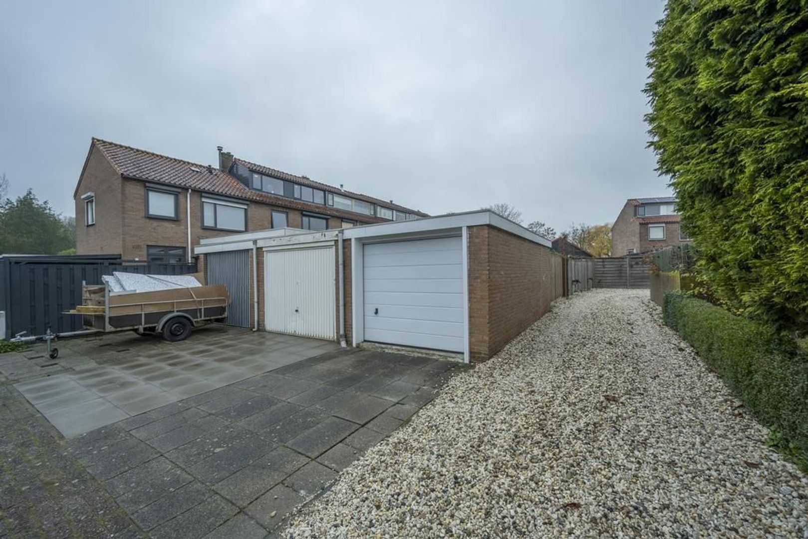 De diepe achtertuin ligt op het noordoosten en is grotendeels verhard. Aan de zijkant bevindt zich de loopdeur van de garage, die dus via de tuin bereikbaar is. Achter de keuken is ook nog een berging. Hierin is de opstelplaats voor de cv-ketel.