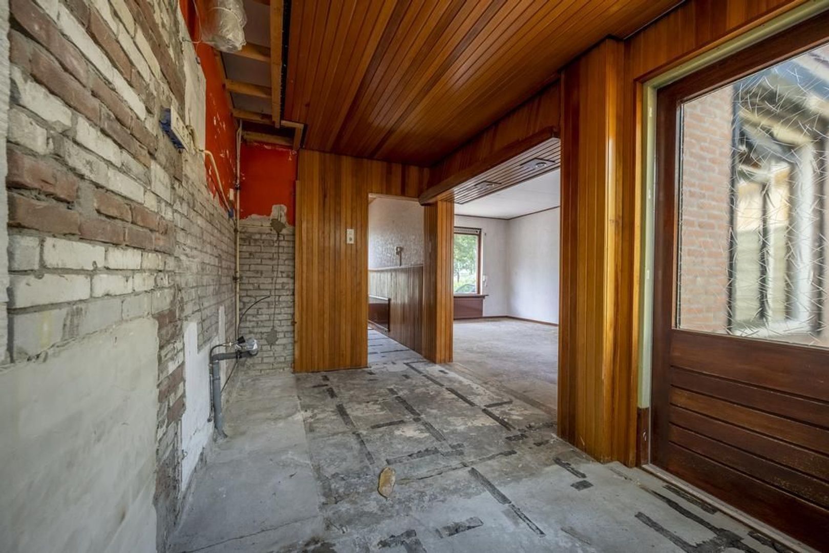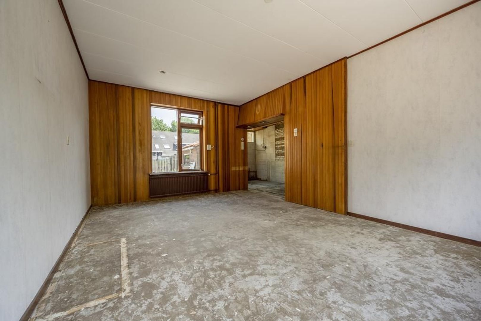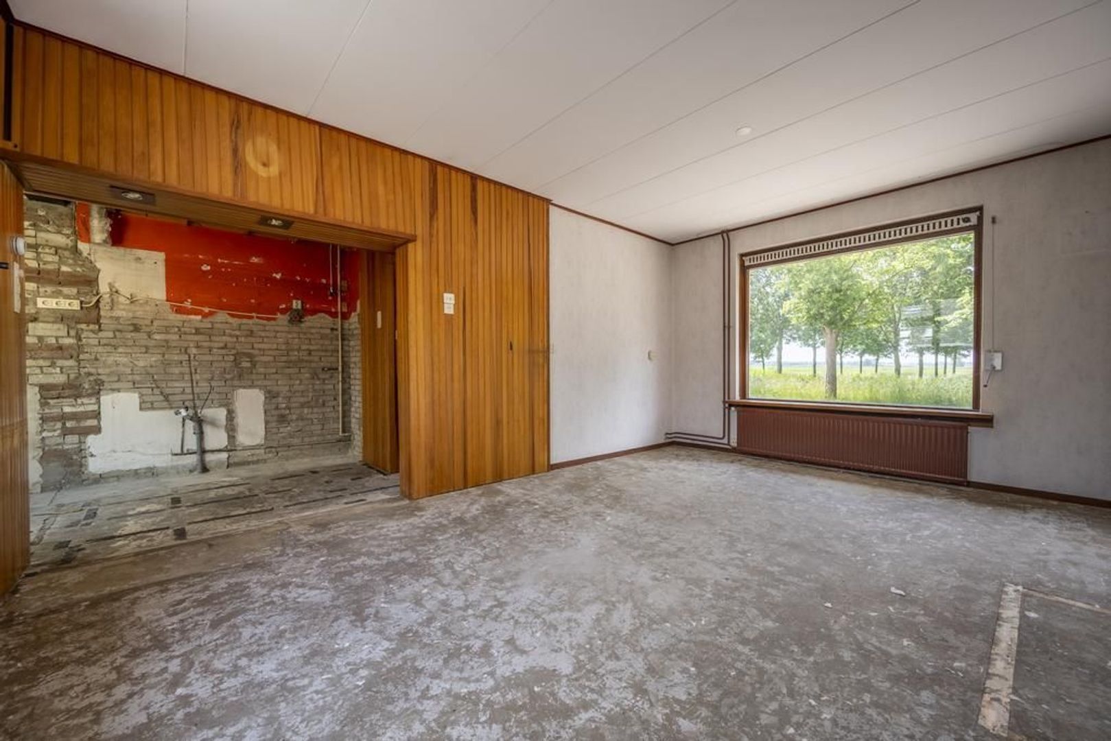 Doorzon woonkamer met open keuken (geen inrichting) met deur naar de tuin.