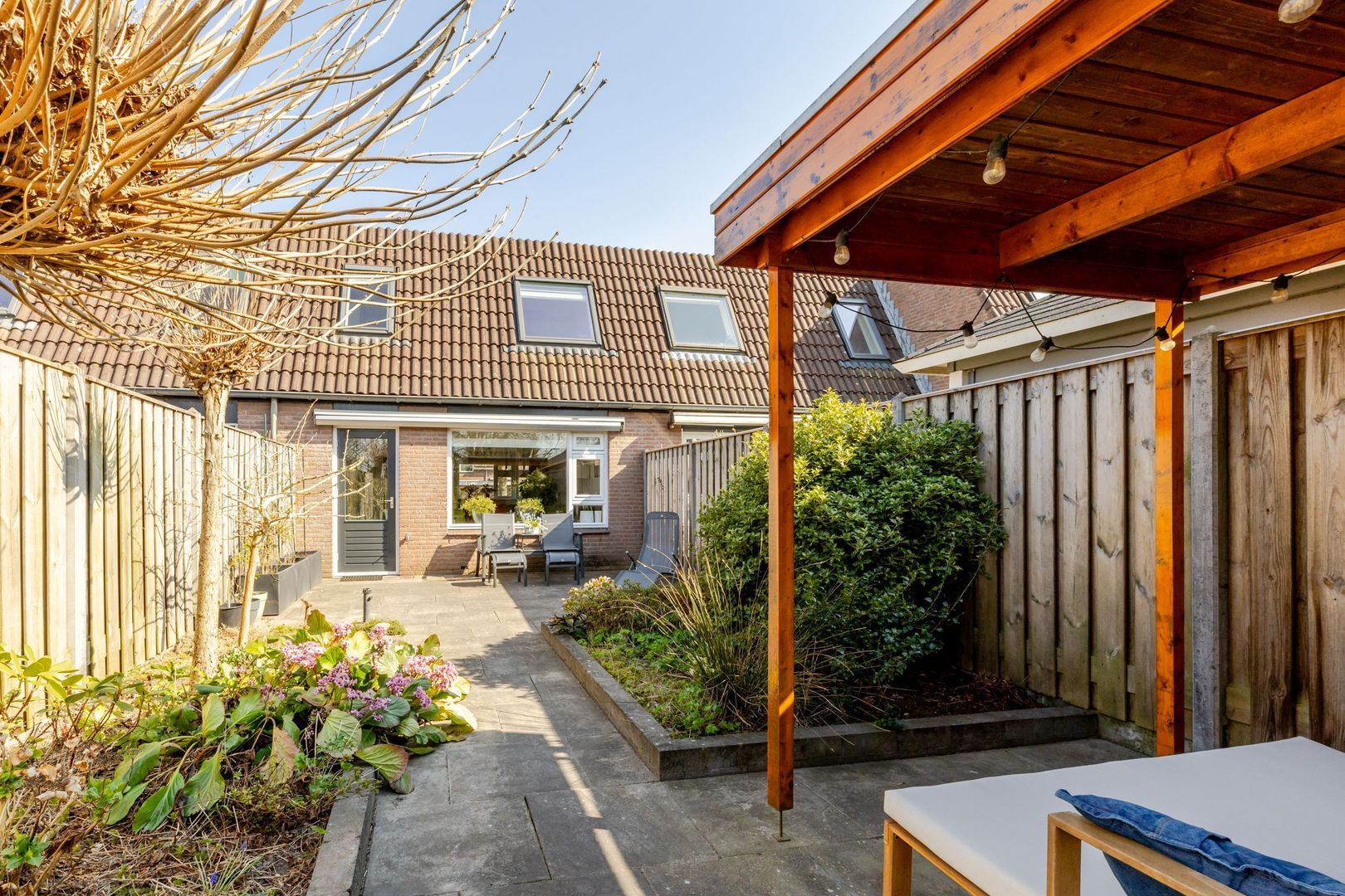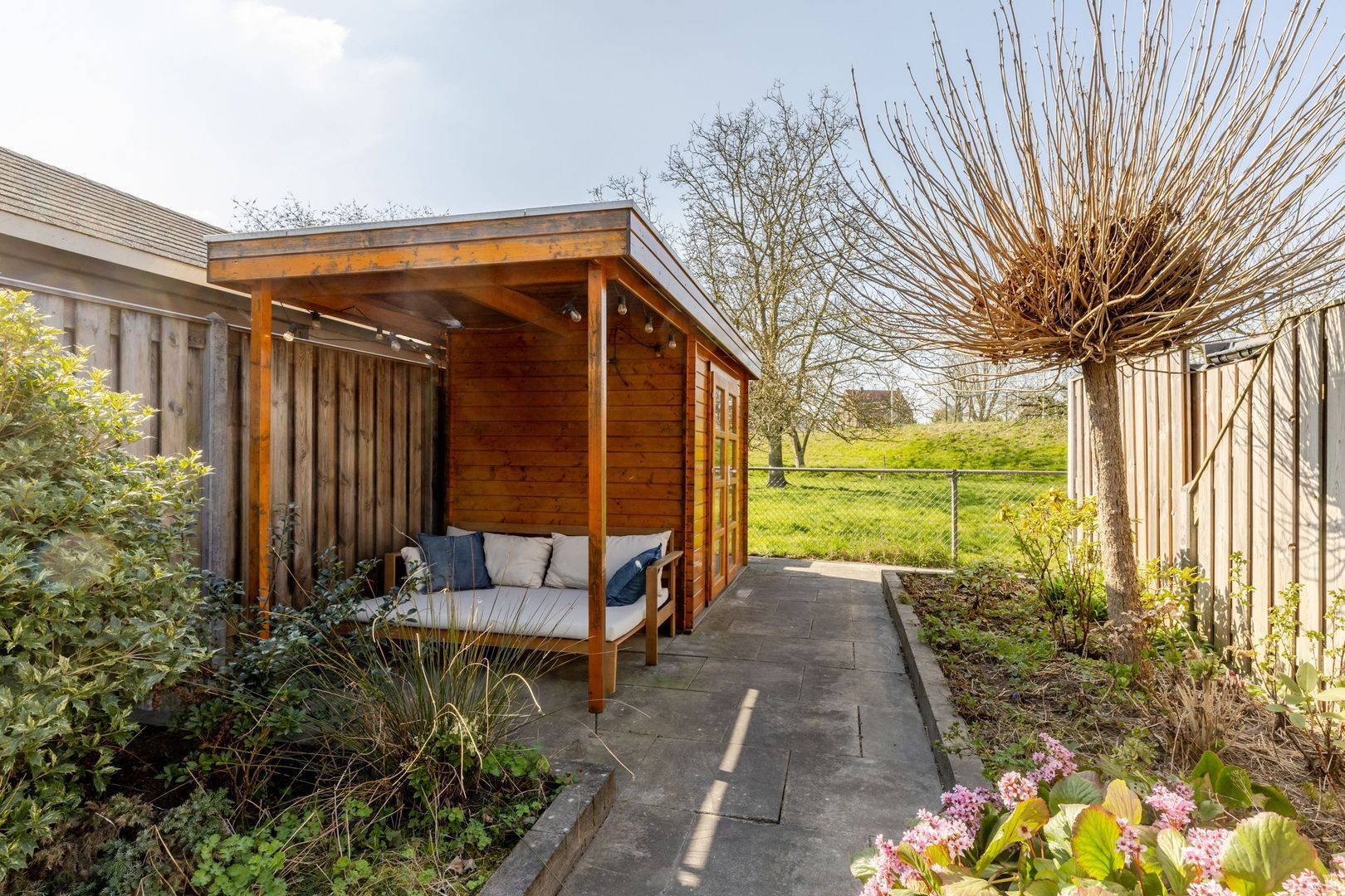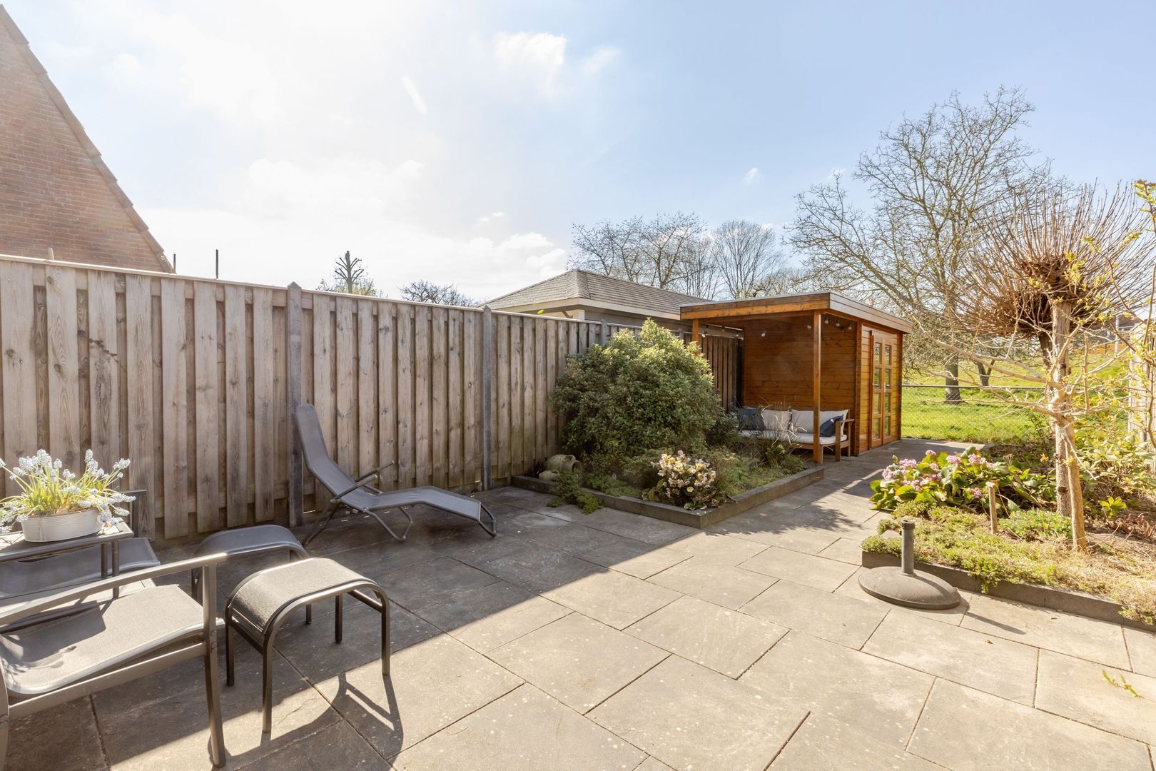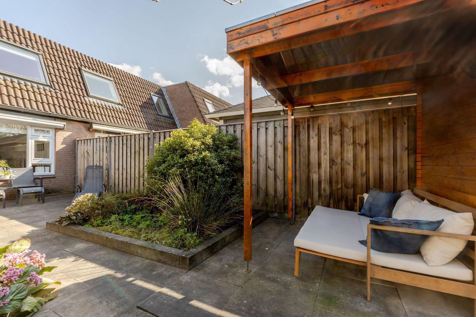 De achtertuin ligt op het westen; lekker genieten van de zon tot laat in de avond! Voor de houten schuur is een stoere overkapping gebouwd. Hier is het fijn, beschut toeven.