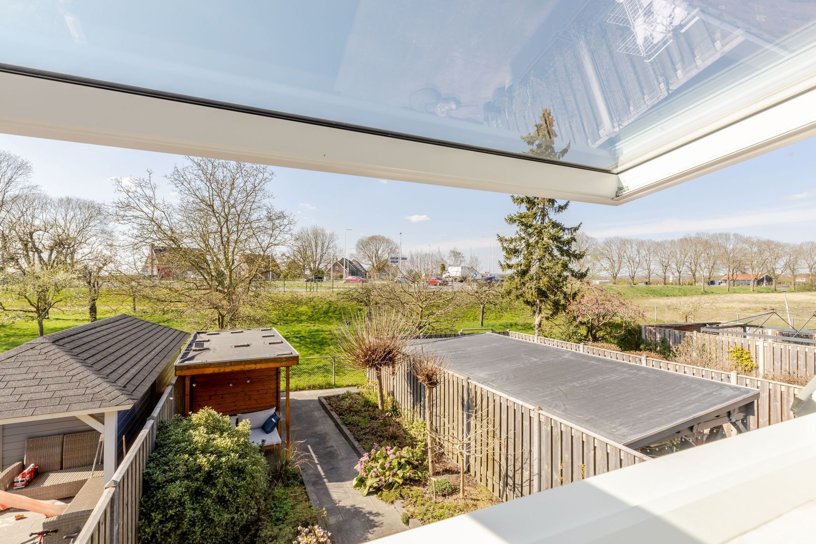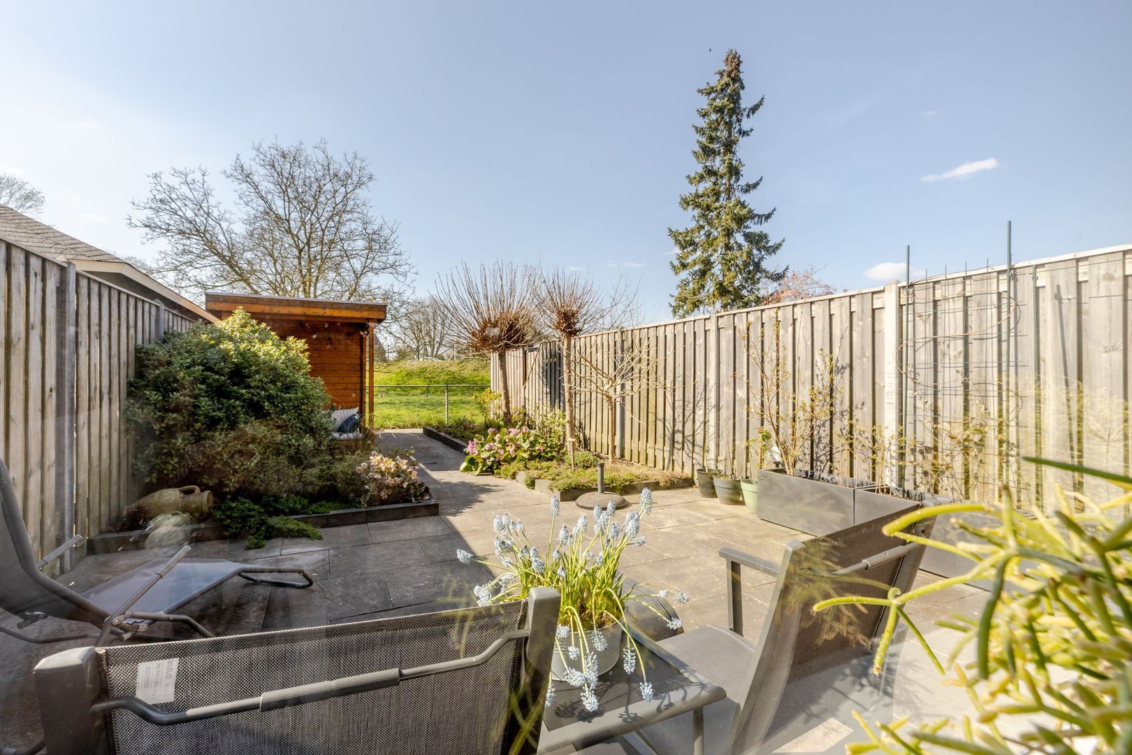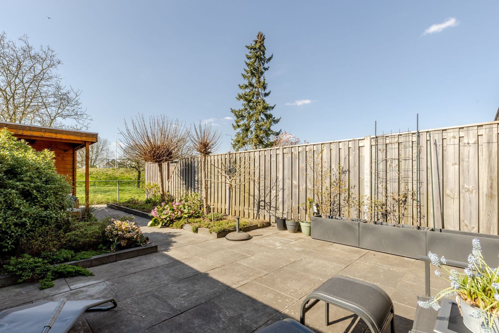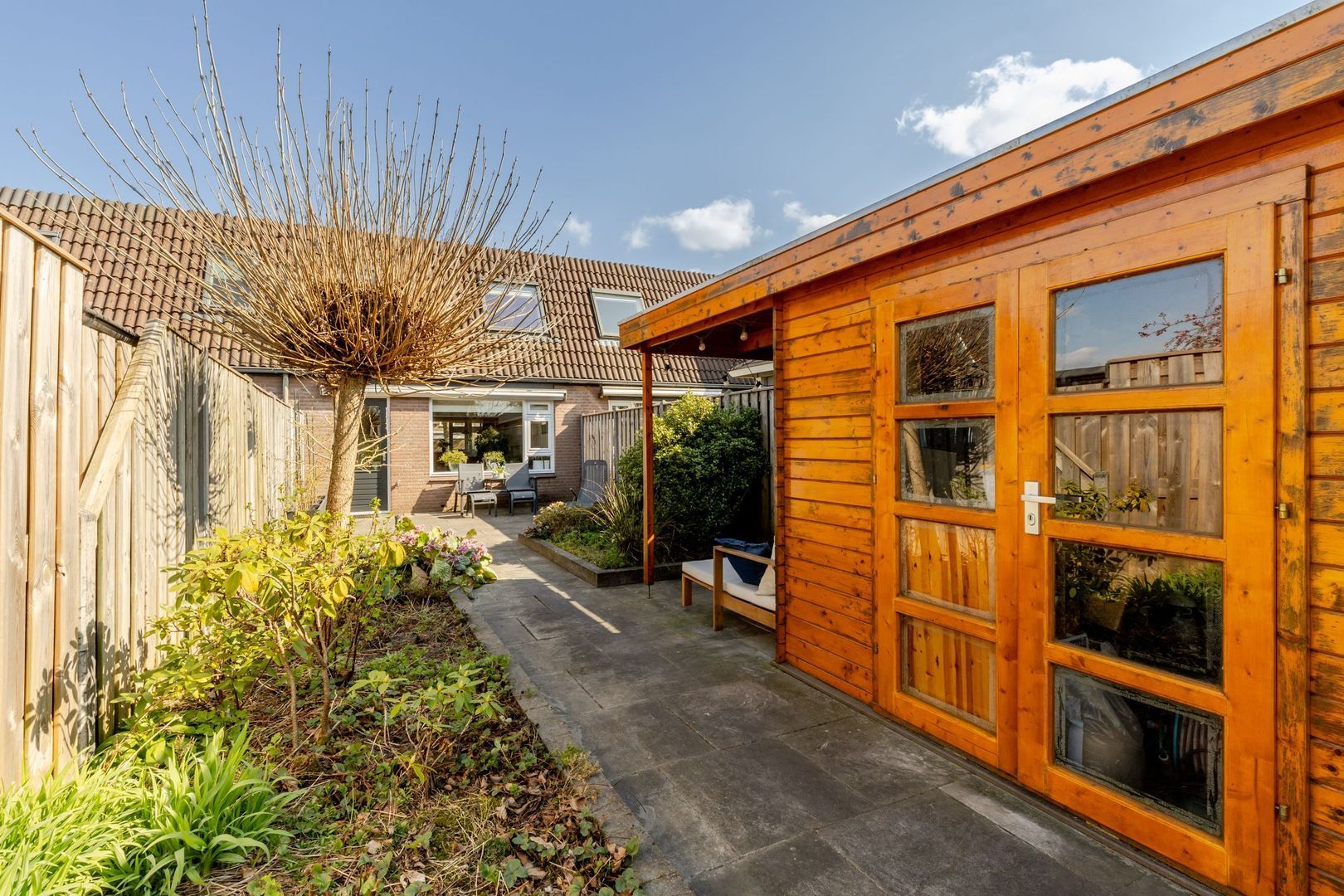 De achtertuin ligt op het westen; lekker genieten van de zon tot laat in de avond! Voor de houten schuur is een stoere overkapping gebouwd. Hier is het fijn, beschut toeven.