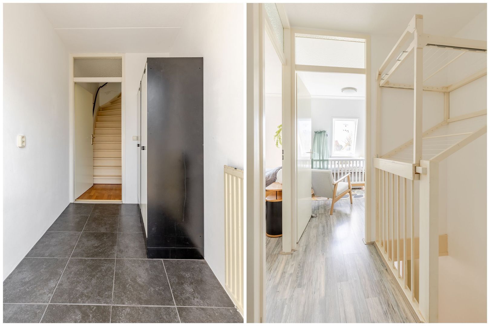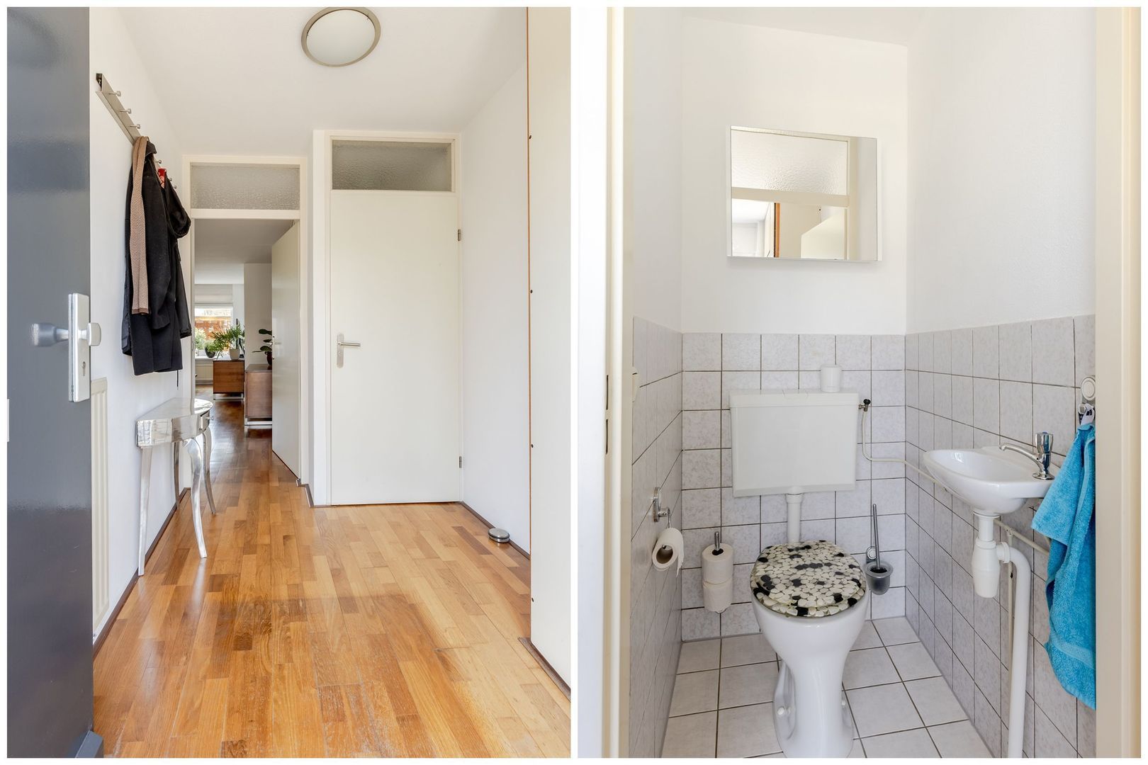 Entree in hal, meterkast en toiletruimte met fonteintje. Lichte woonkamer met een praktische trapkast en een deur naar de achterhal die toegang biedt tot de bijkeuken en de trapopgang.