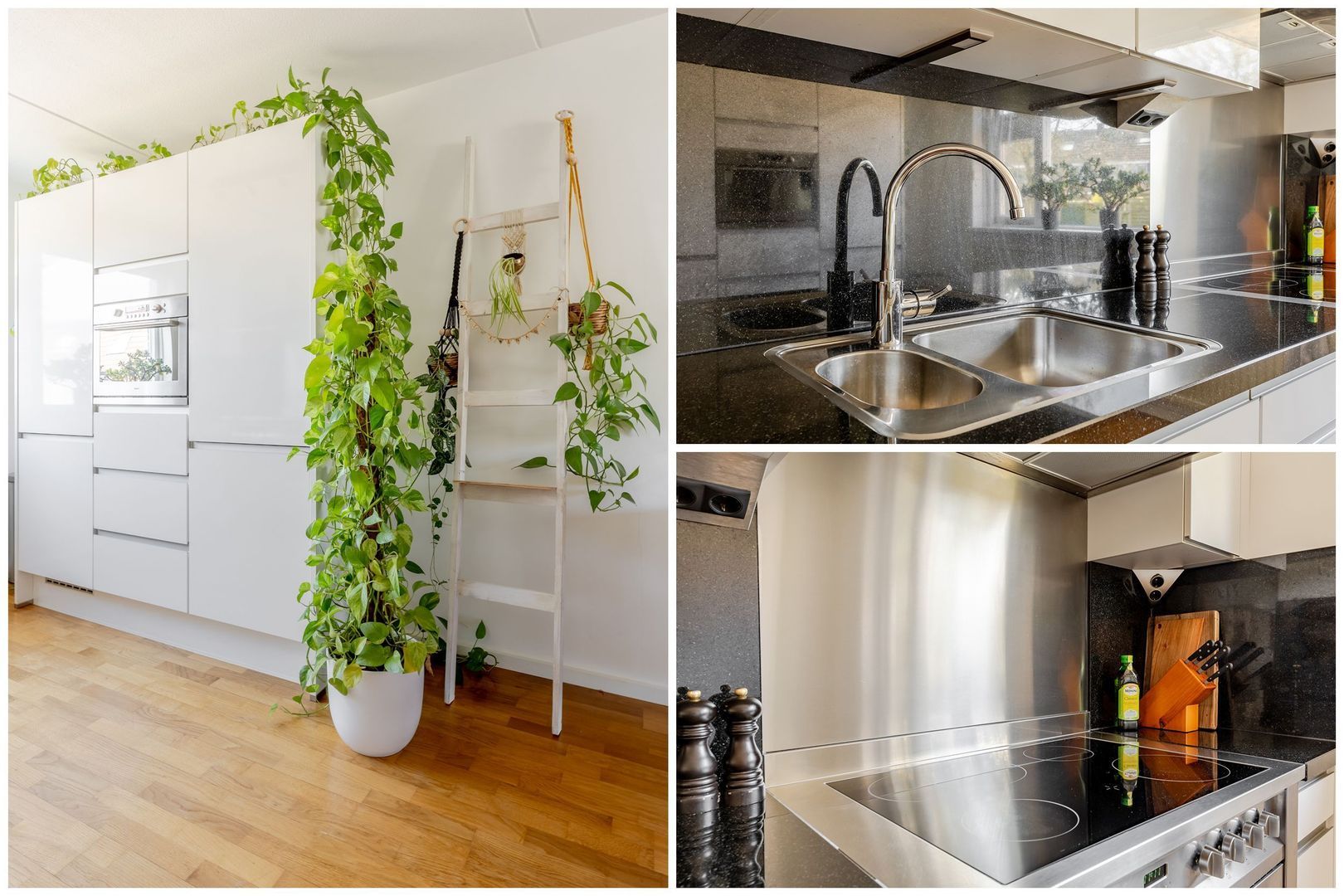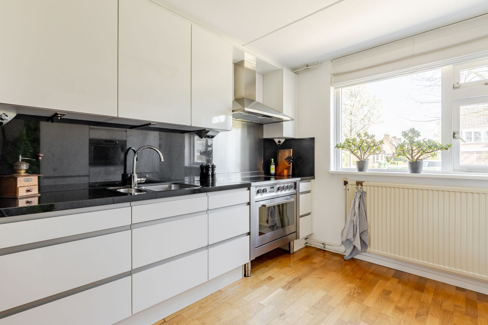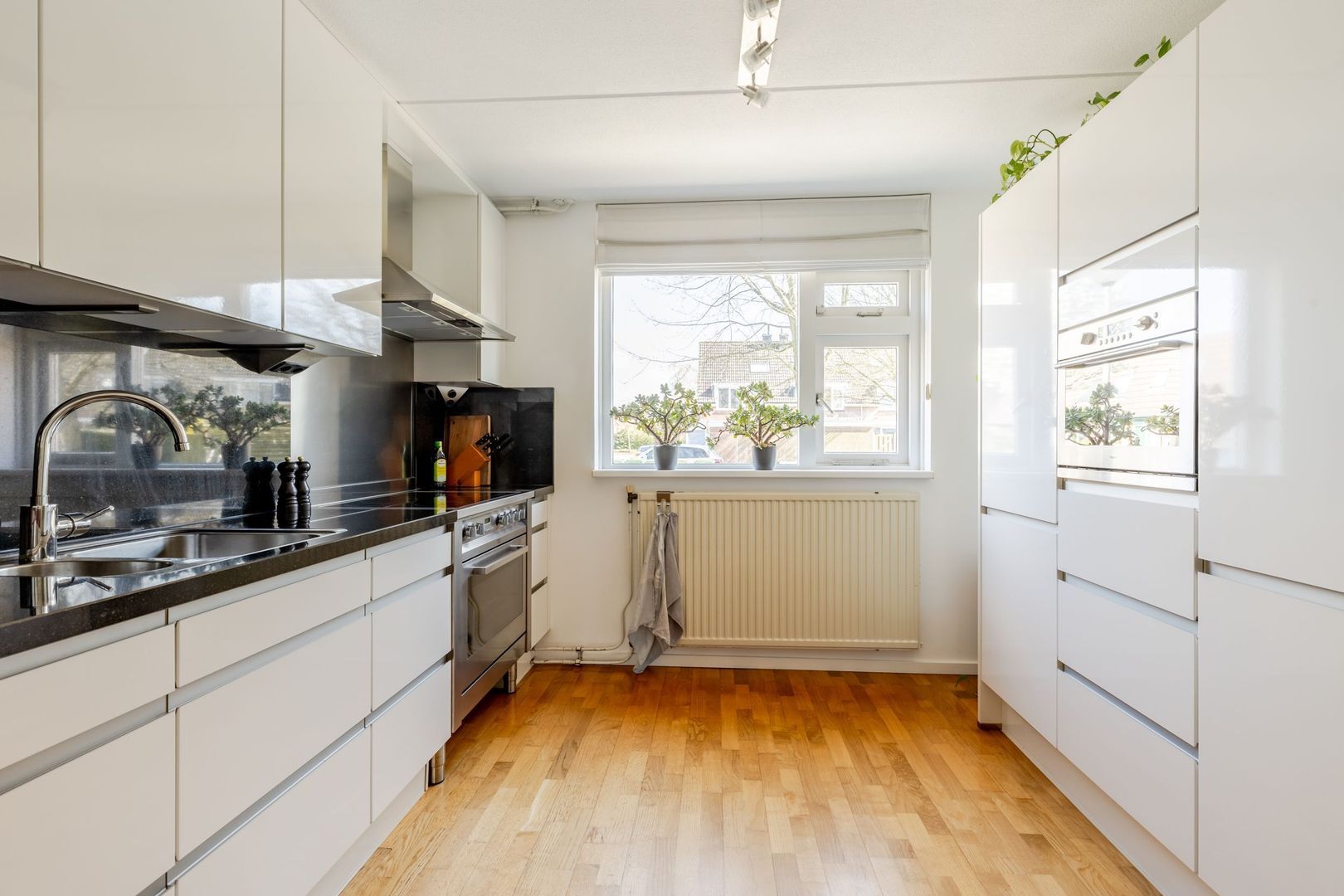 De moderne, open keuken ligt aan de voorzijde. Deze heeft een dubbele wandopstelling en is voorzien van diverse inbouwapparatuur, zoals een fornuis met een keramische kookplaat met een grote oven, afzuigkap, vaatwasser en de combi-magnetron.