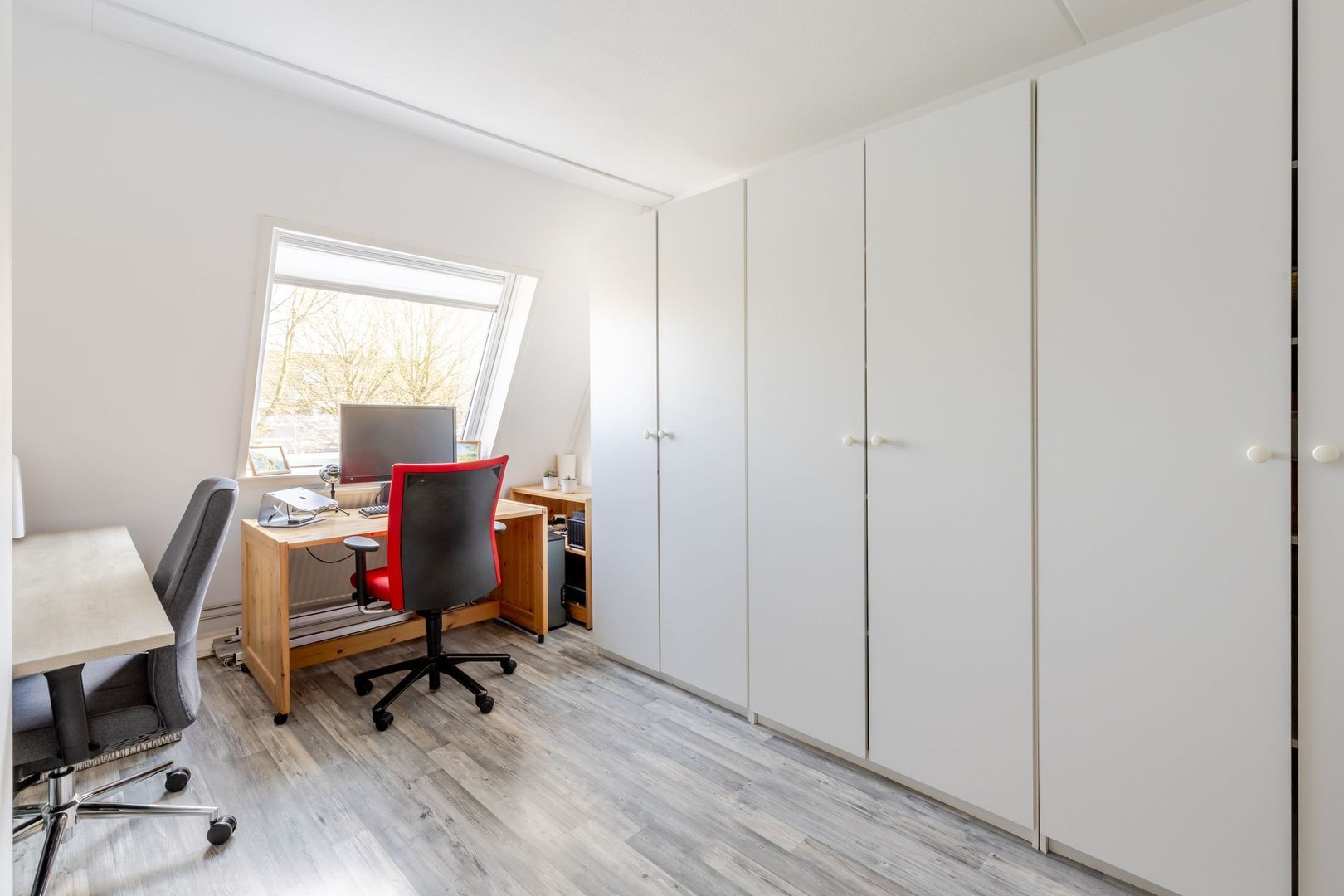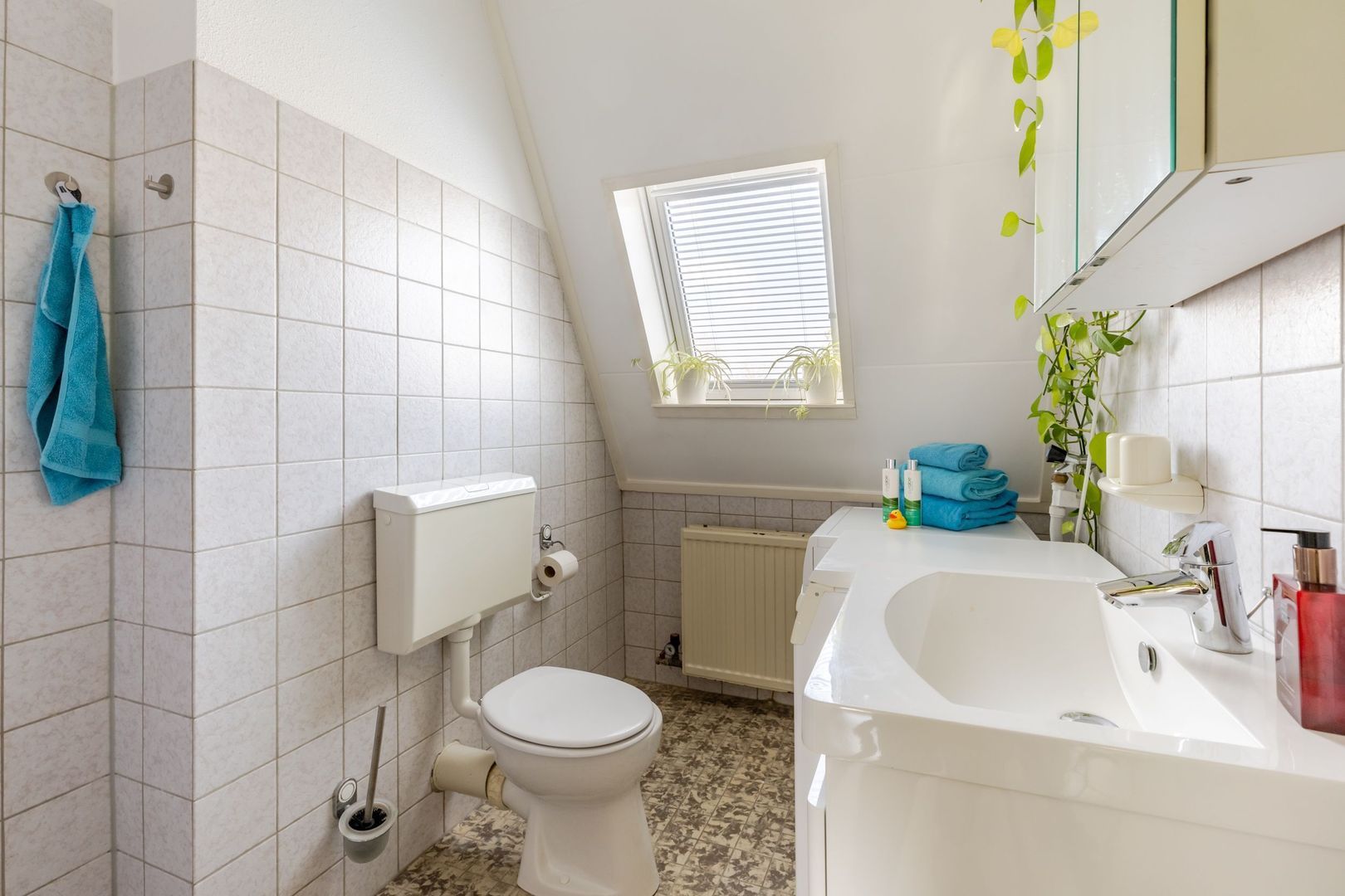 Op de eerste verdieping zijn drie slaapkamers, een vaste kaste met de opstelplaats voor de cv-ketel en de badkamer. Deze is uitgevoerd met een wastafel meubel, toilet, inloopdouche en de aansluitingen voor de wasapparatuur. De badkamer is wat gedateerd, maar nog steeds netjes en functioneel. Een koper kan deze naar eigen smaak vernieuwen.