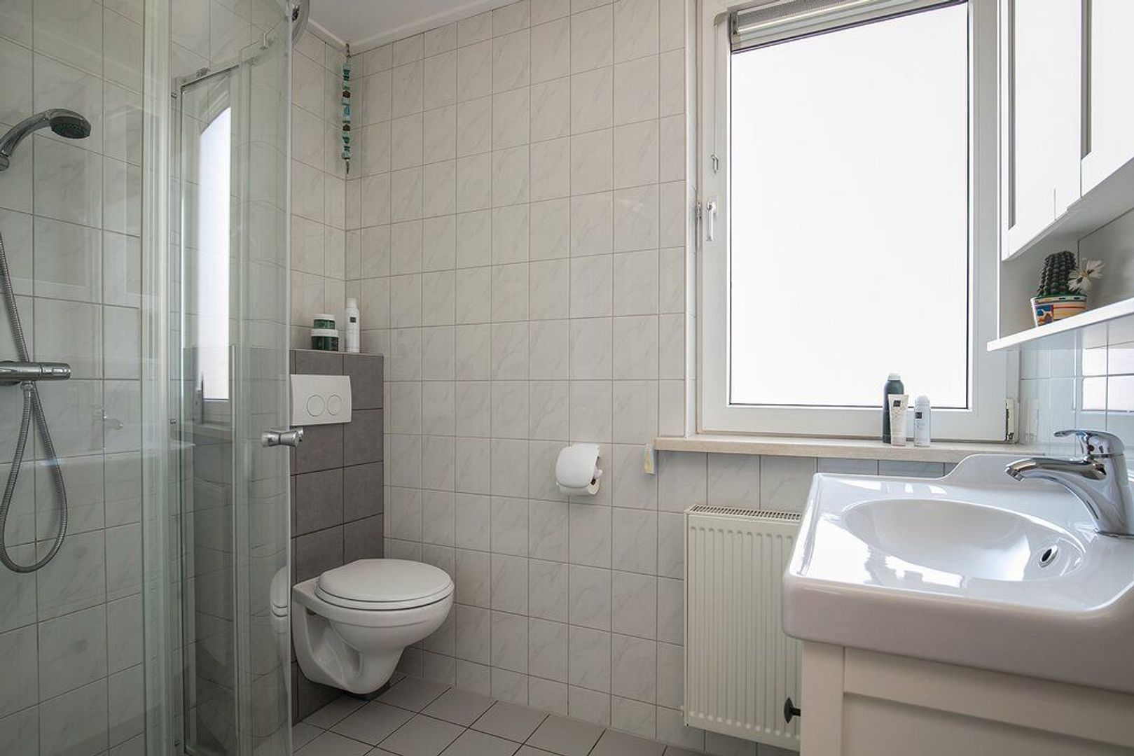 De badkamer is ingericht met een wastafelmeubel, een doucheruimte en een tweede toilet.