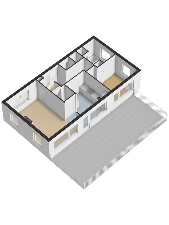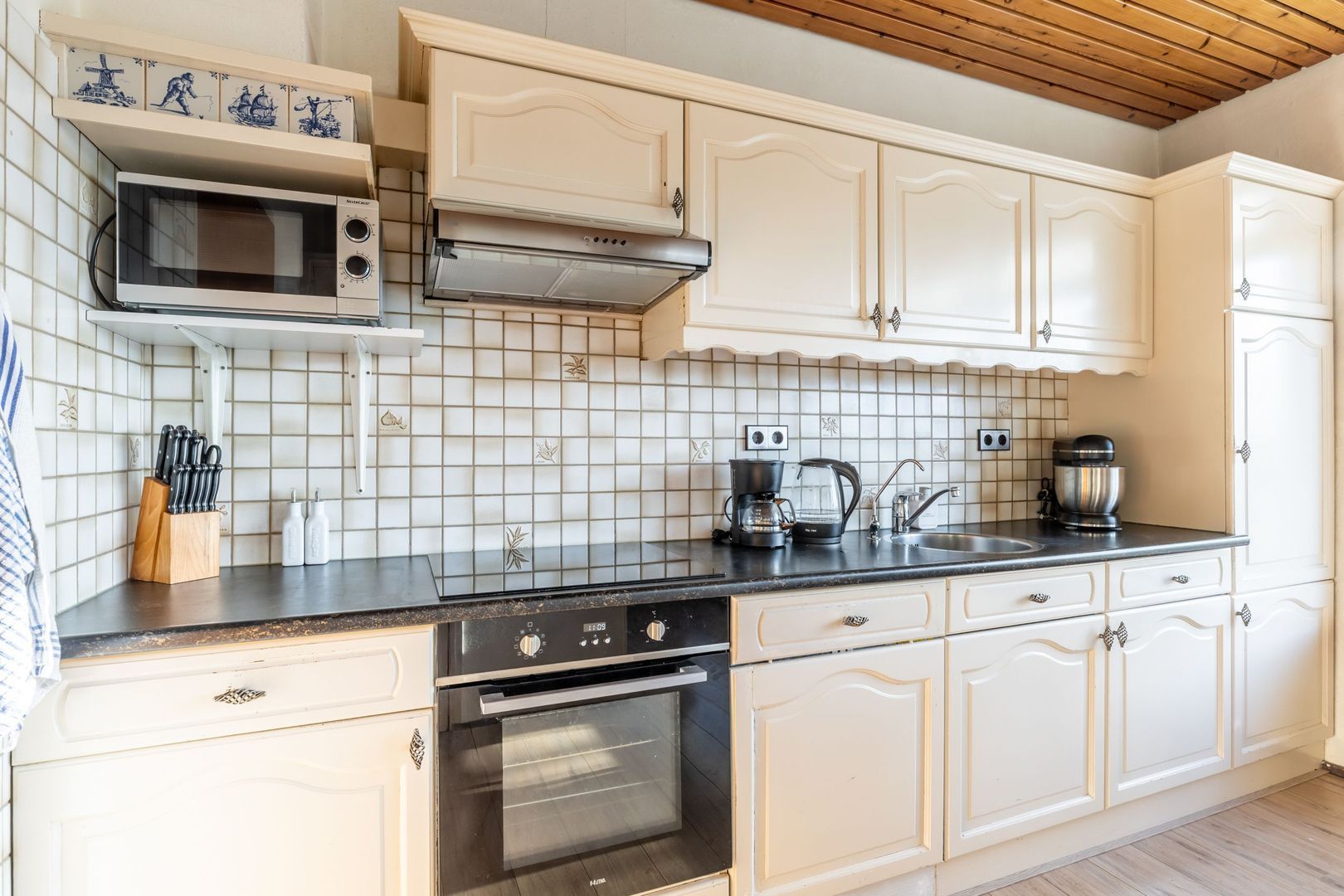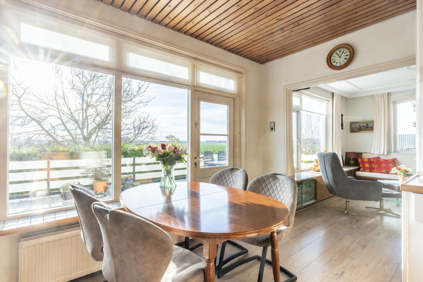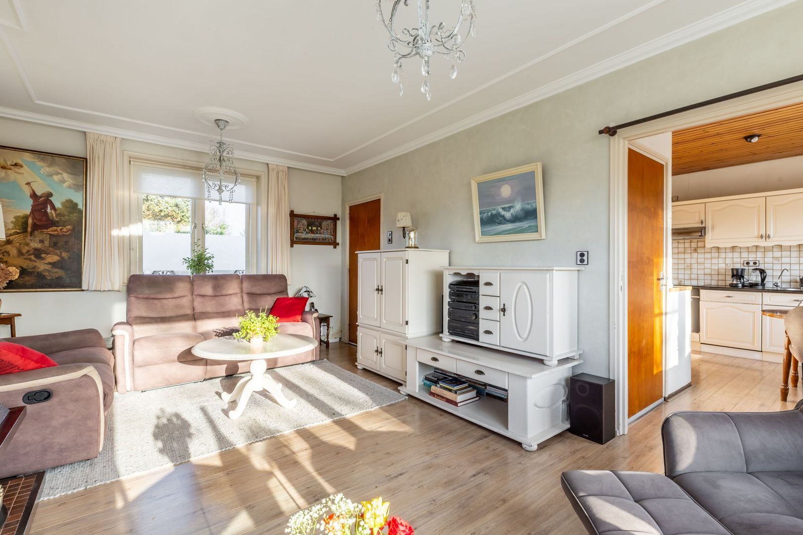 De woonkamer en keukenvloer zijn afgewerkt met laminaat.