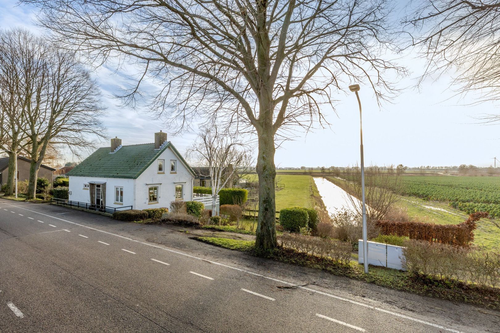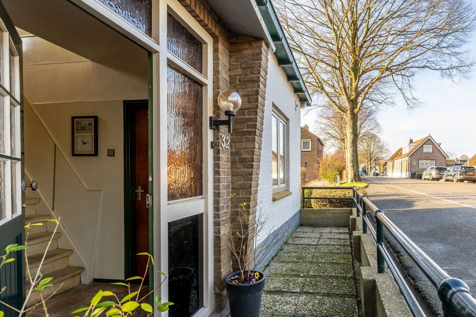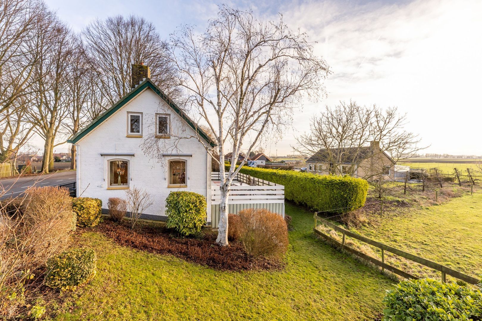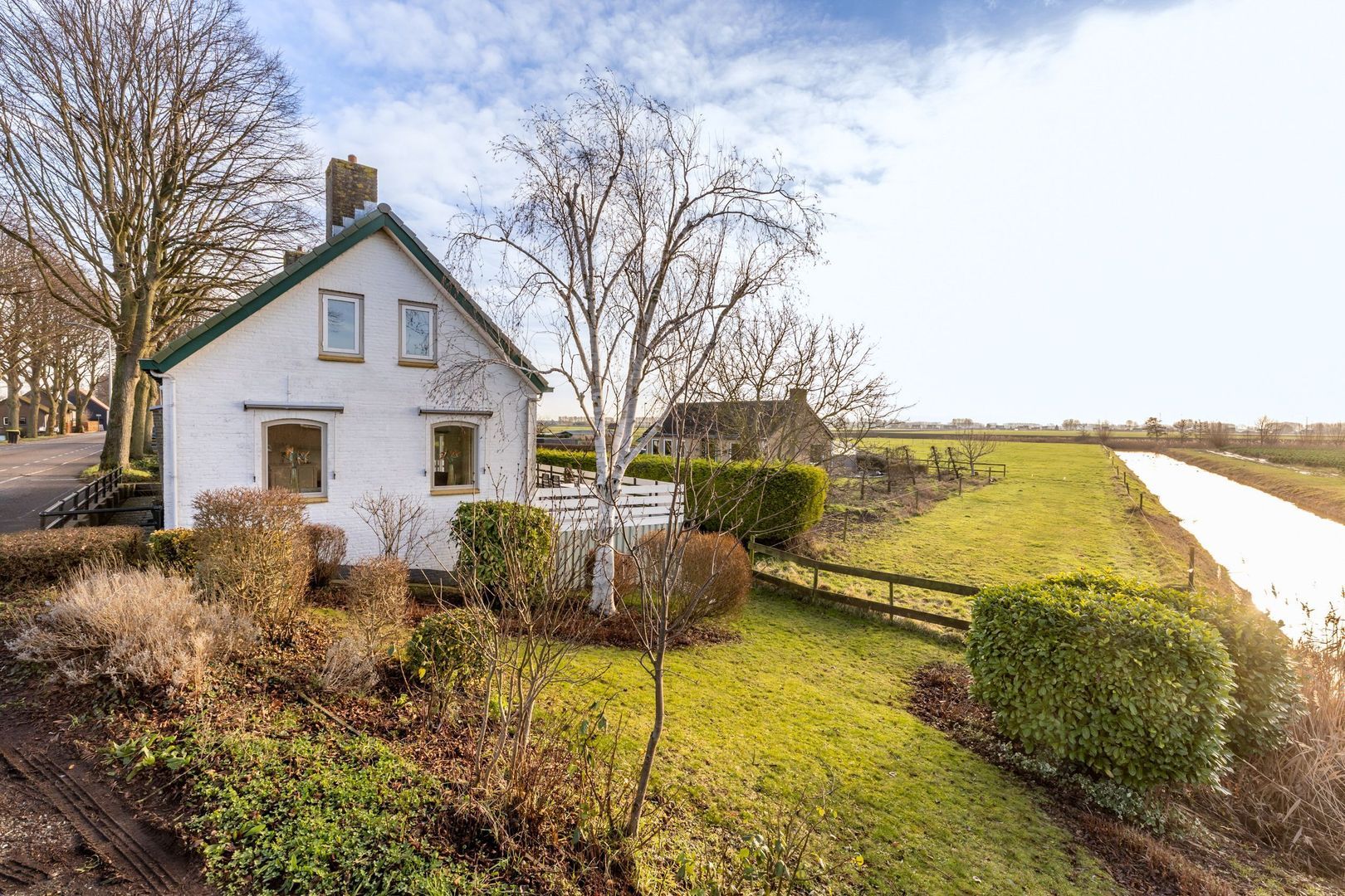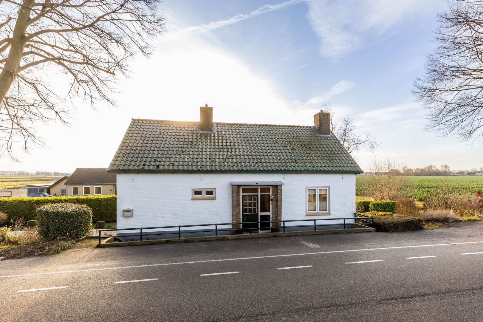 Met witte gevels en een (in 1998) vernieuwd dak met groene pannen, is het een in het oog springend huis aan de dijk.
