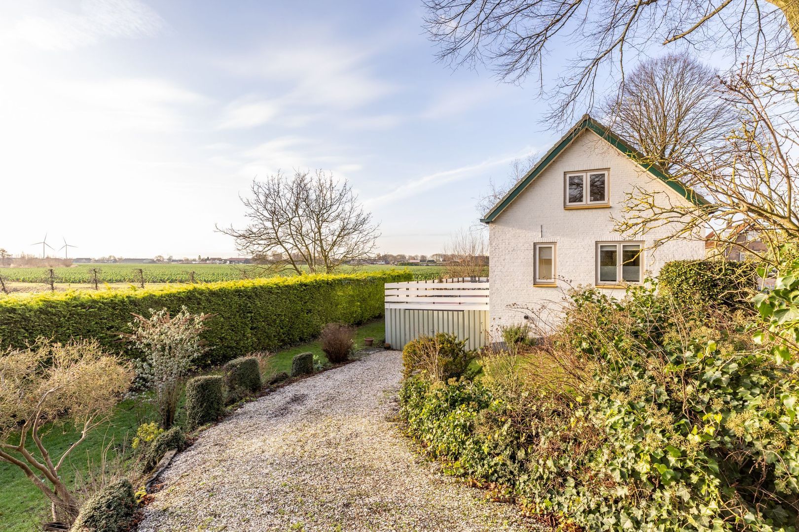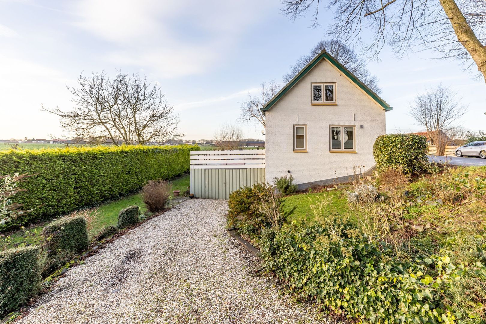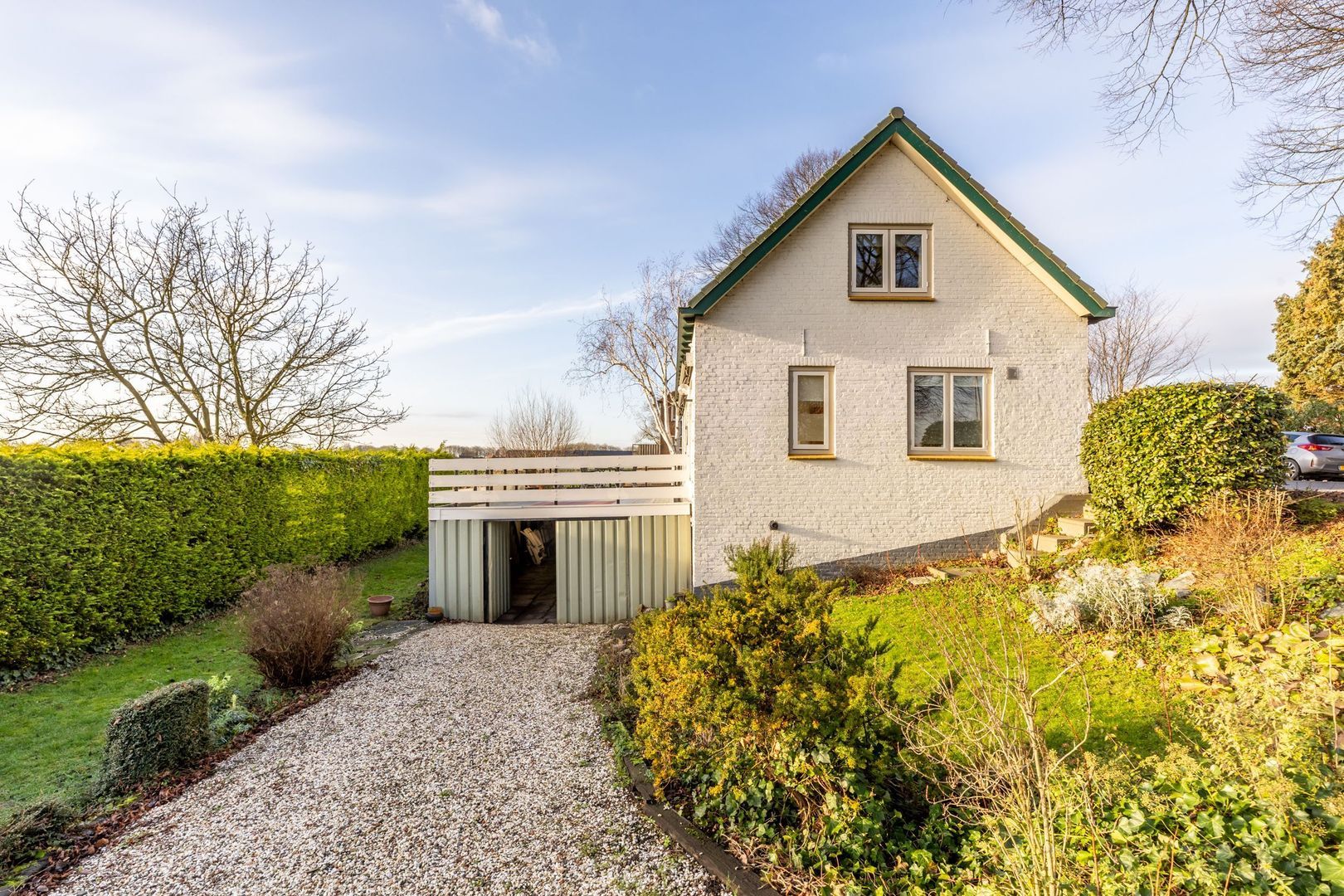 Een eigen oprit vanaf de dijk leidt naar de garage.