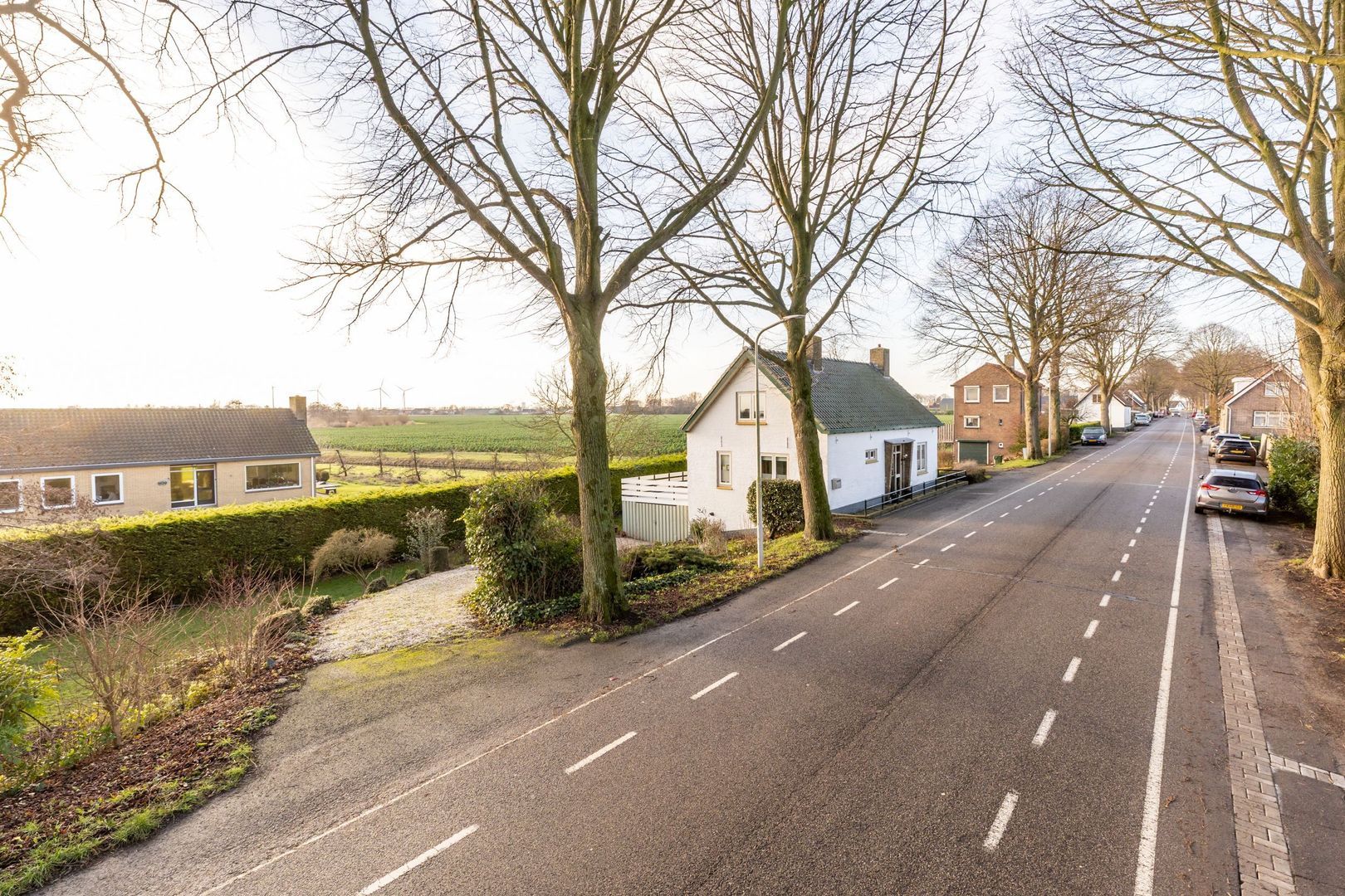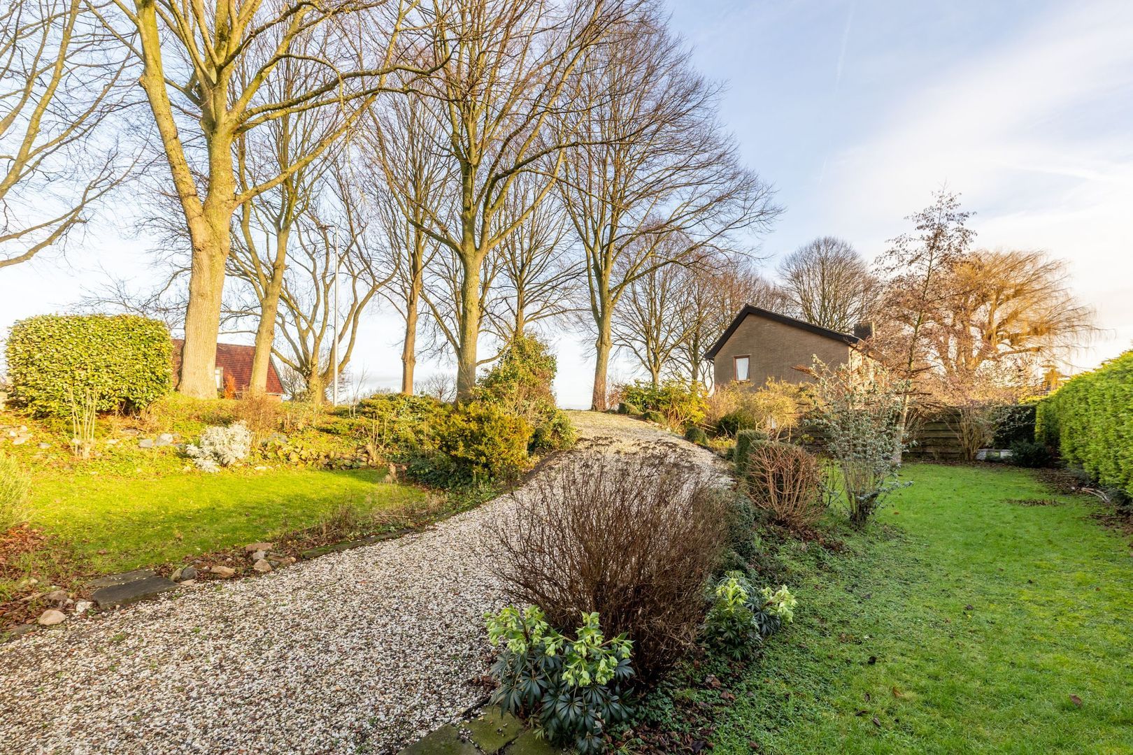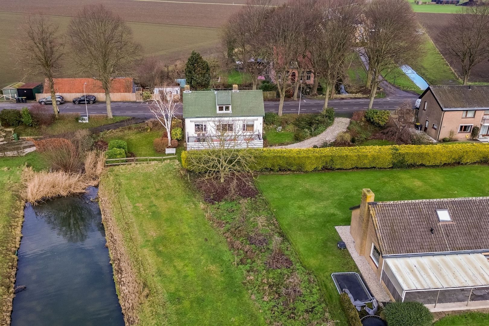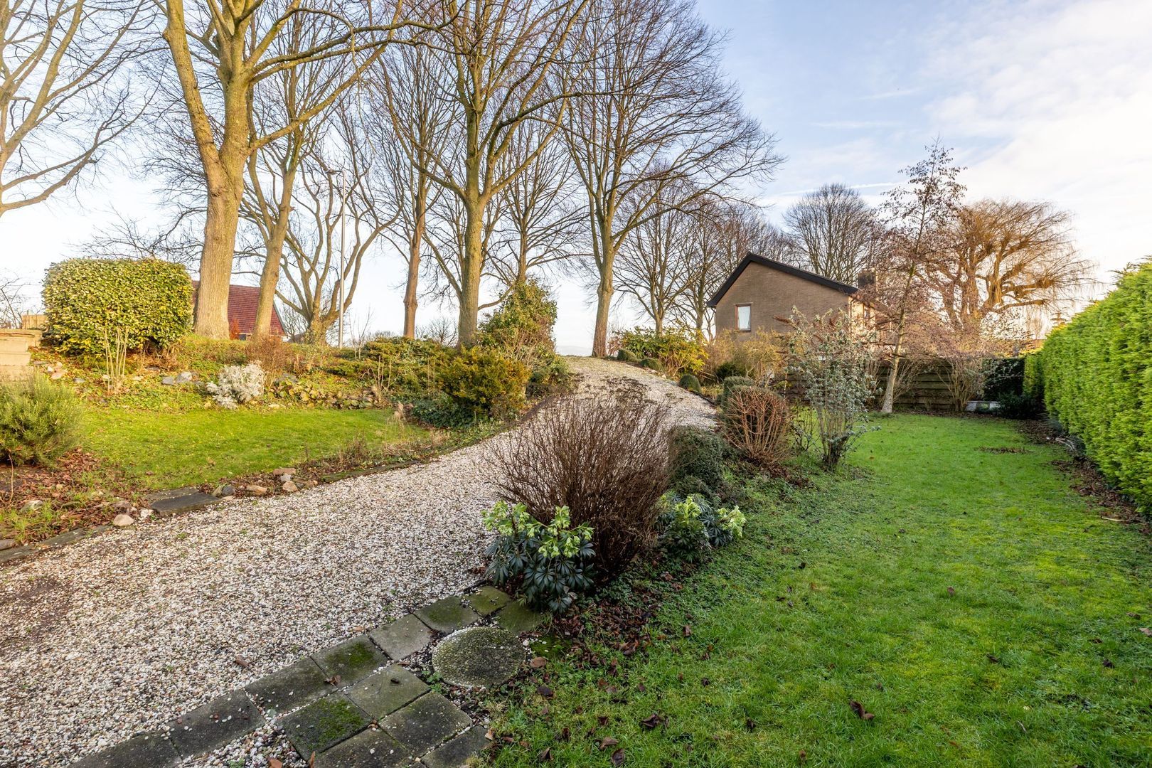 Een eigen oprit vanaf de dijk leidt naar de garage.