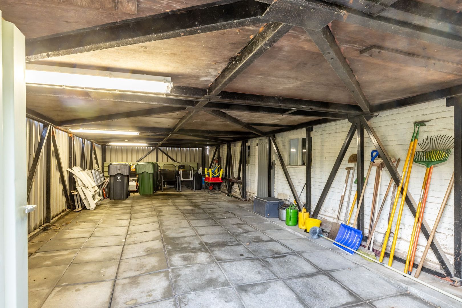 Aansluitend bevindt zich de aangebouwde garage. Deze is ruim 11,5 meter lang en toegankelijk middels twee openslaande deuren.
