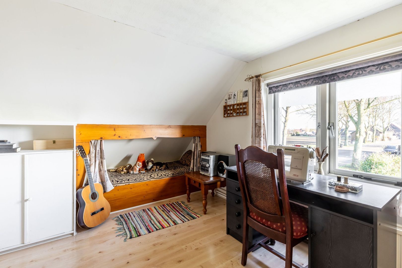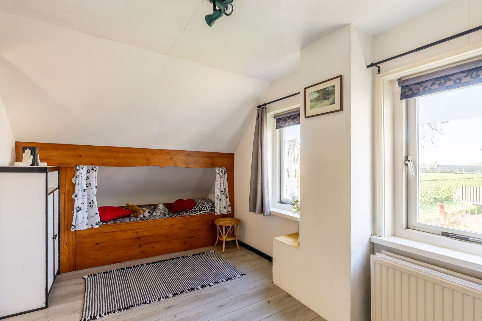 Er zijn twee slaapkamers en onder de schuine kap is heel veel bergruimte gecreëerd.