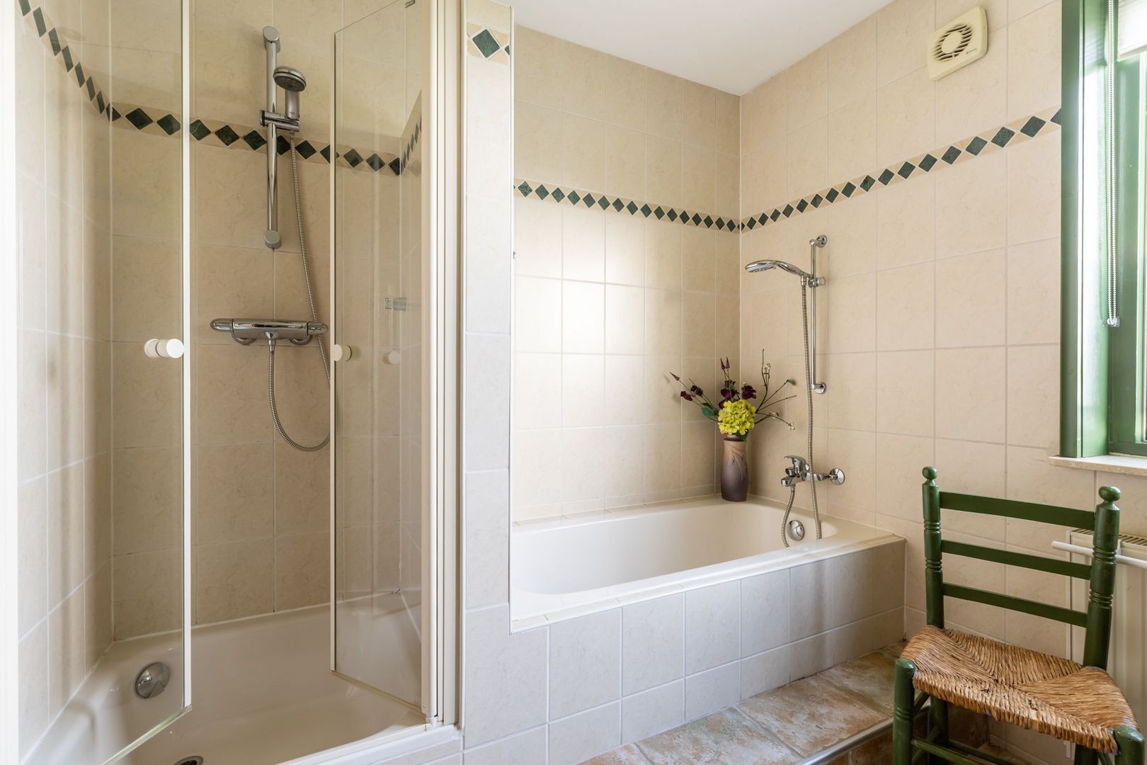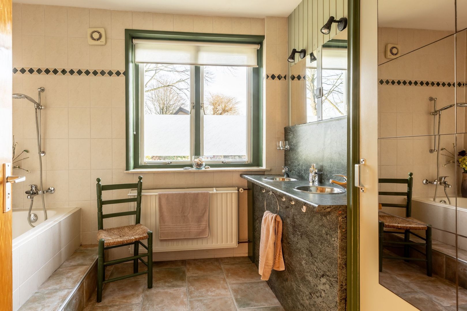 Op de begane grond bevinden zich ook een slaapkamer en de badkamer. Deze is ingericht met een bad, een doucheruimte en een dubbele wastafel. De slaapkamer ligt aan de achterkant.