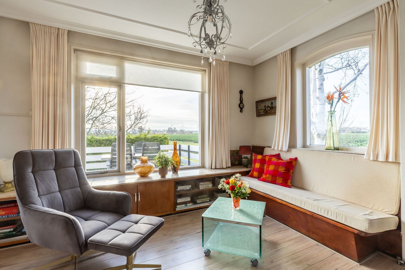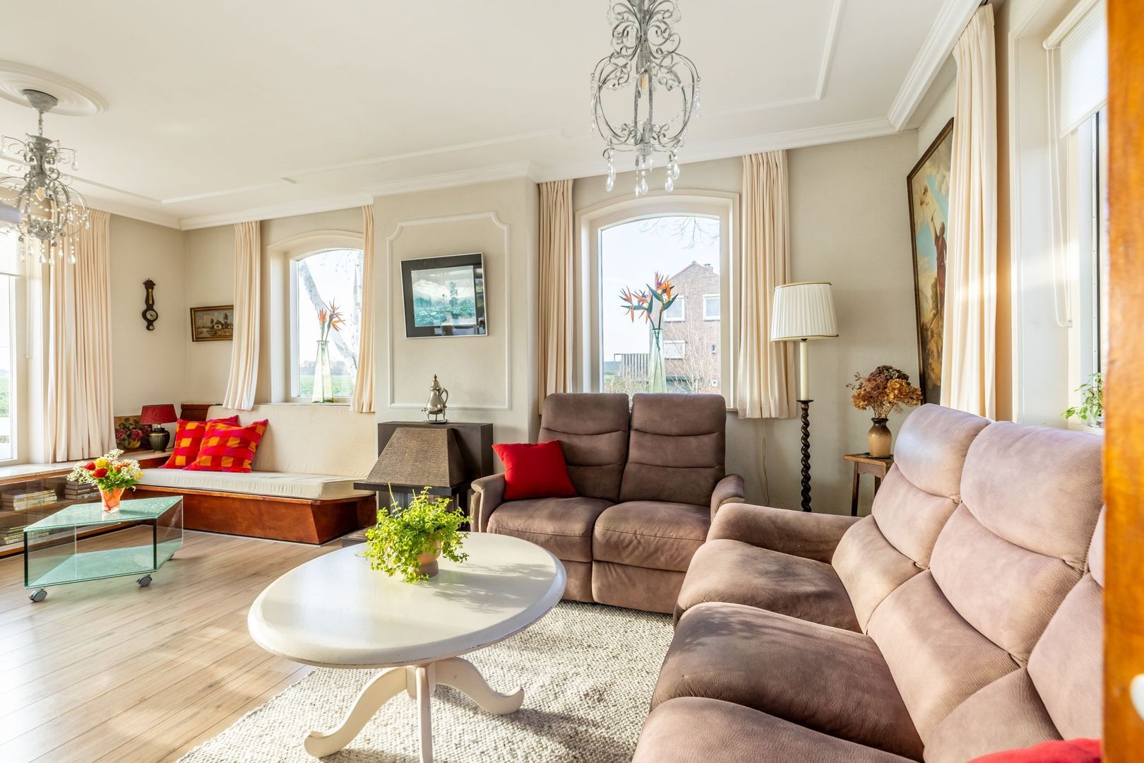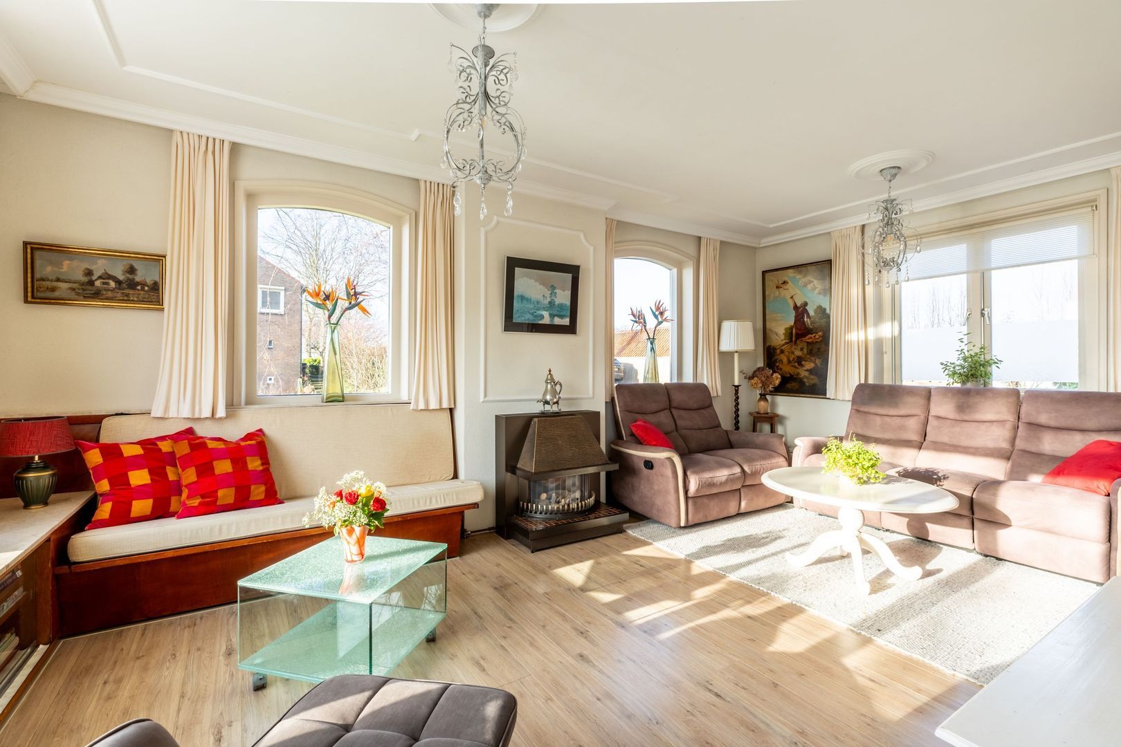 Woonkamer met fraai gestuct plafond en gashaard. De vele ramen zorgen voor een prettige lichtinval en een weids uitzicht.