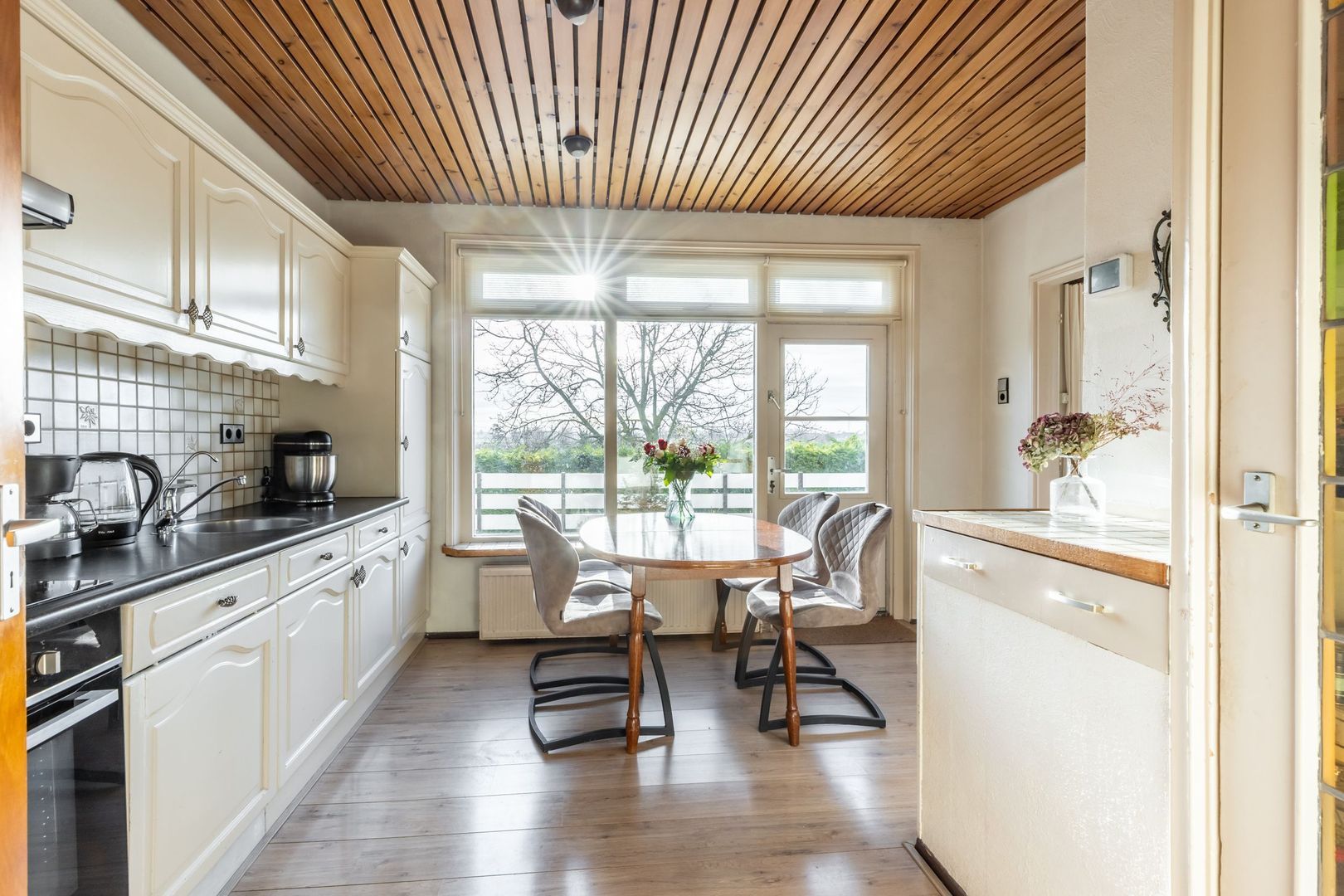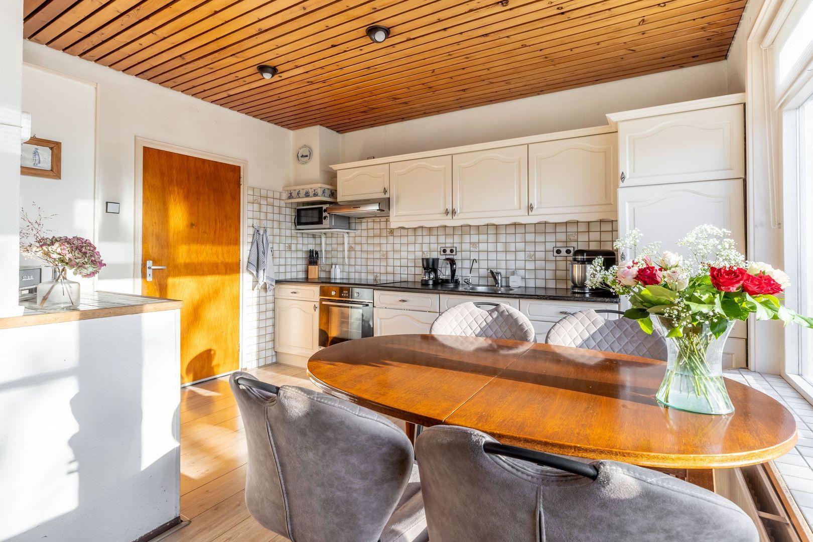 De half open (woon)keuken is uitgevoerd met een wandopstelling met inbouwapparatuur (deels vernieuwd) en een deur naar het dakterras. Met een oppervlak van circa 50 m² is dit een plek waar het heerlijk vertoeven is.