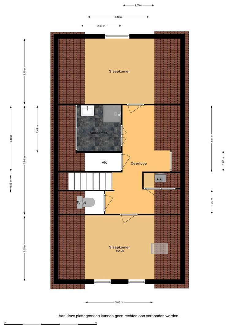 De eerste verdieping is vergroot door middel van twee dakkapellen. Er zijn twee slaapkamers, waarvan één met een bedstede, een aparte toiletruimte en de badkamer. Deze is volledig betegeld en heeft een douche en een wastafel. Ook hier is de vloer afgewerkt met vloerverwarming. Op de vloer liggen hippe, roze tegels.