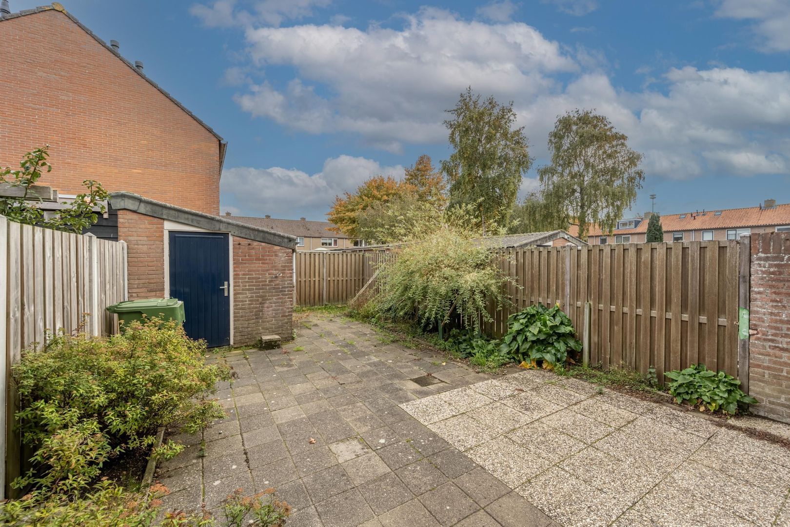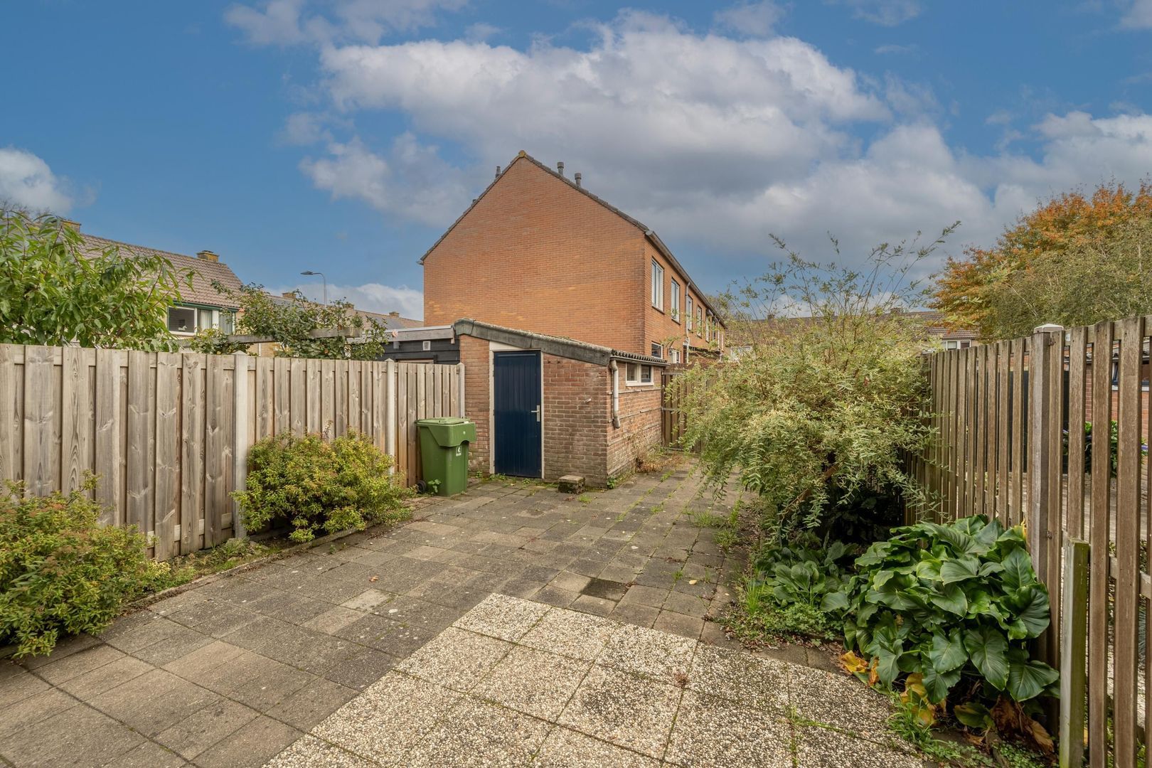 De achtertuin ligt op het zuidoosten. Achterin de tuin staat een stenen berging.