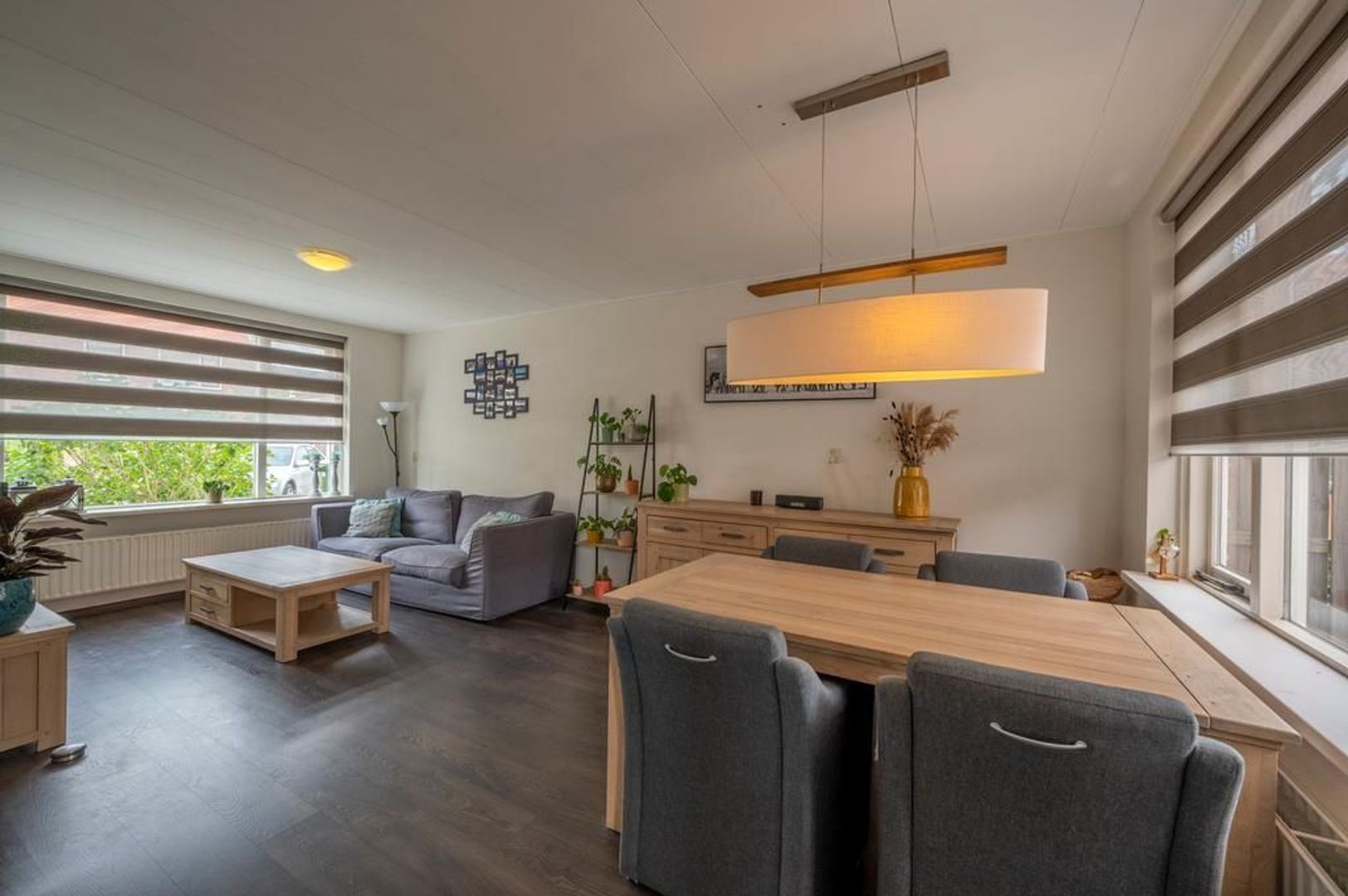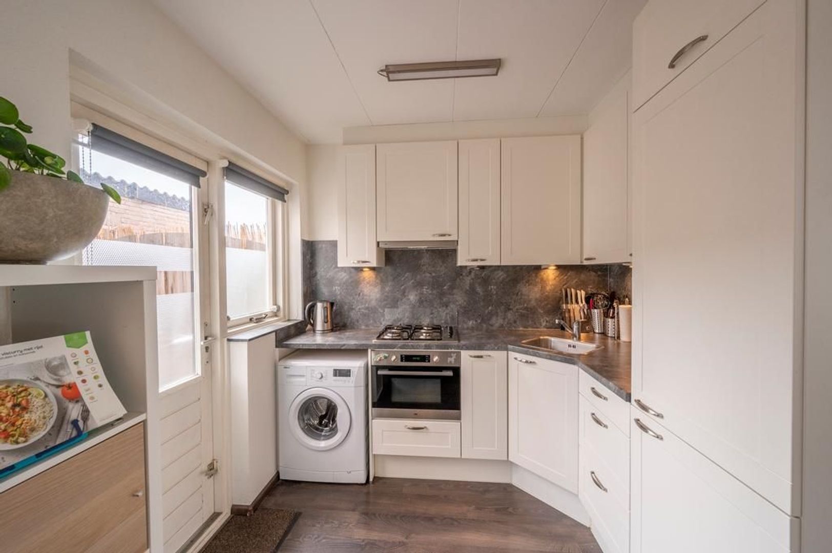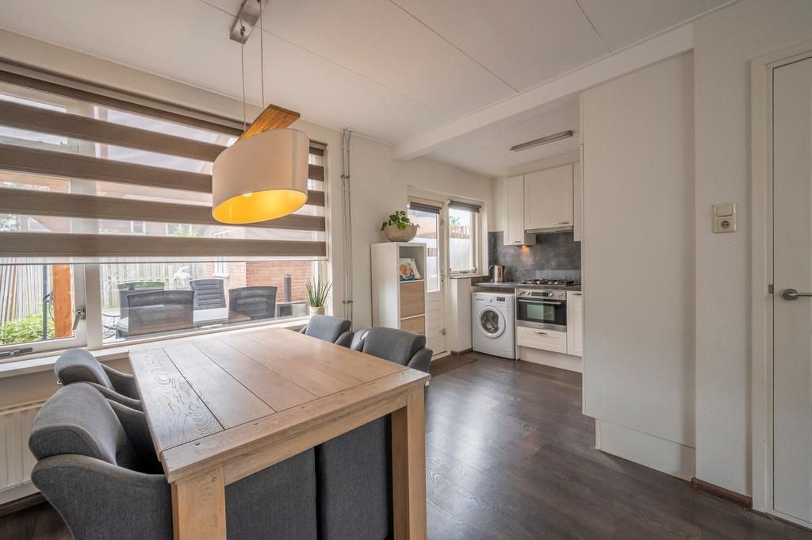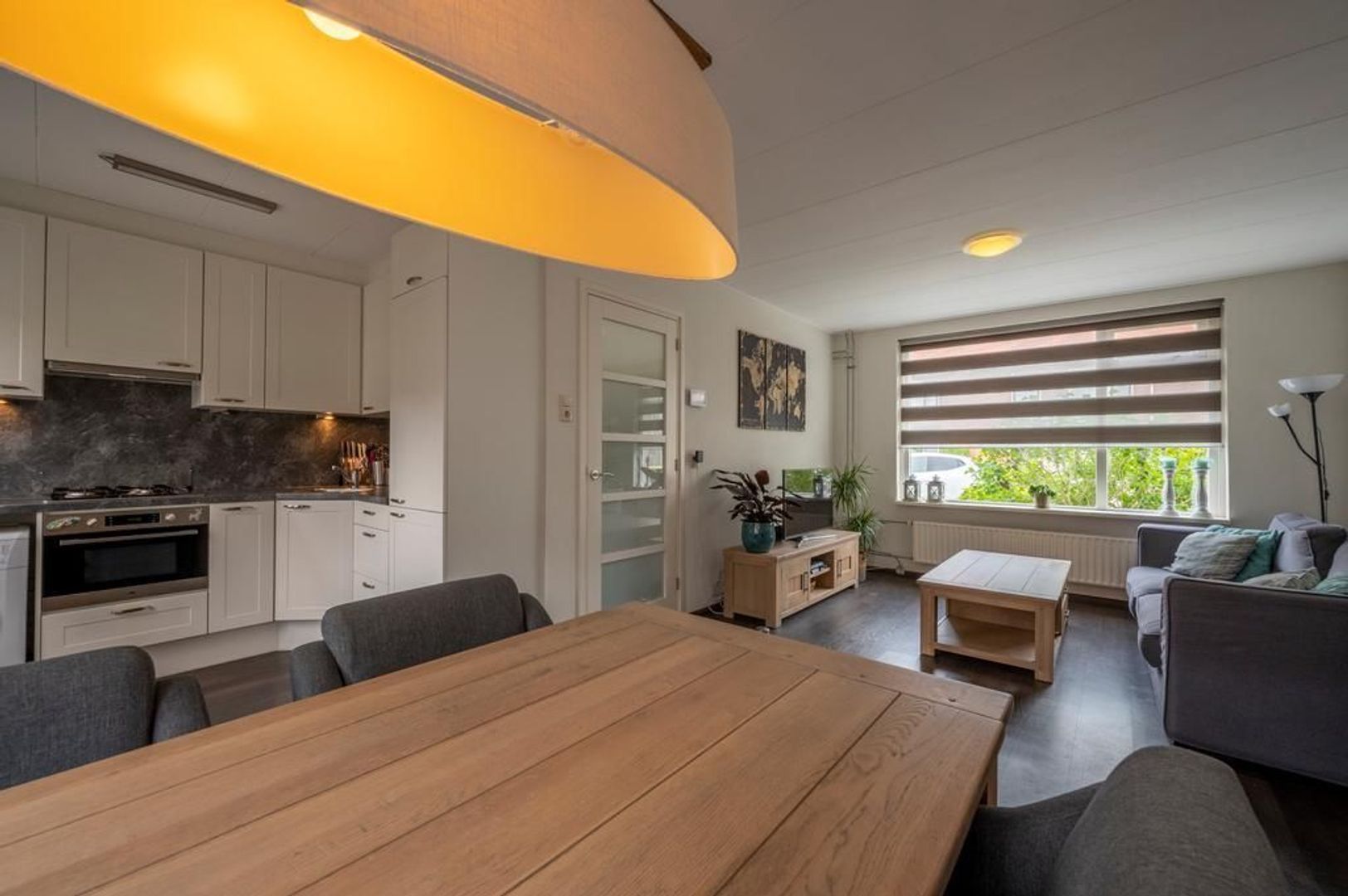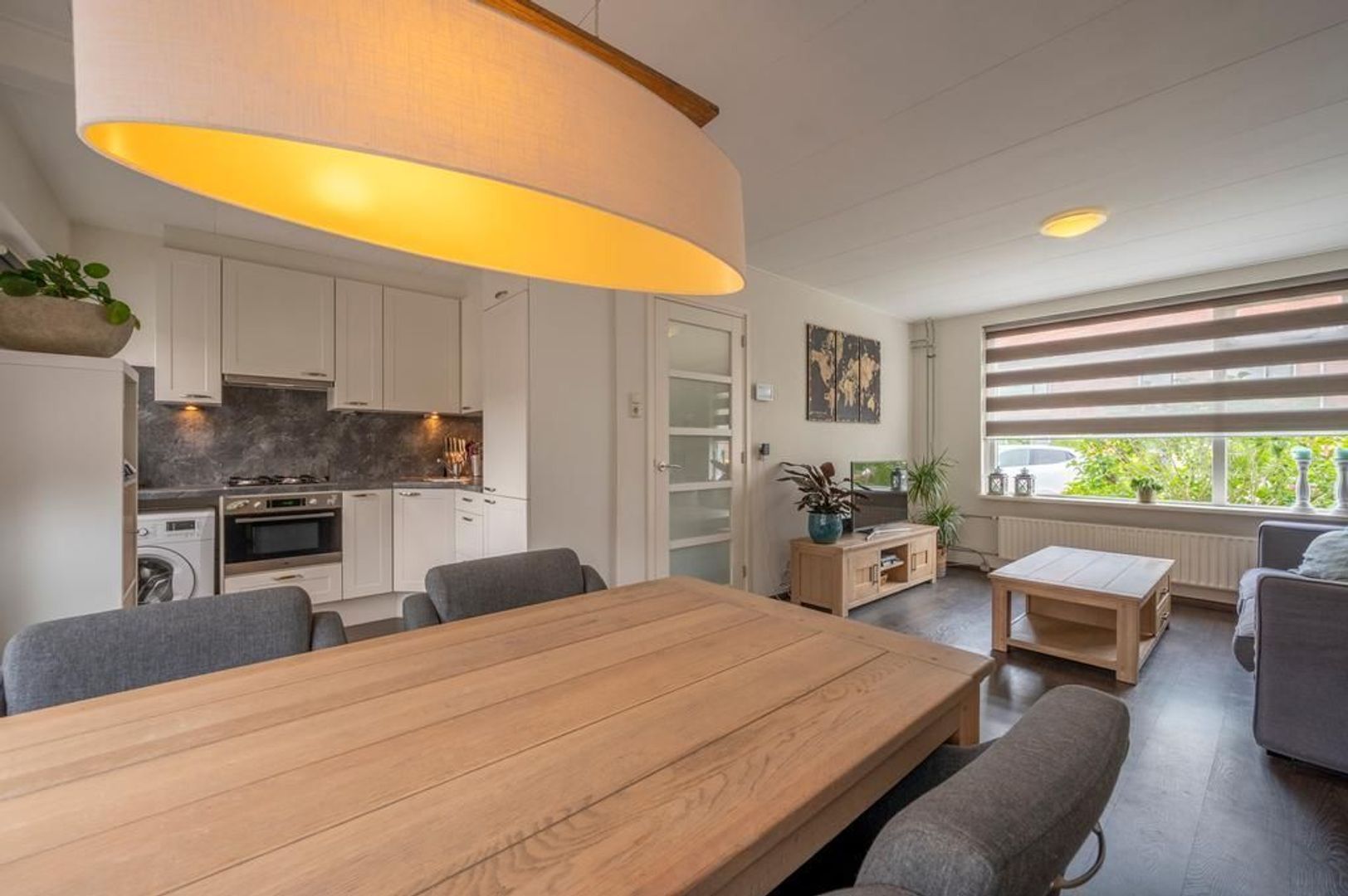 Lichte doorzon woonkamer met open keuken aan de tuinkant. Deze is in 2018 geplaatst en is uitgevoerd met een gaskookplaat, afzuigkap, koel-vriescombinatie, combi-magnetron en de aansluiting voor de wasmachine.