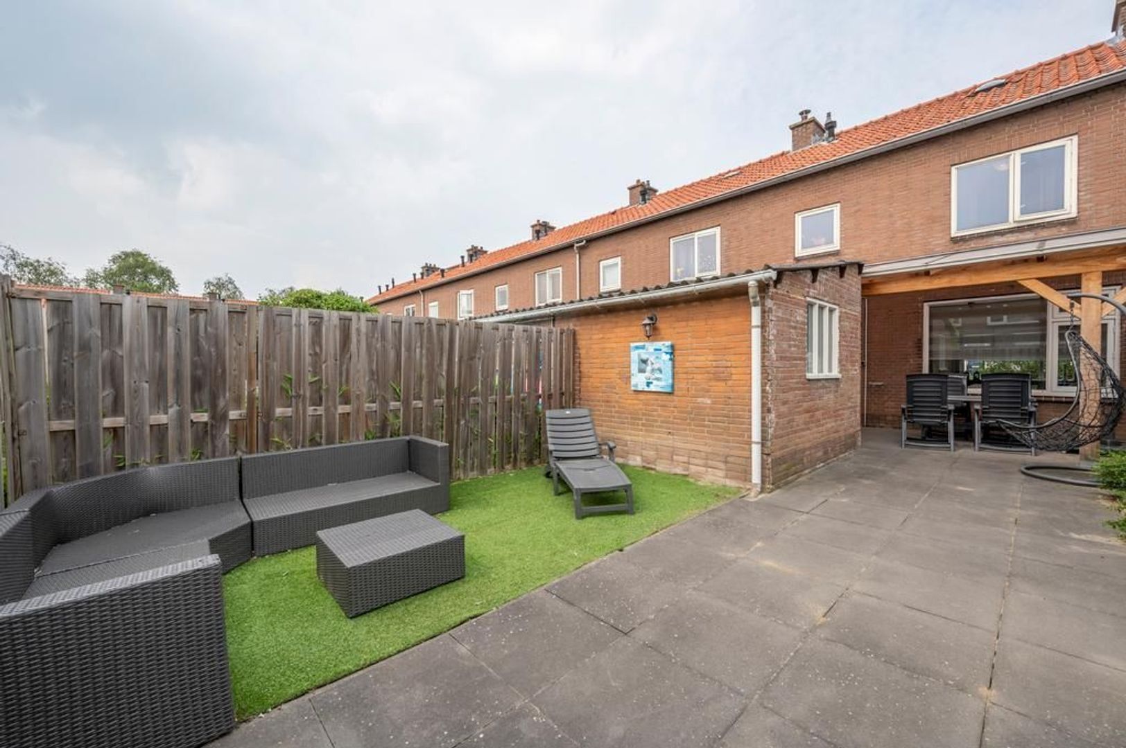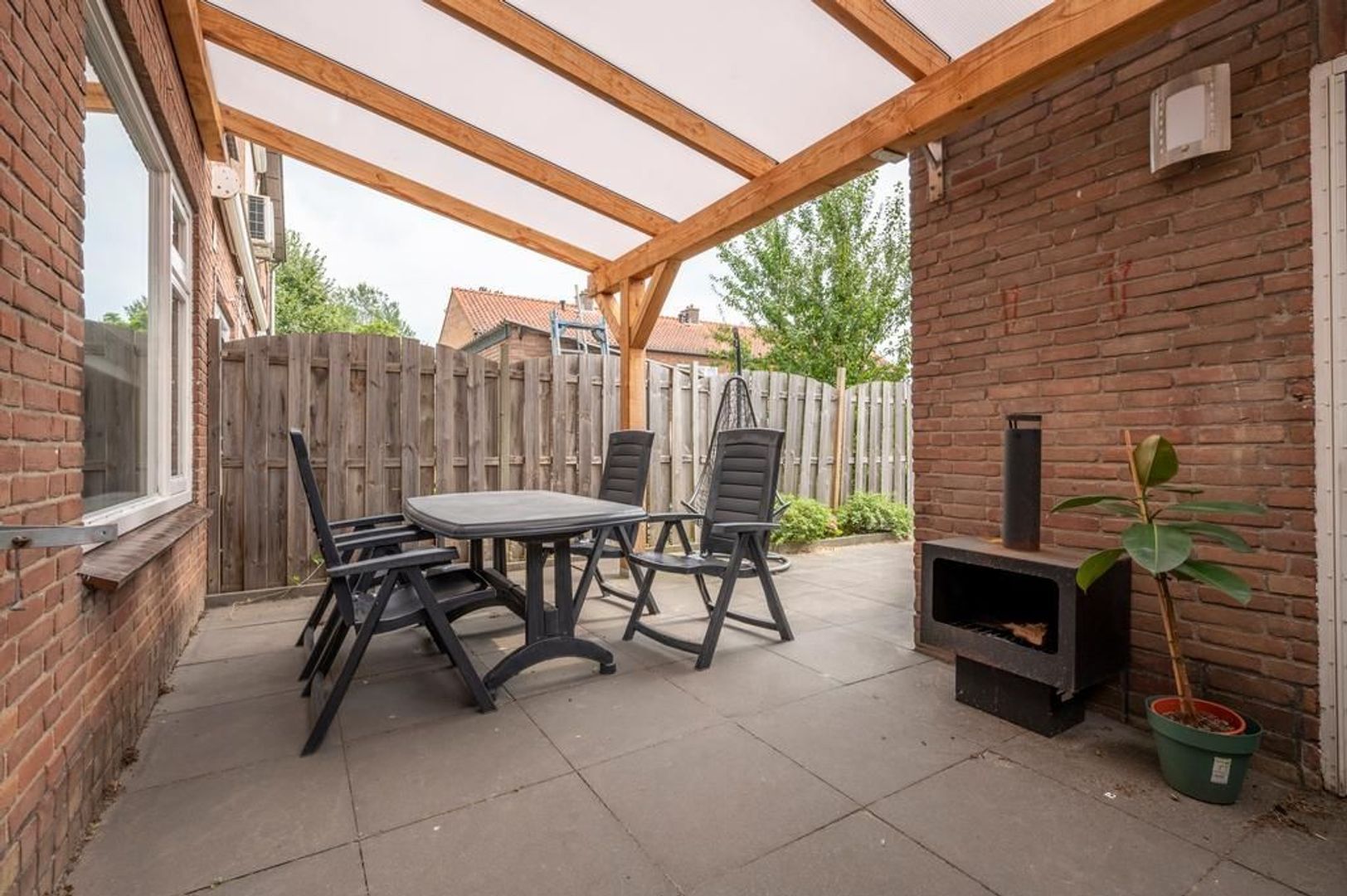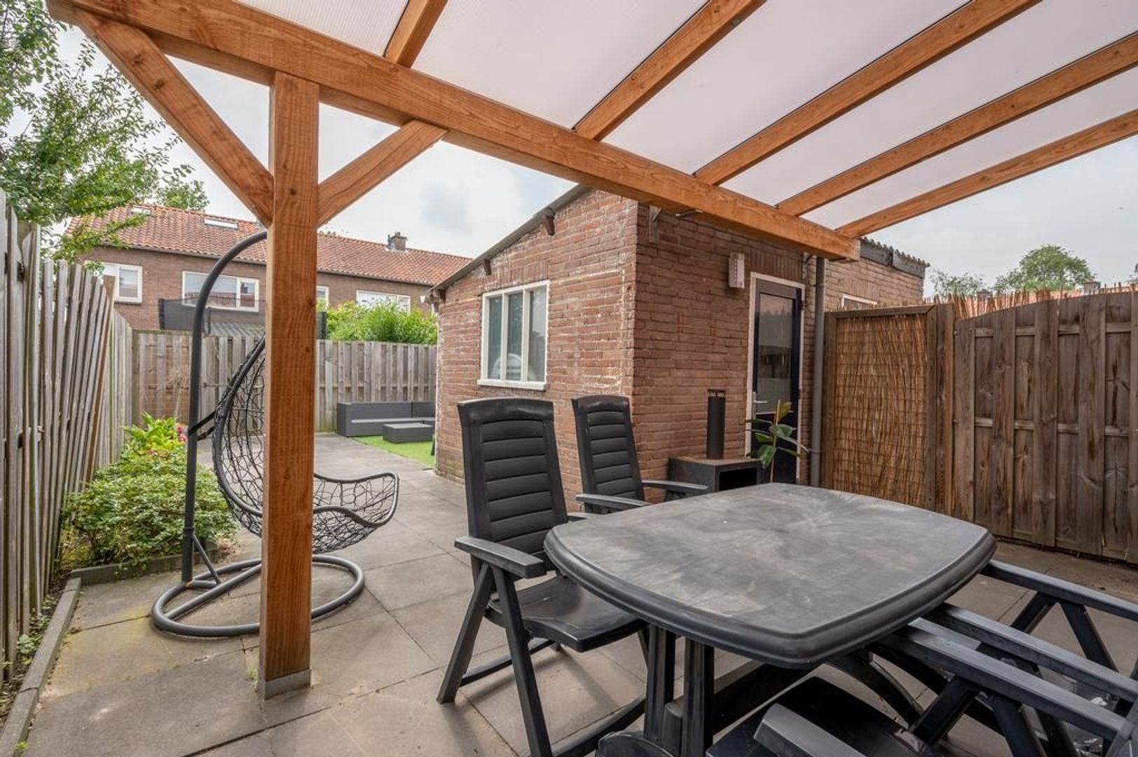 Aan de achtergevel is een gezellige overkapping gebouwd.