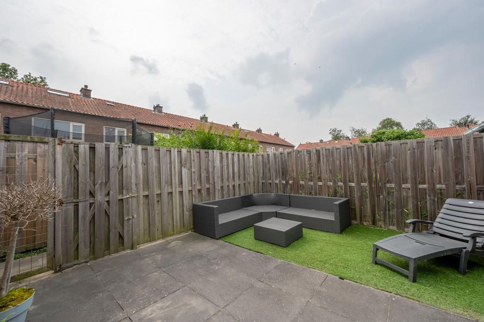 De tuin ligt op het zuiden. Hierin staat een stenen berging.