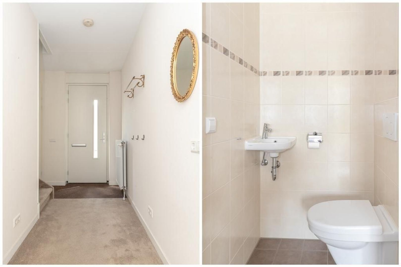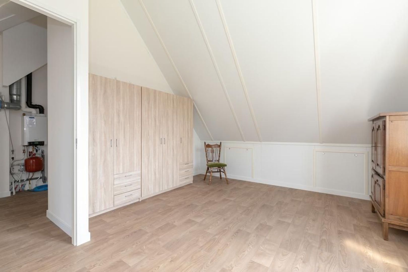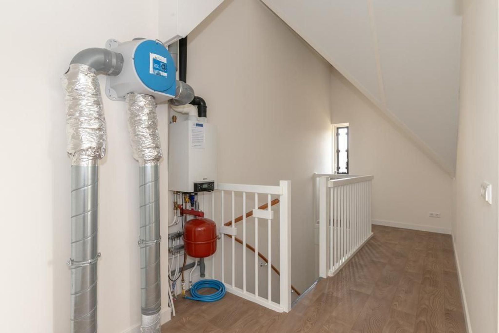 Op de overloop hangt de cv-ketel en zijn (ook) aansluitingen voor de wasmachine- en droger.