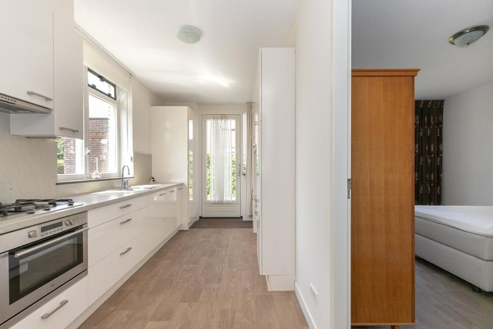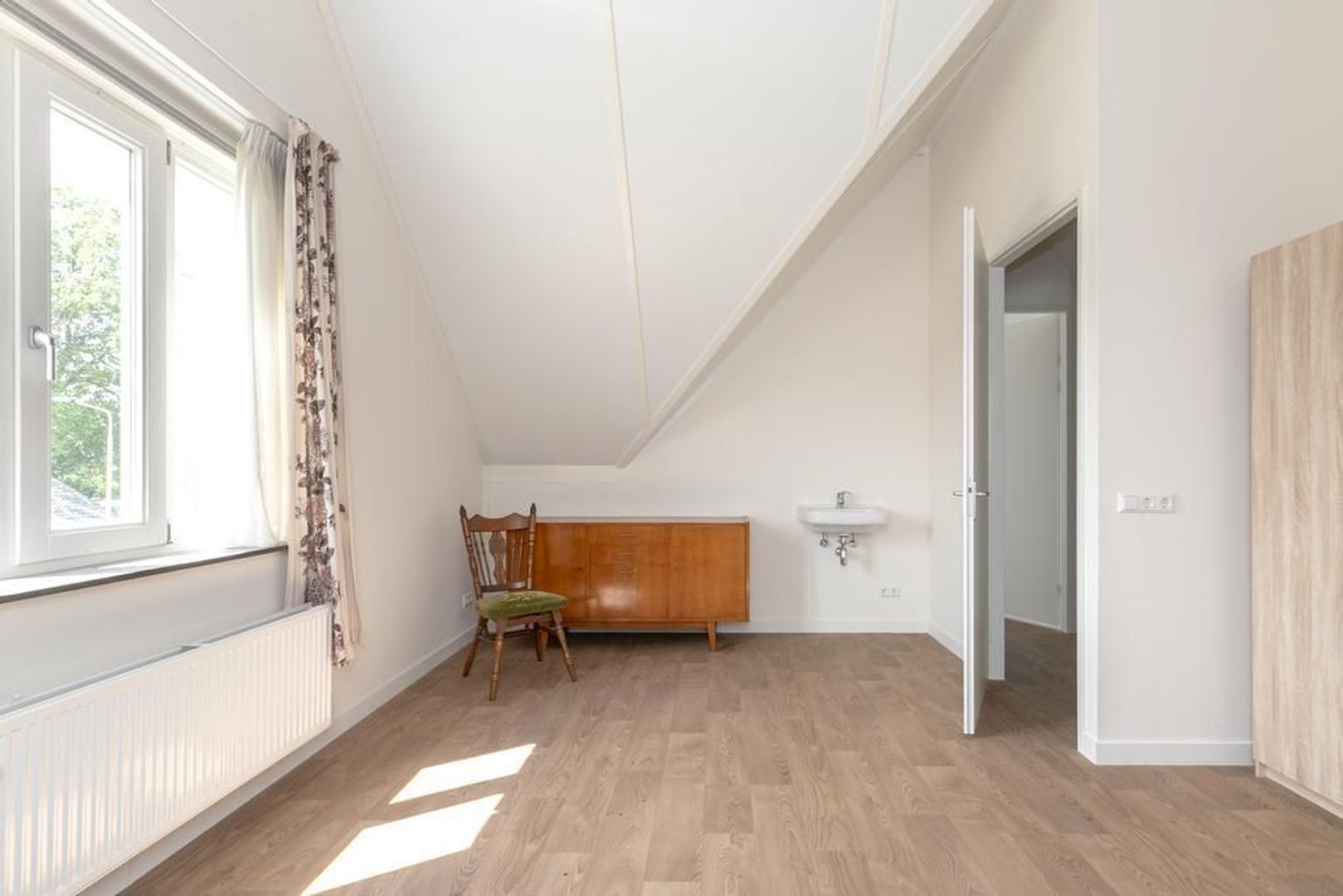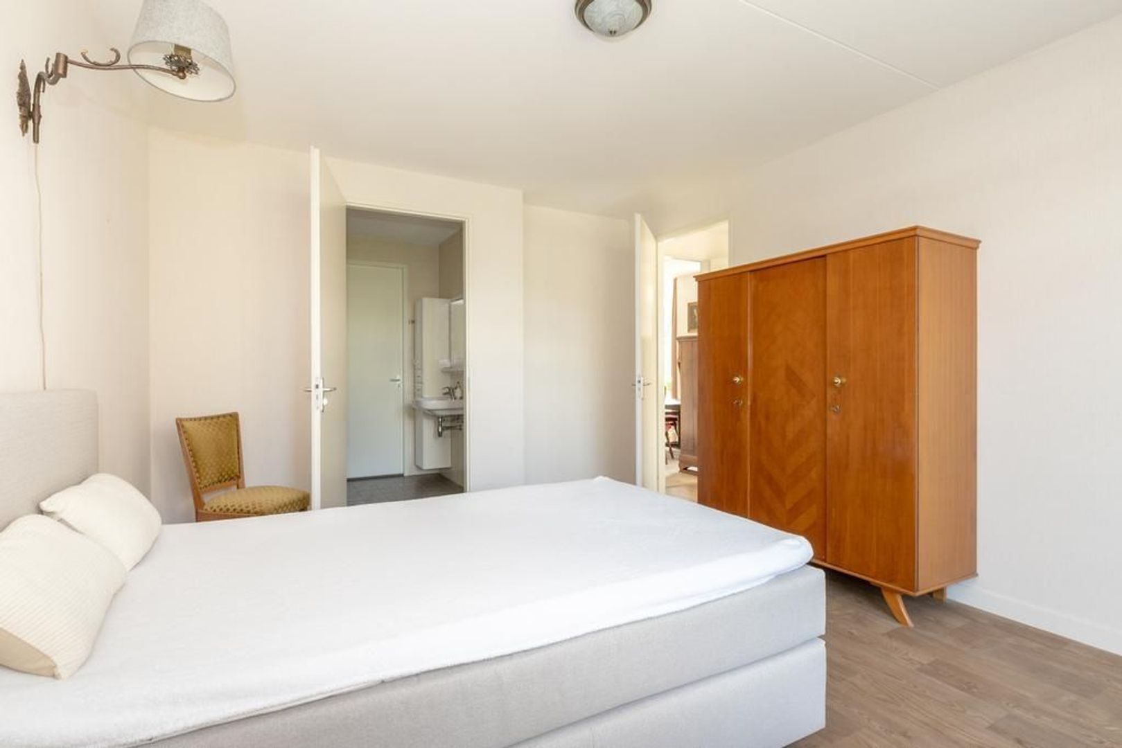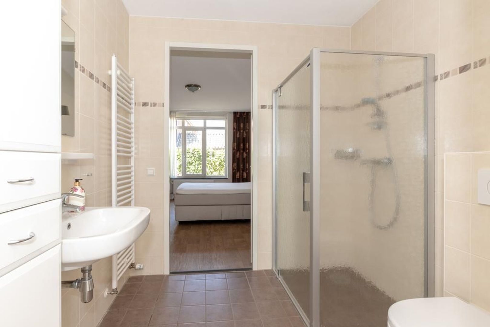 De slaapkamer ligt aan de achterkant van de woning. Deze heeft een deur naar de badkamer, die is ingericht met een tweede toilet, een douchecabine, een wastafel en een design radiator. De wanden zijn volledig betegeld.
