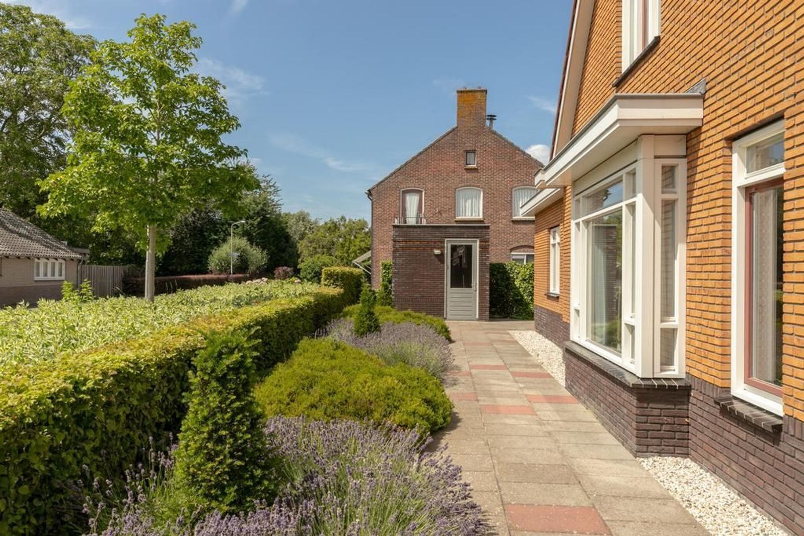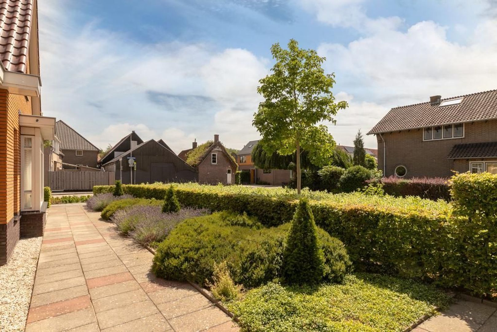 De tuin is netjes aangelegd en onderhouden. Achterop het perceel staat een stenen berging.