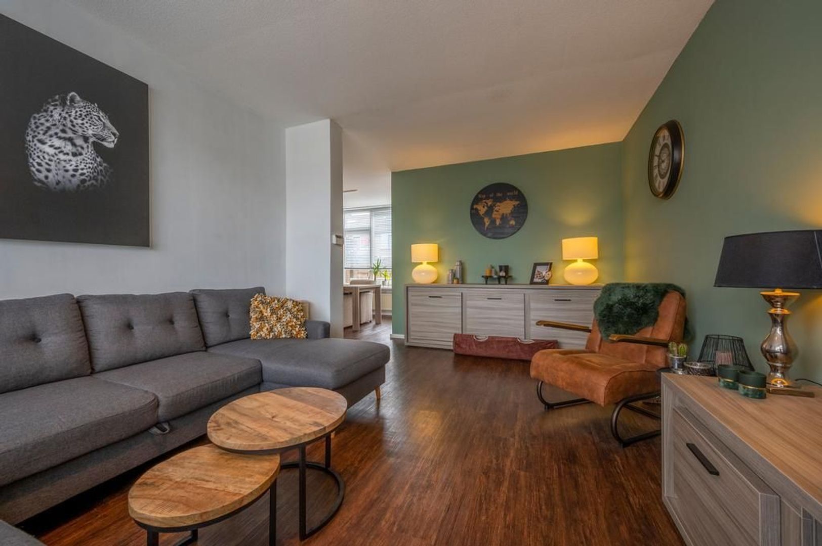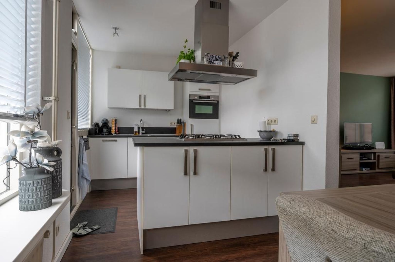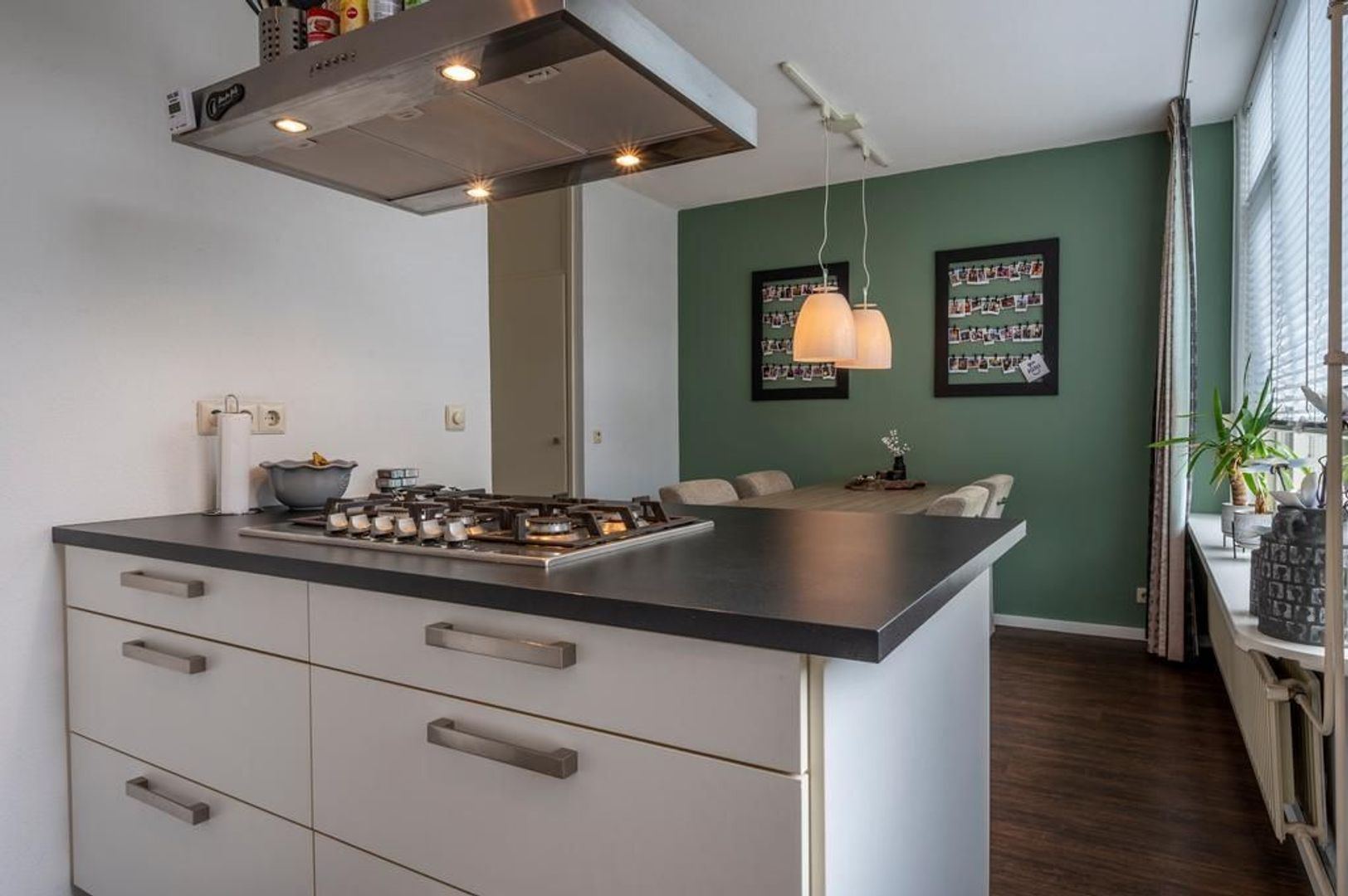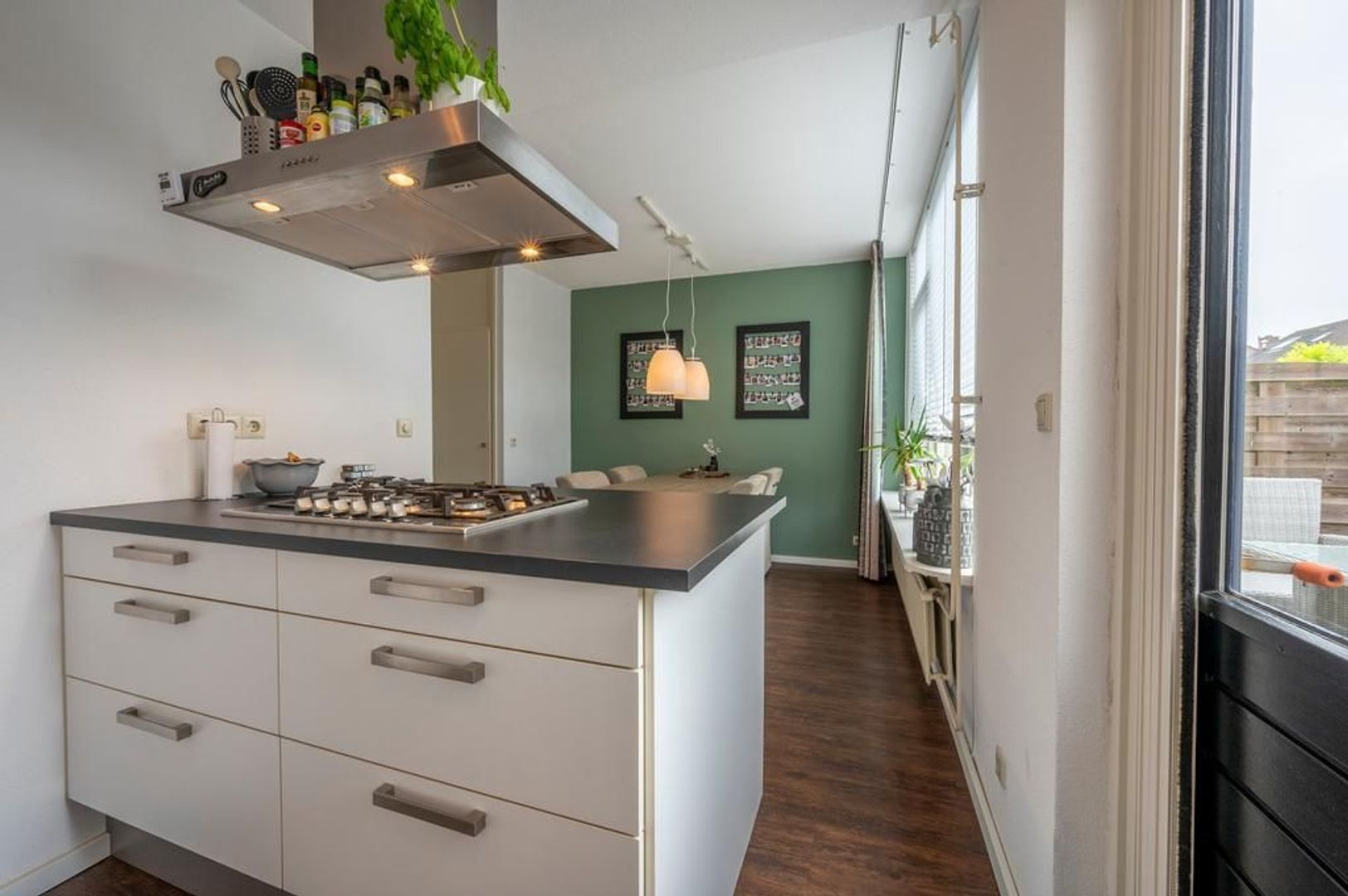 Mooie Z-vormige woonkamer met open keuken aan de tuinkant. Deze heeft een wandopstelling met een kookeiland en is uitgevoerd met complete inbouwapparatuur.