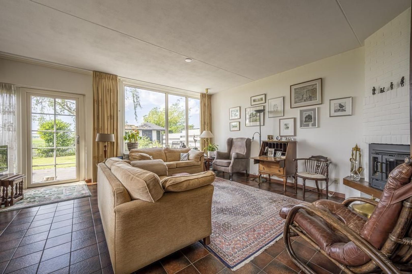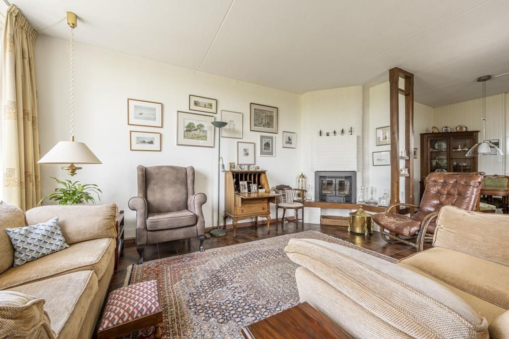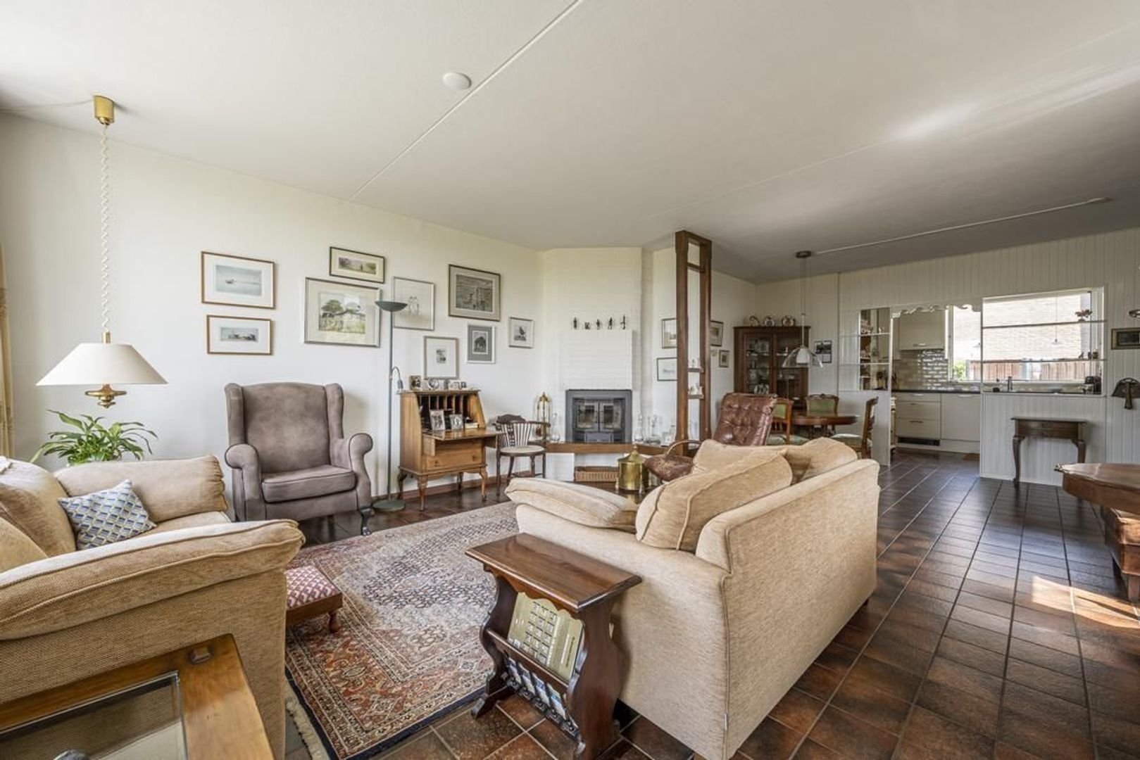 Tuingerichte woonkamer met openhaard en deur naar buiten.