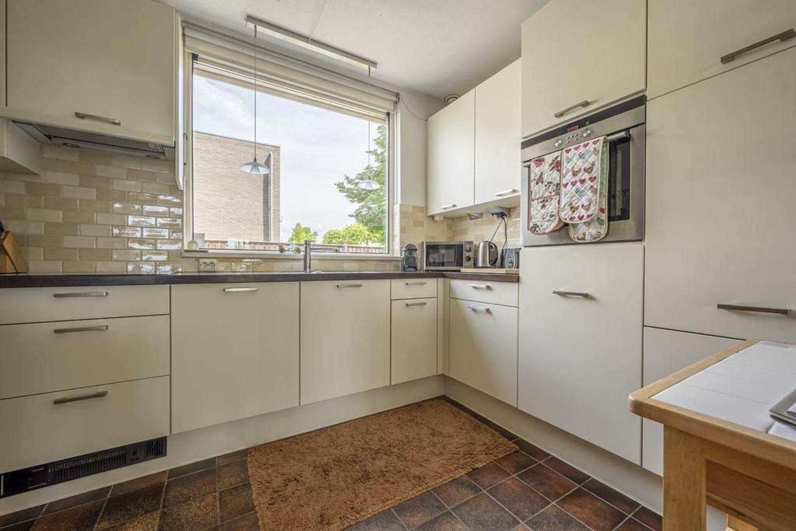 De open keuken bevindt zich aan de voorkant. Deze heeft een hoekinrichting met een composiet aanrechtblad en is uitgevoerd met een inductiekookplaat, afzuigkap, oven, koelkast, vaatwasser.