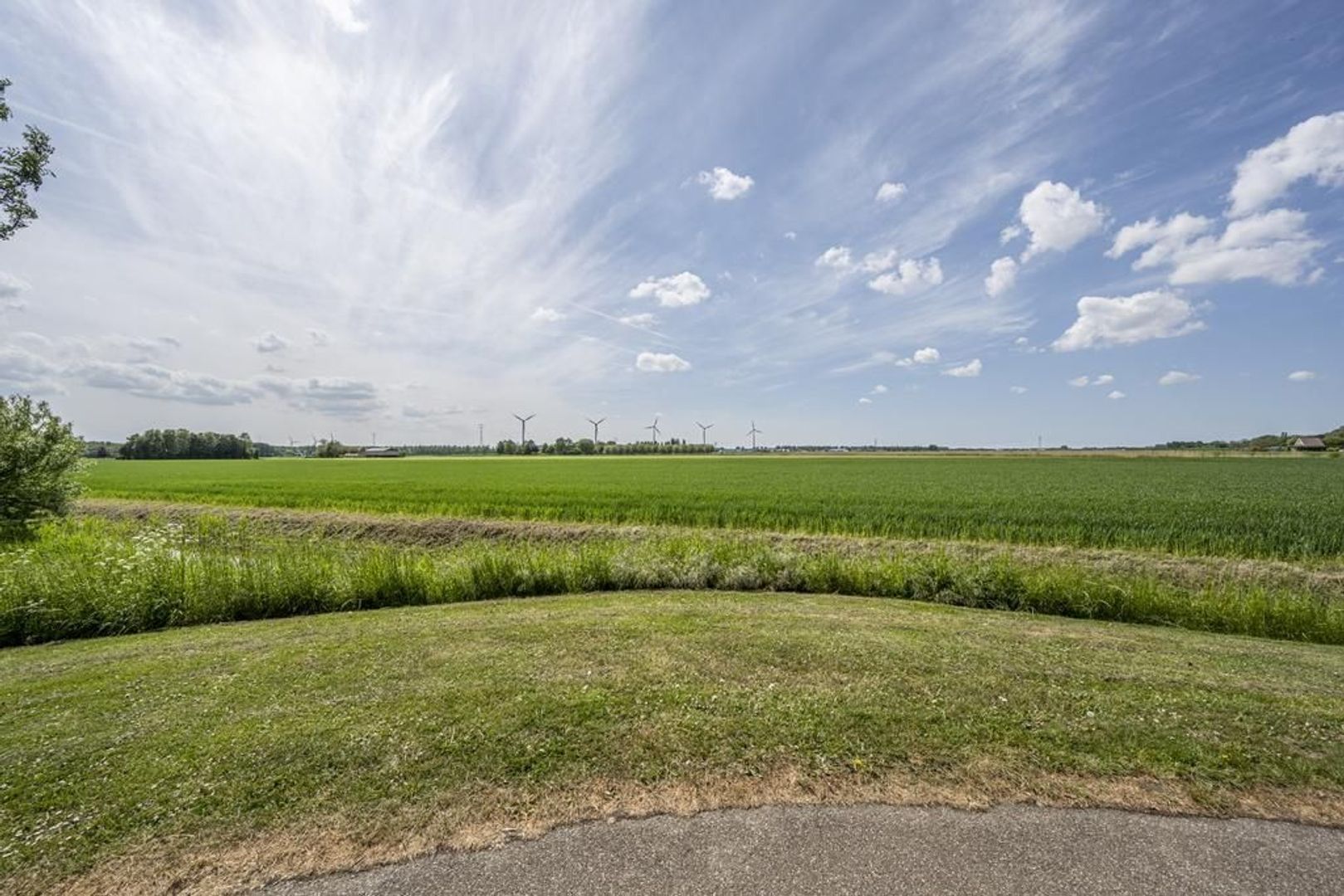 Aan de buitengevel zijn diverse rolluiken, screens en een zonnescherm aangebracht.
