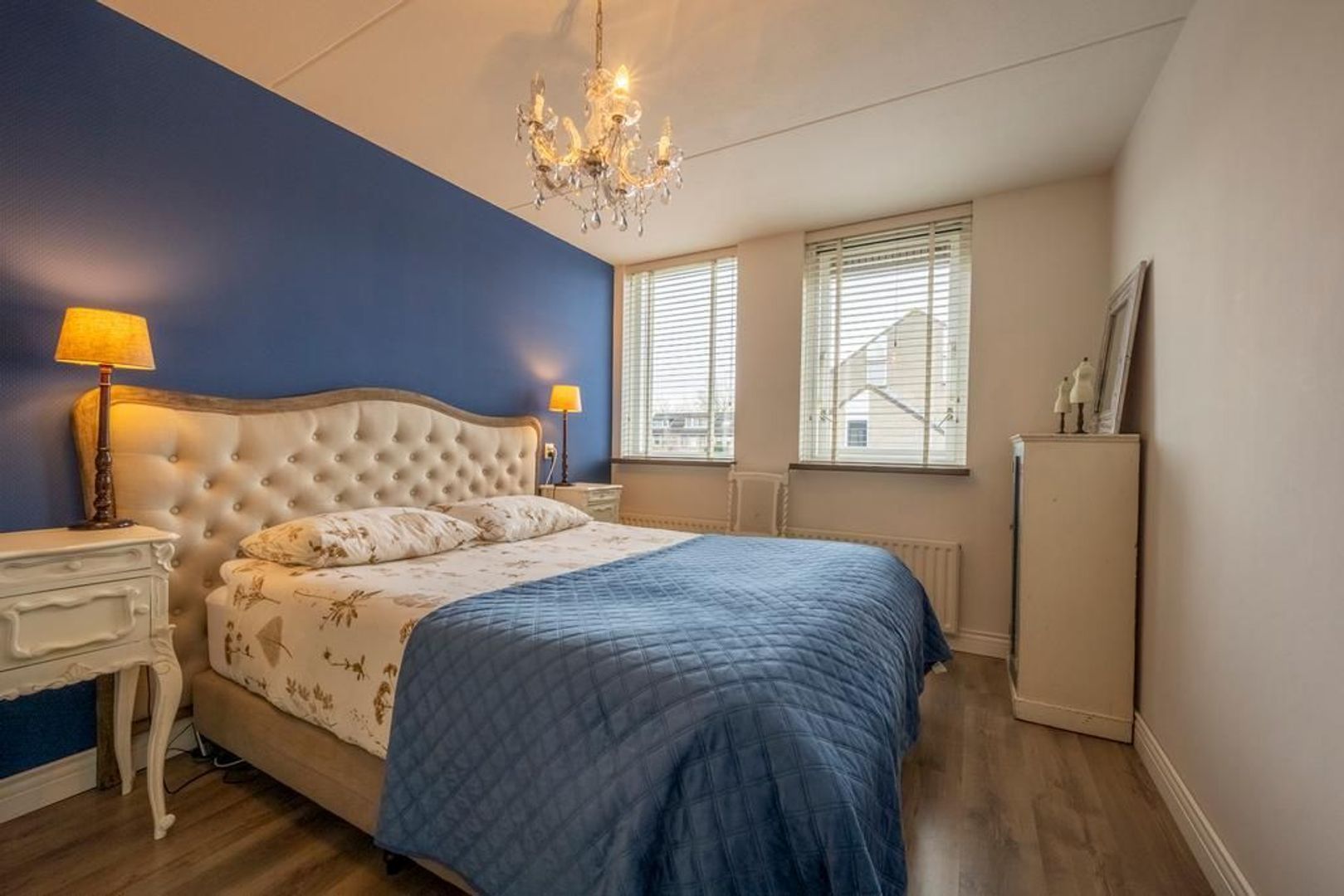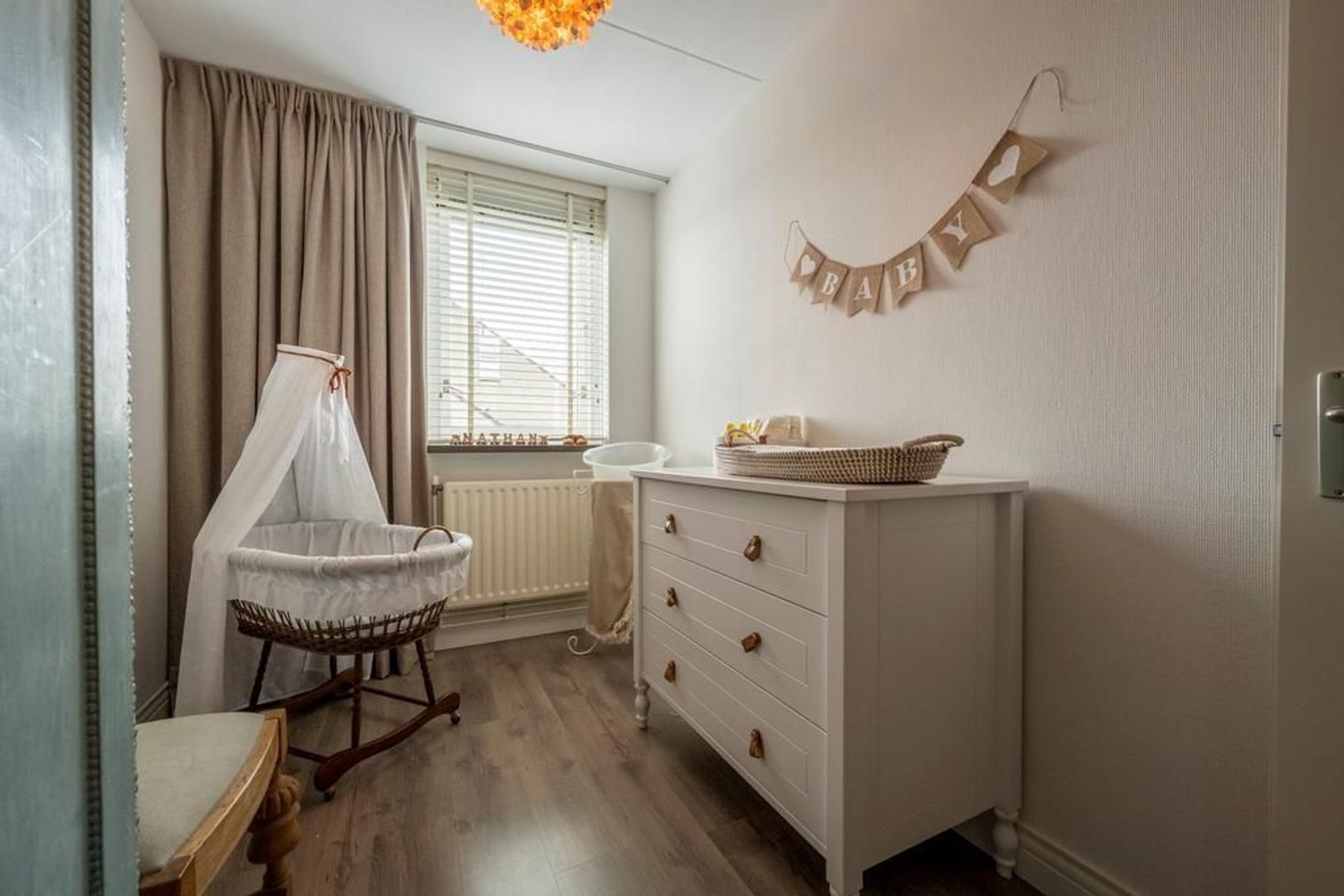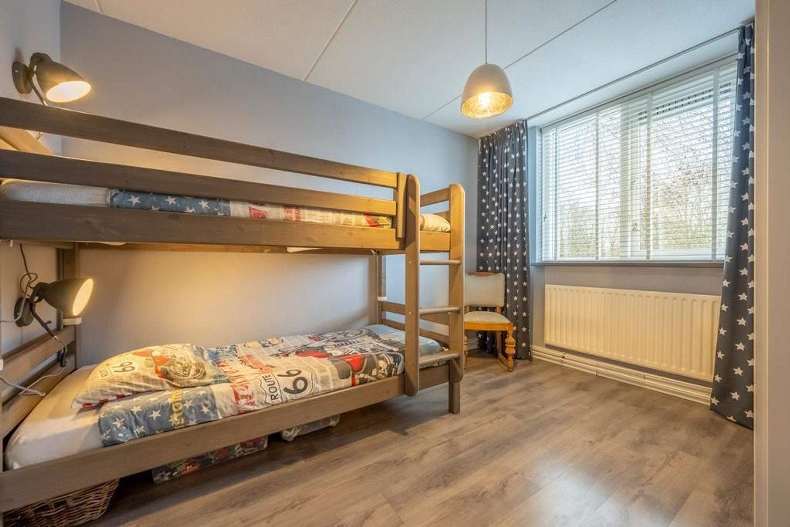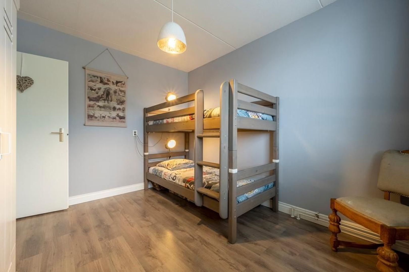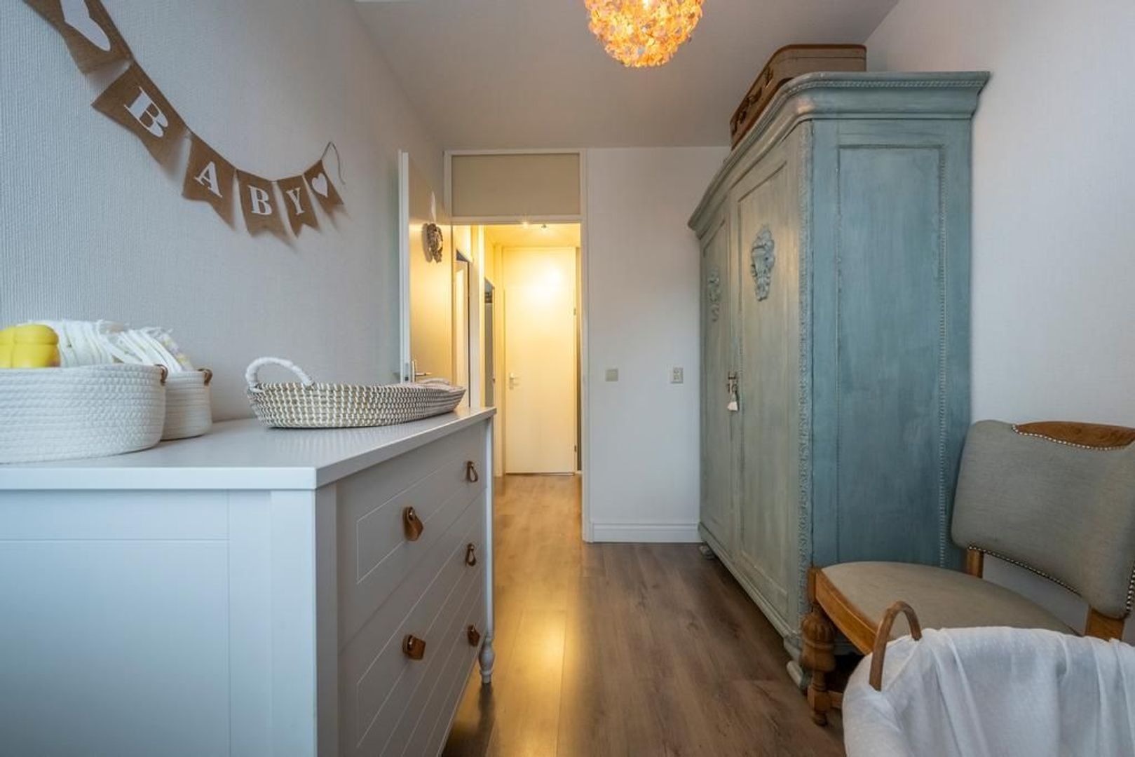 De vloer is afgewerkt met een eigentijdse laminaatvloer, de wanden met glasvezelbehang.
