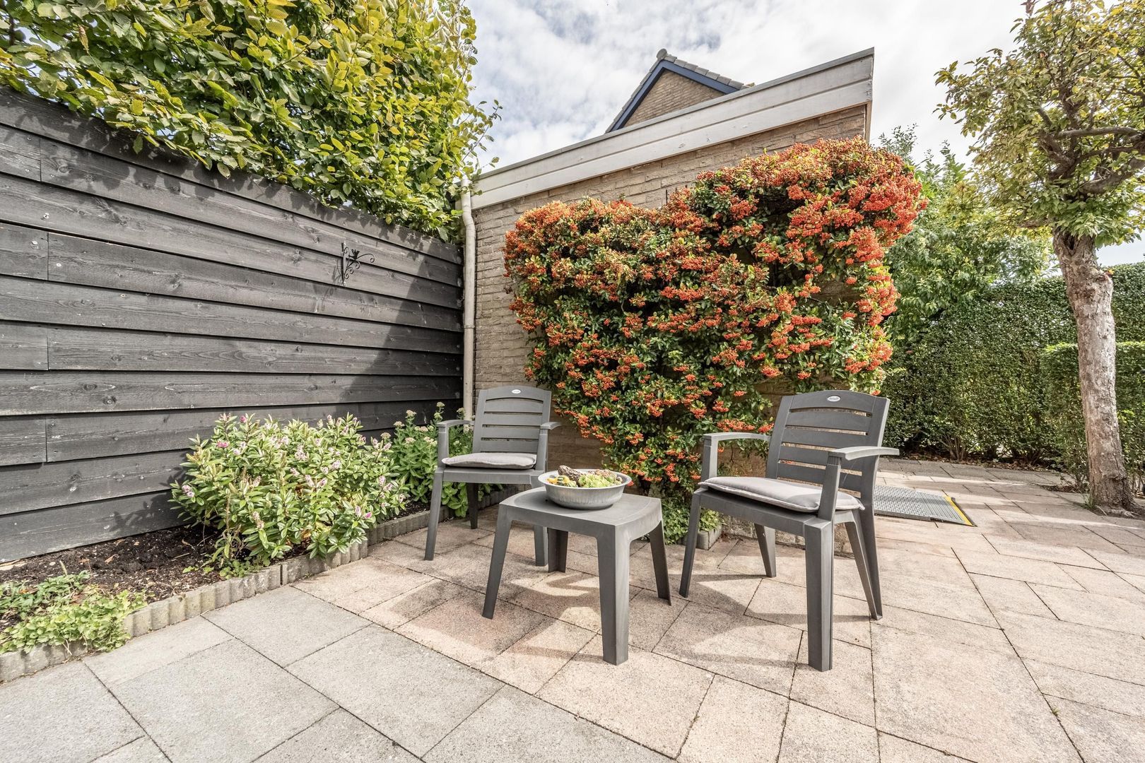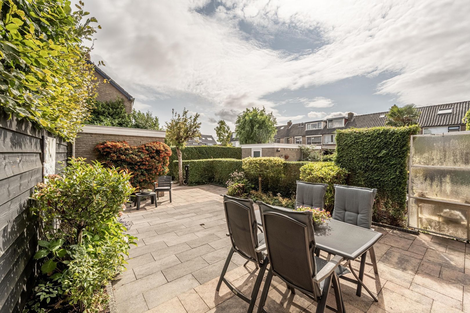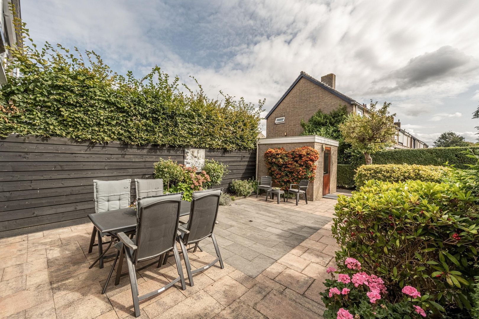 De achtertuin ligt op het oosten. Deze is onderhoudsvriendelijk aangelegd. Achterin staat een stenen berging.