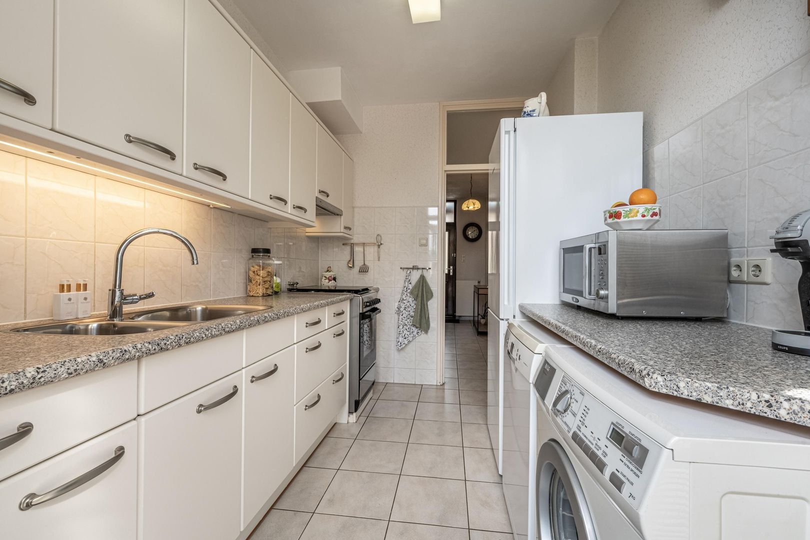 De dichte keuken heeft een wandopgestelde inrichting in een neutrale kleurstelling en is uitgevoerd met losse- en inbouwapparatuur. Ook is er een aansluiting voor de wasmachine.