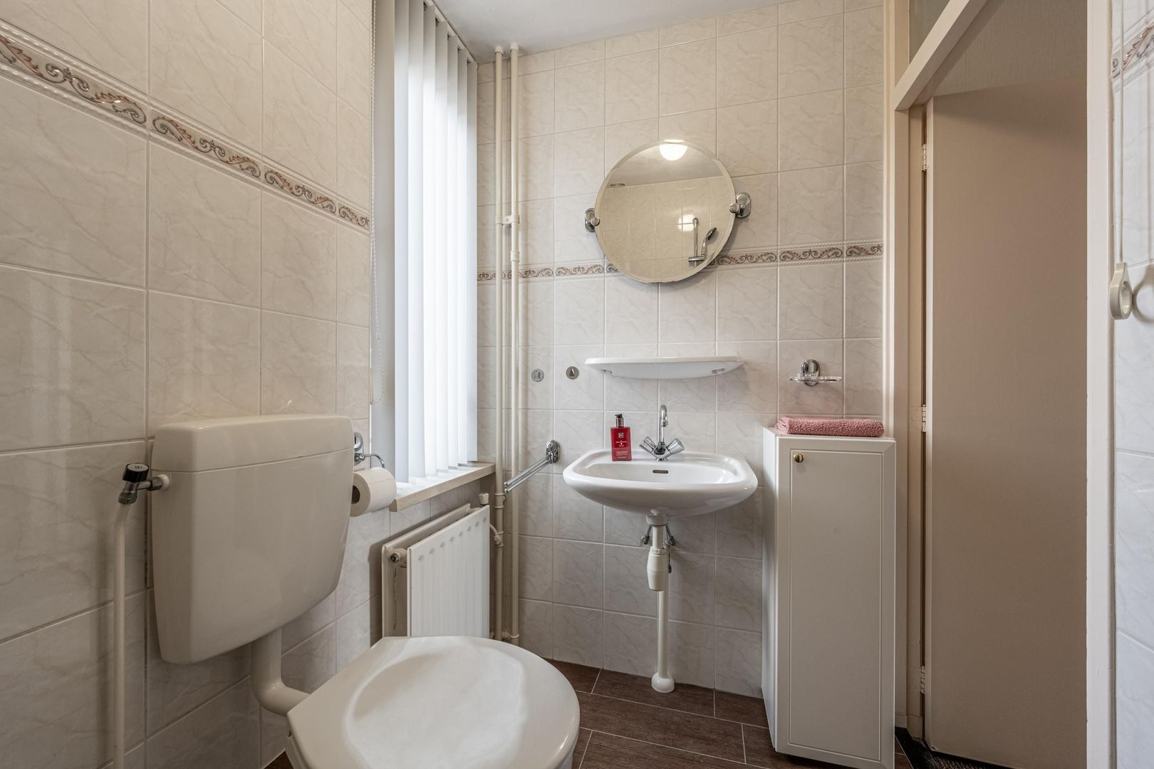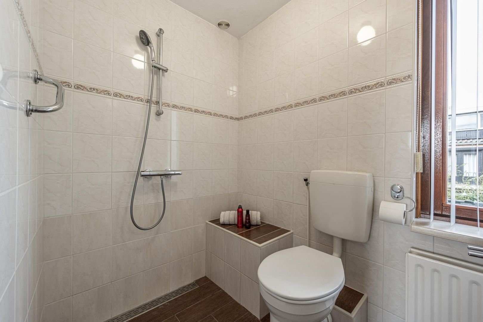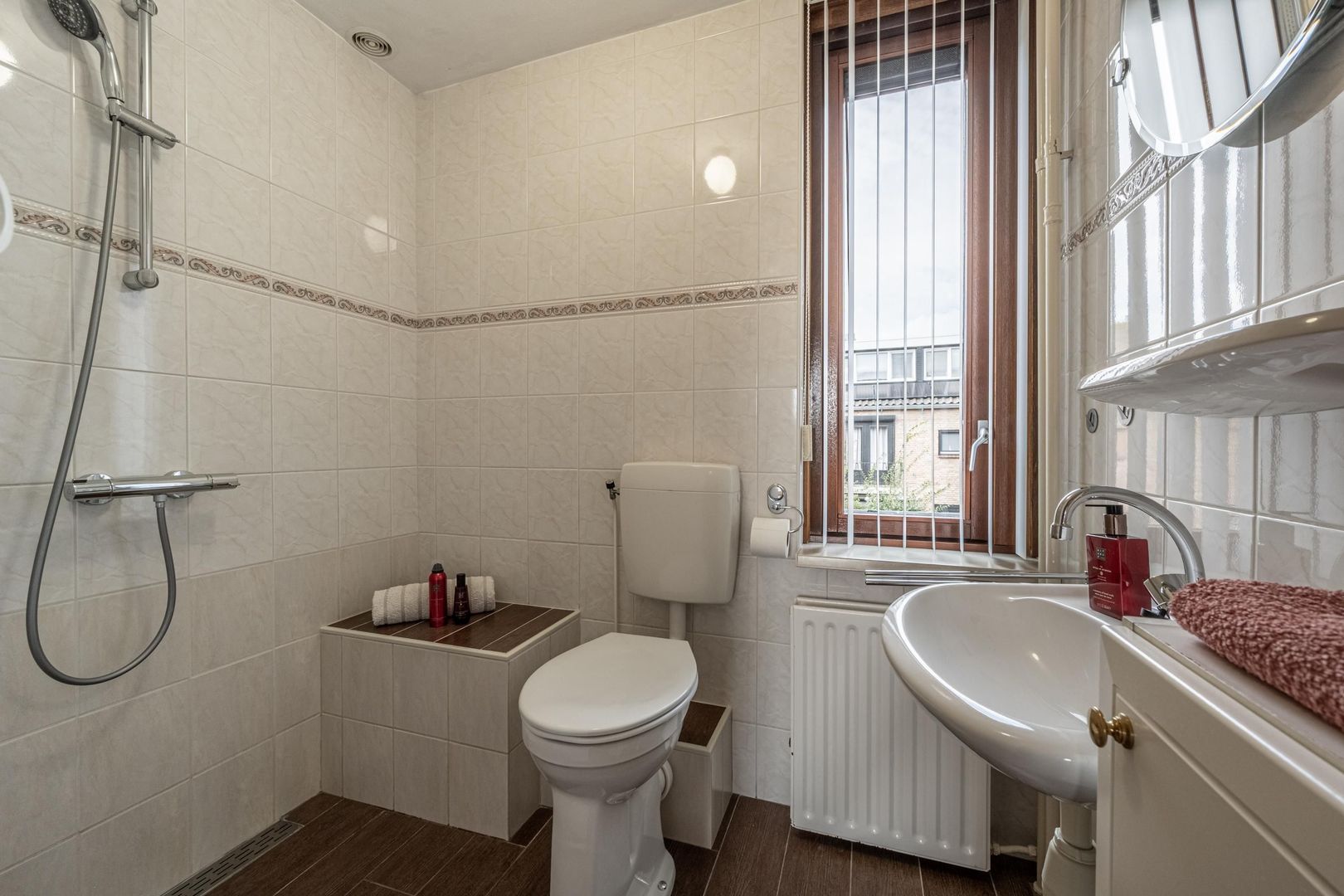 Op de eerste verdieping zijn drie slaapkamers en een nette badkamer. Deze heeft een inloopdouche, een tweede toilet en een wastafel. Het raam maakt ventileren met frisse buitenlucht mogelijk.