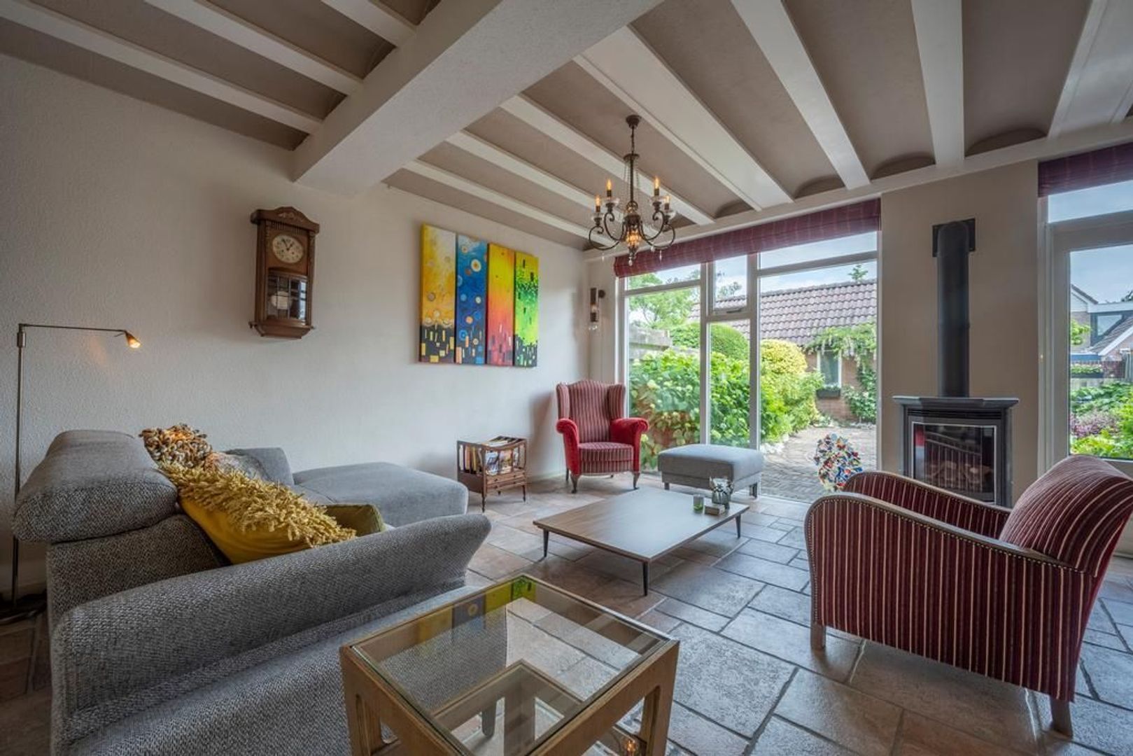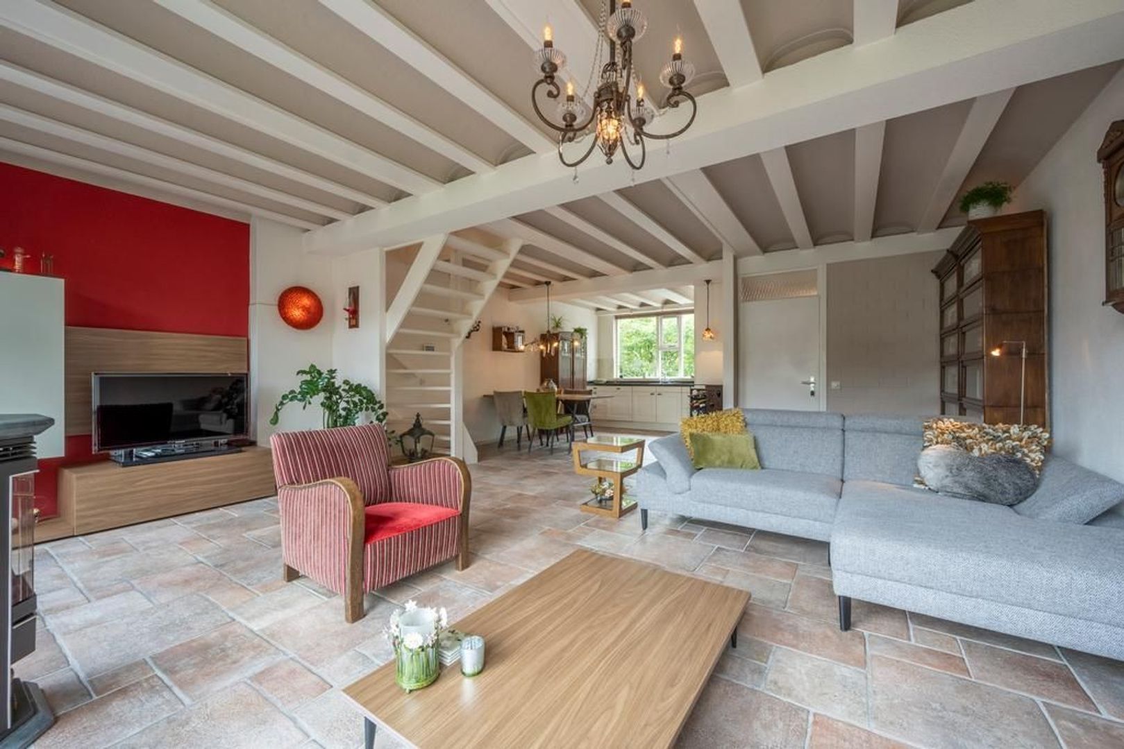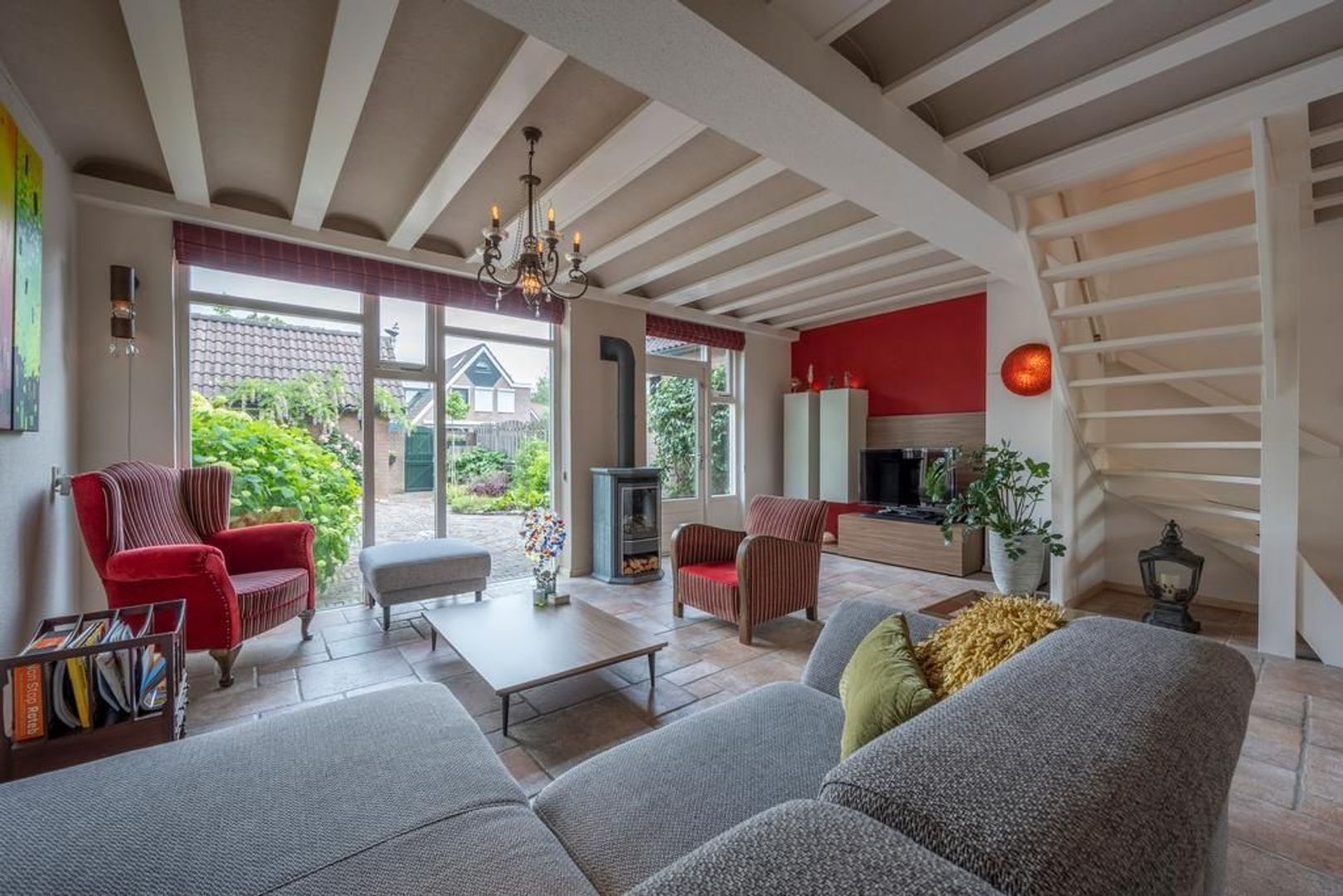 Gezellige tuingerichte woonkamer met balken plafond, gashaard en trapopgang.