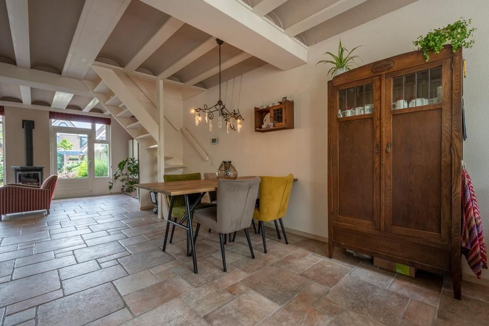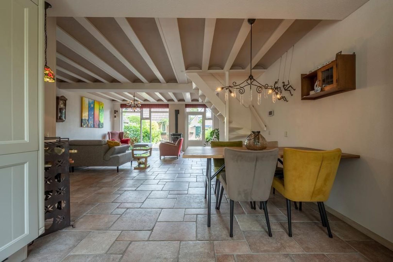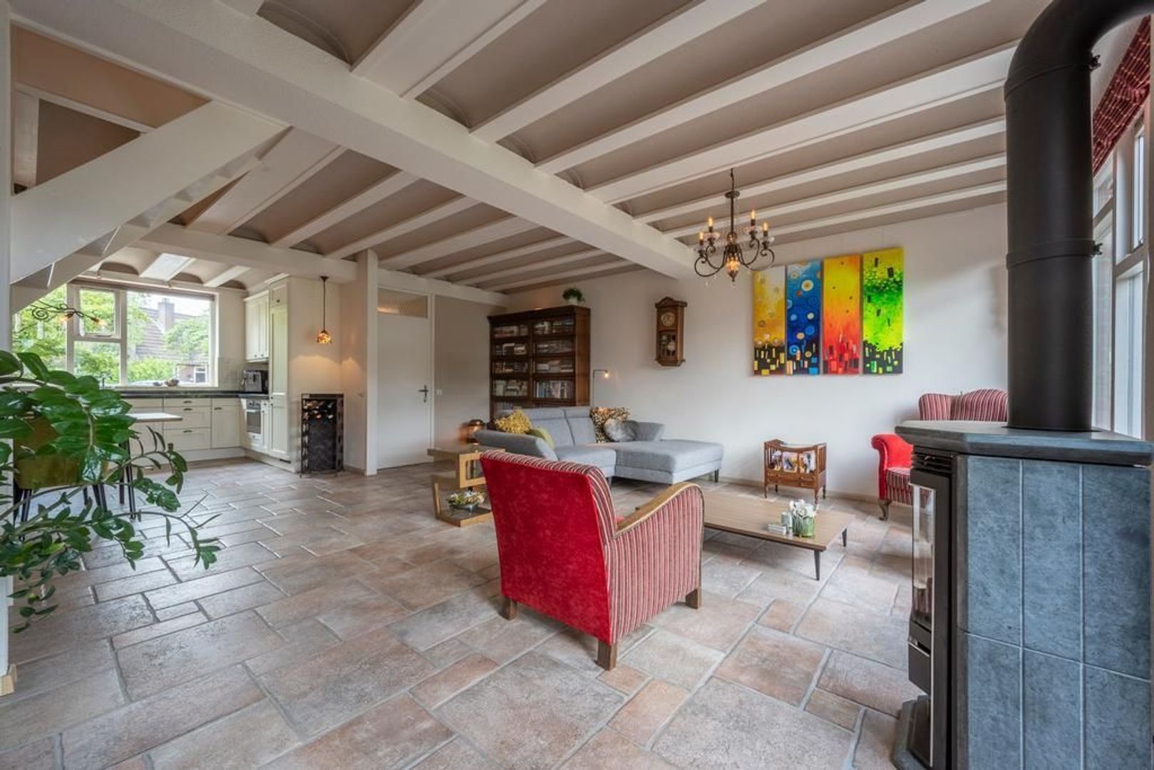 Gezellige tuingerichte woonkamer met balken plafond, gashaard en trapopgang.
